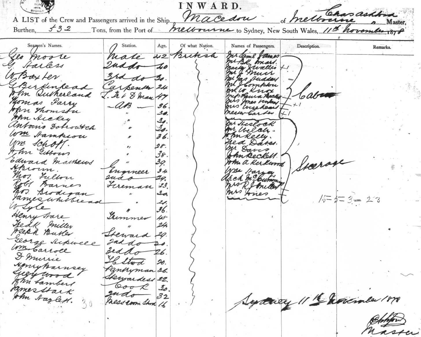 from the Port of MELBOURNE to SYDNEY, New South Wales, 11th Nov. 1878