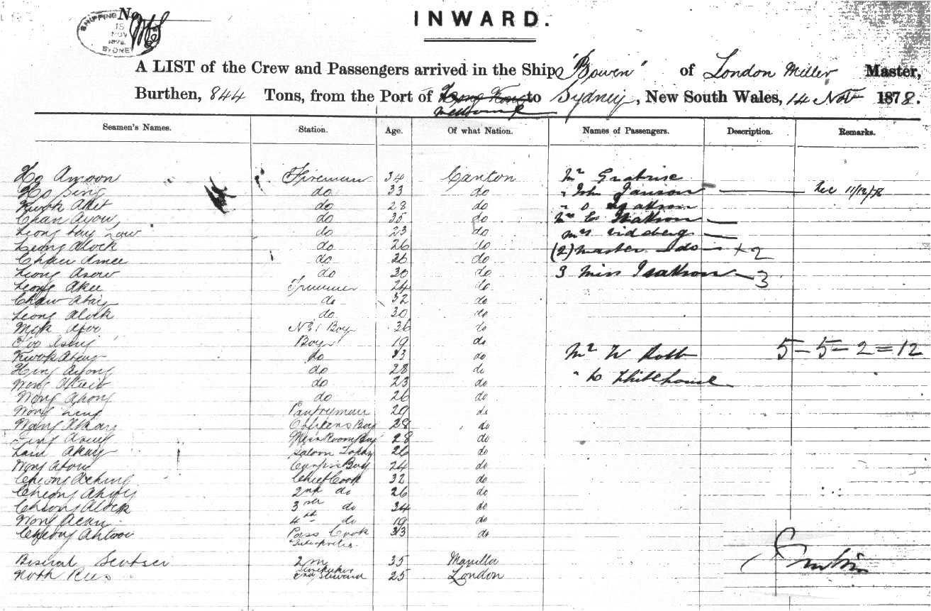 Source: State Records Authority of New South Wales: Shipping Master's Office; CGS 13278, Passengers Arriving 1855 - 1922; X141-142, SR Reel 438, 1878.   Transcribed by Tamea Willcocks, June, 2002.