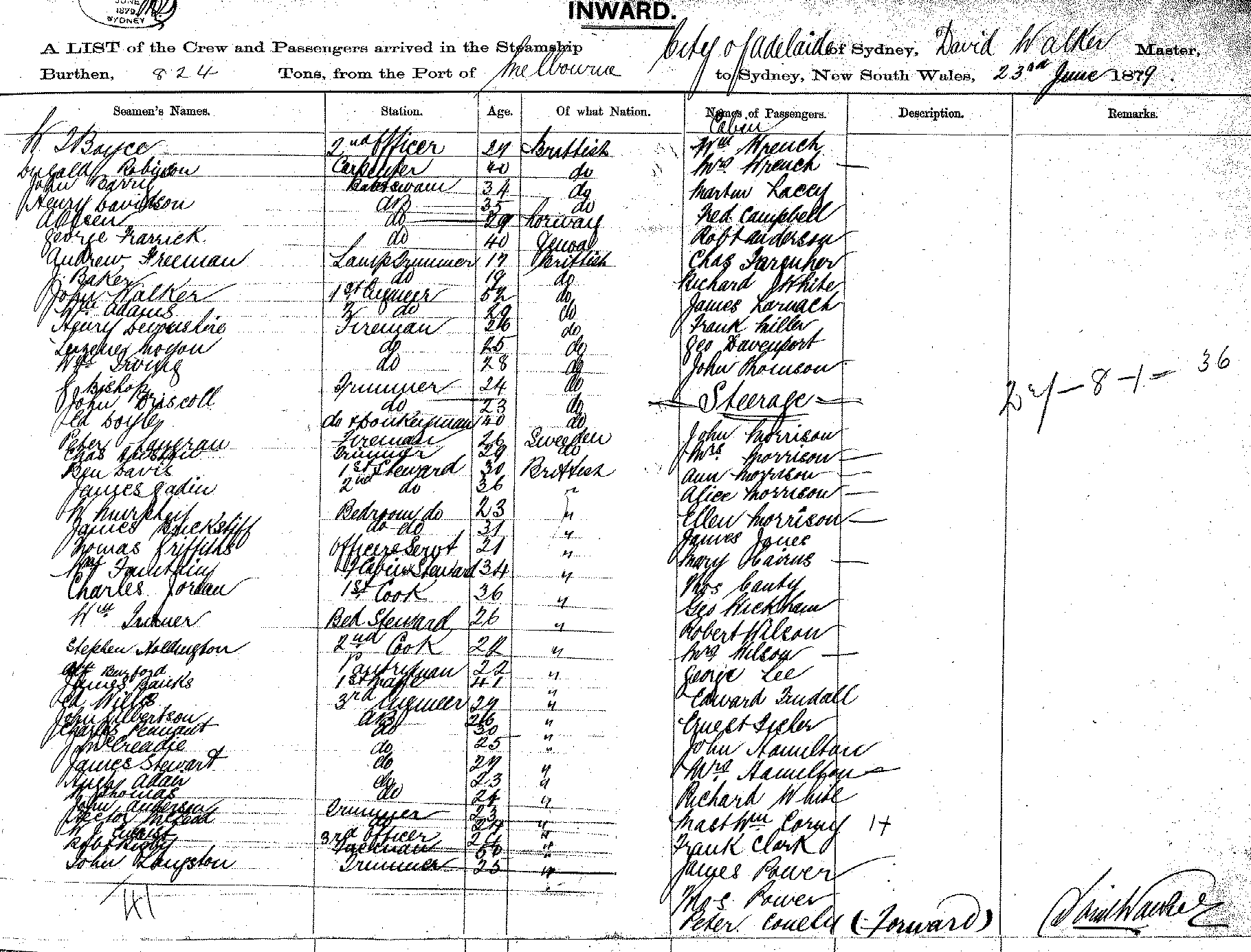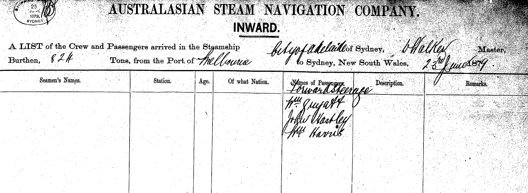 CITY OF ADELAIDEOF SYDNEY, DAVID WALKER, MASTER, BURTHEN 824 TONS FROM THE PORT OF MELBOURNE TO SYDNEY, NEW SOUTH WALES, 23 JUNE 1879 |