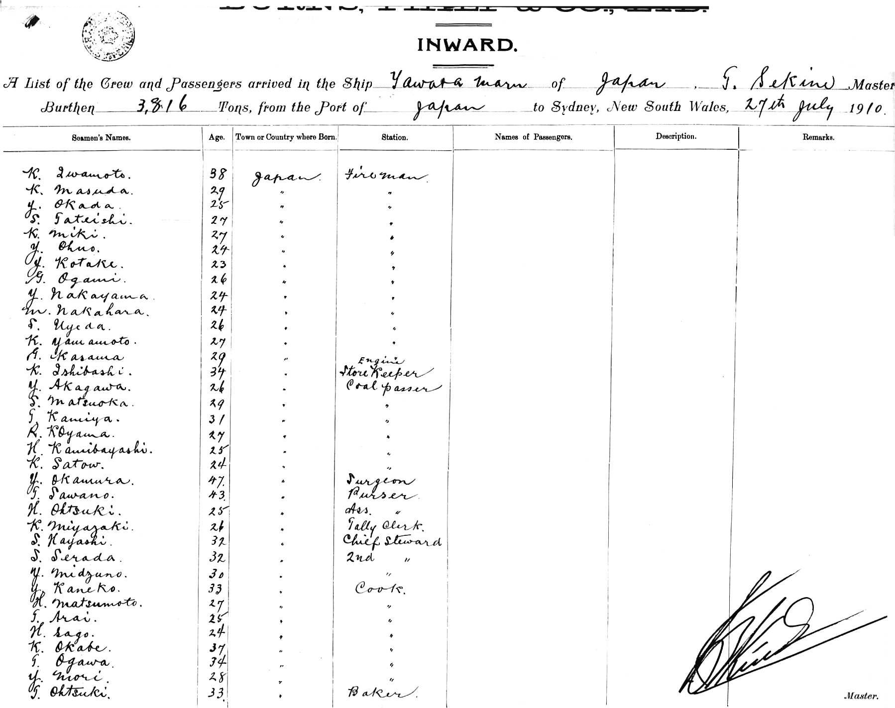 YAWATA MARUOF JAPAN, T SEKINE, MASTER, BURTHEN 3816 TONS FROM THE PORT OF JAPAN VIA BRISBANE TO SYDNEY, NEW SOUTH WALES, JULY, 1910 |