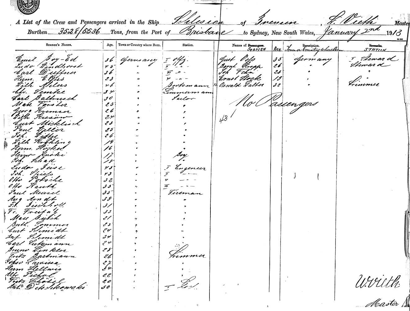 SCHLESIENOF BREMEN, W. VIETH, MASTER, BURTHEN 5536/3528 TONS FROM THE PORT OF BRISBANE TO SYDNEY, NEW SOUTH WALES, 2ND JANUARY 1913 |