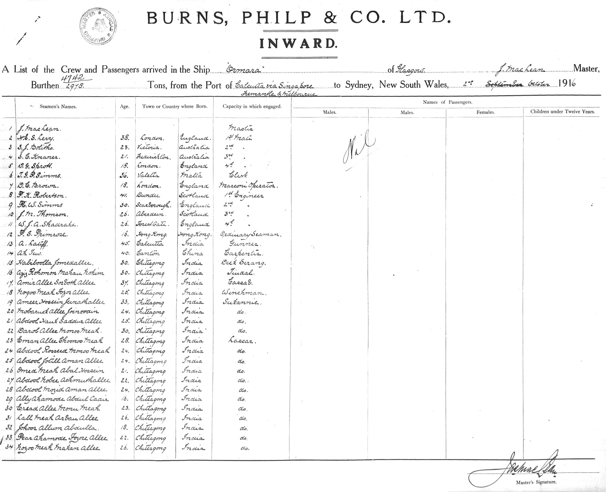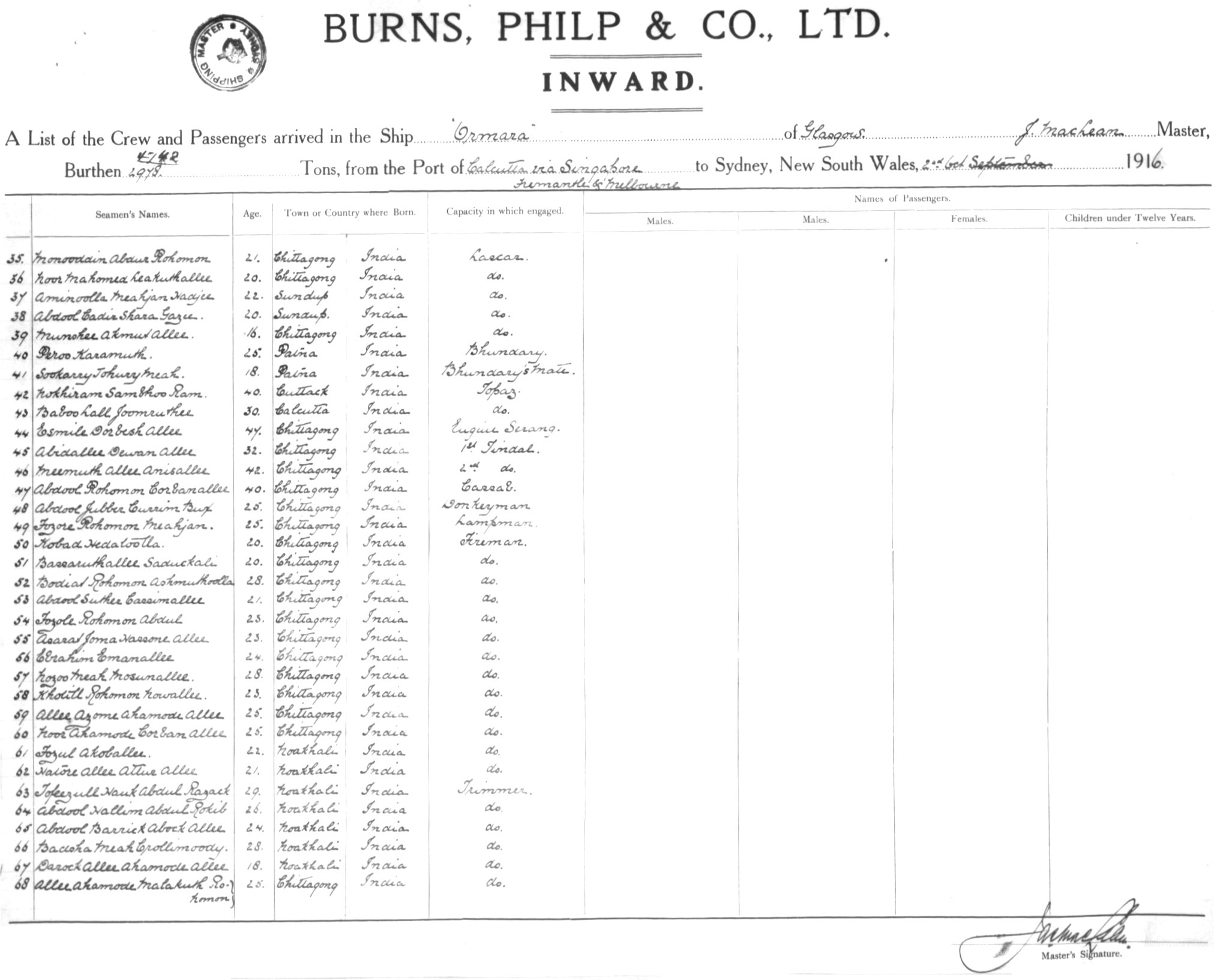 ORMARAOF GLASGOW, J. MACLEAN, MASTER, BURTHEN 4742/2978 TONS FROM THE PORT OF CALCUTTA via SINGAPORE, FREMANTLE & MELBOURNE TO SYDNEY, NEW SOUTH WALES, 2ND OCTOBER 1916 |