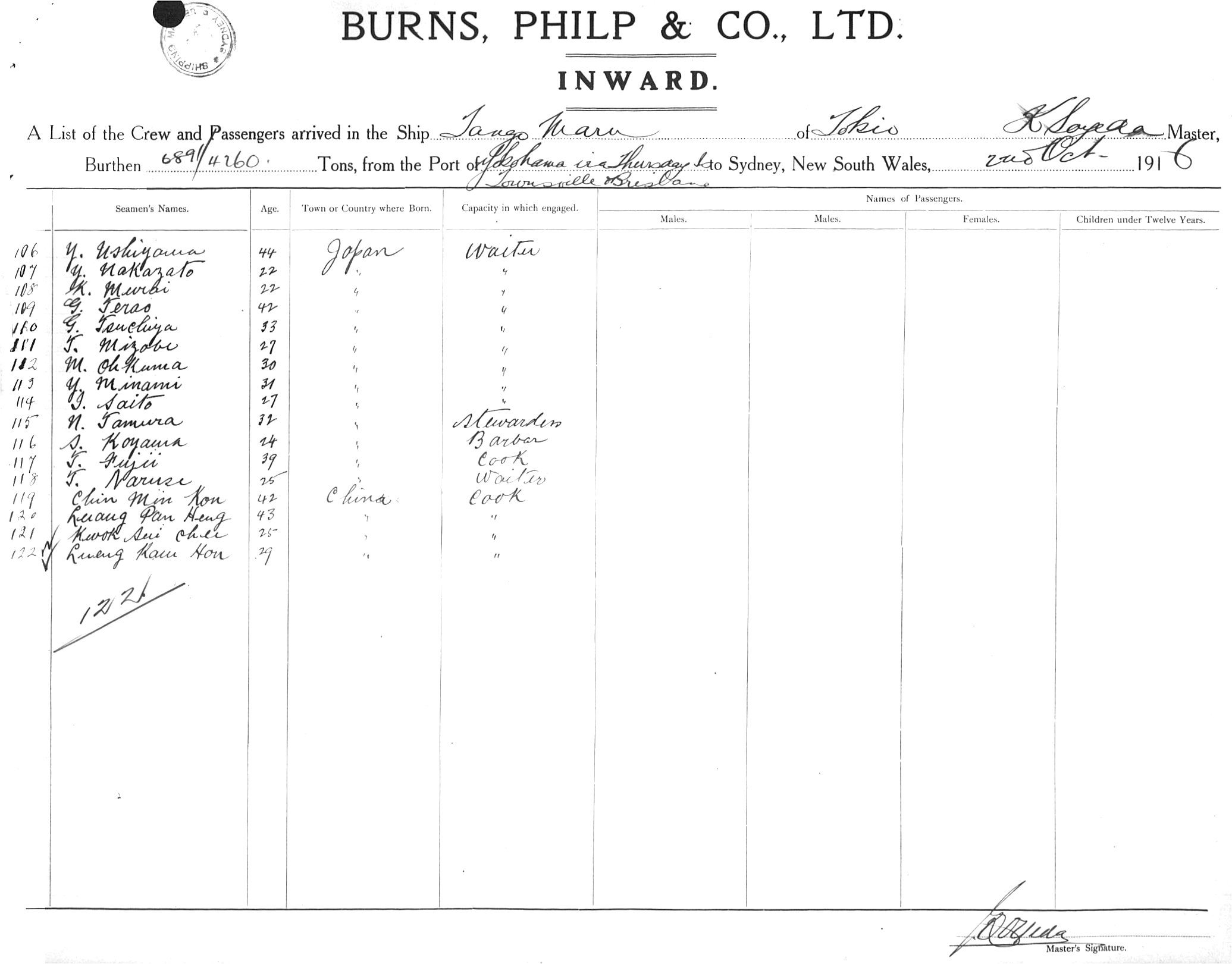 TANGO MARUOF TOKYO, K. SOYEDA, MASTER, BURTHEN 6891.4260 TONS FROM THE PORT OF YOKOHAMA via THURSDAY ISLAND, TOWNSVILLE & BRISBANE TO SYDNEY, NEW SOUTH WALES, 2ND OCTOBER 1916 |