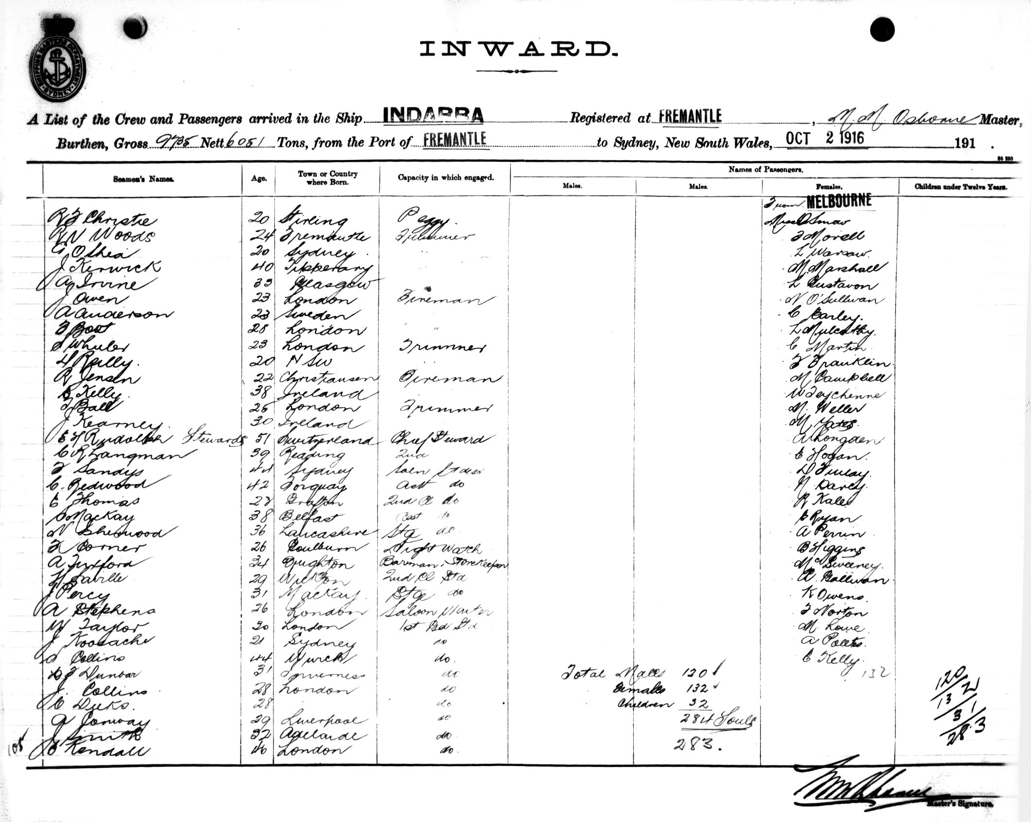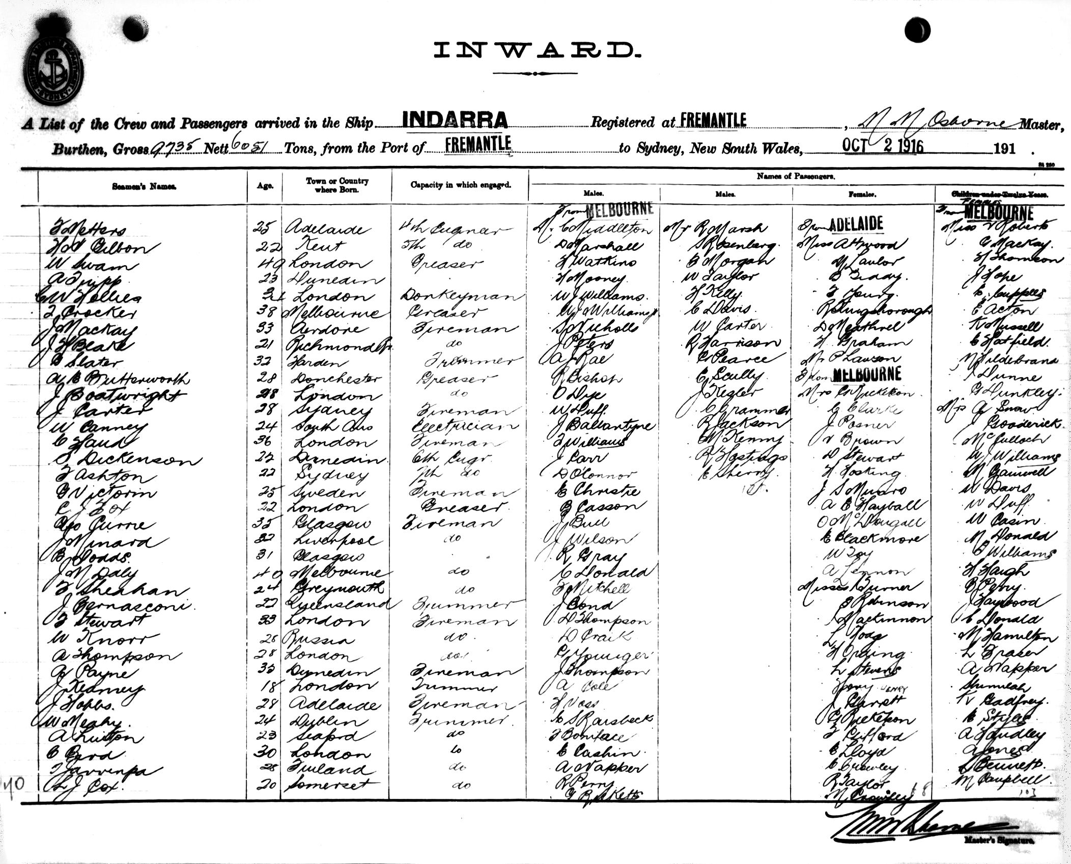INDARRAOF FREMANTLE, M. M. OSBORNE, MASTER, BURTHEN 9735/6051 TONS FROM THE PORT OF FREMANTLE TO SYDNEY, NEW SOUTH WALES, 2ND OCTOBER 1916 |