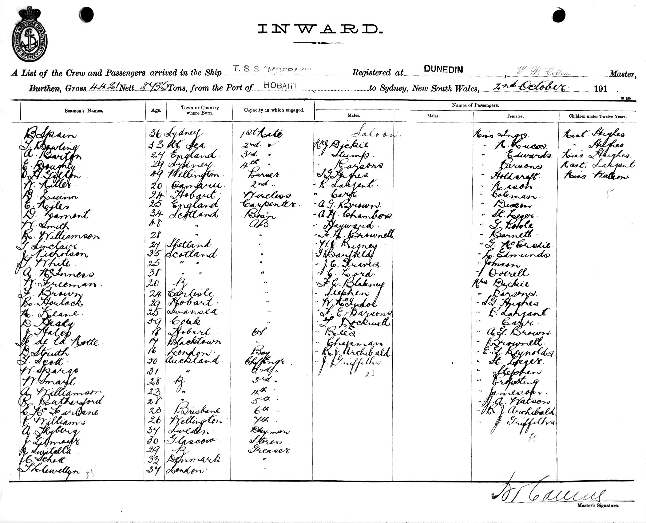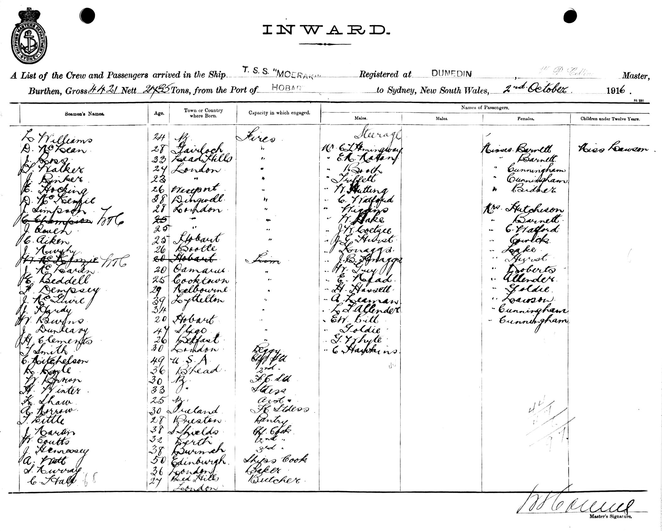 MOERAKIOF DUNEDIN, W. P. COLLINS, MASTER, BURTHEN 4421/2735 TONS FROM THE PORT OF HOBART TO SYDNEY, NEW SOUTH WALES, 2ND OCTOBER 1916 |