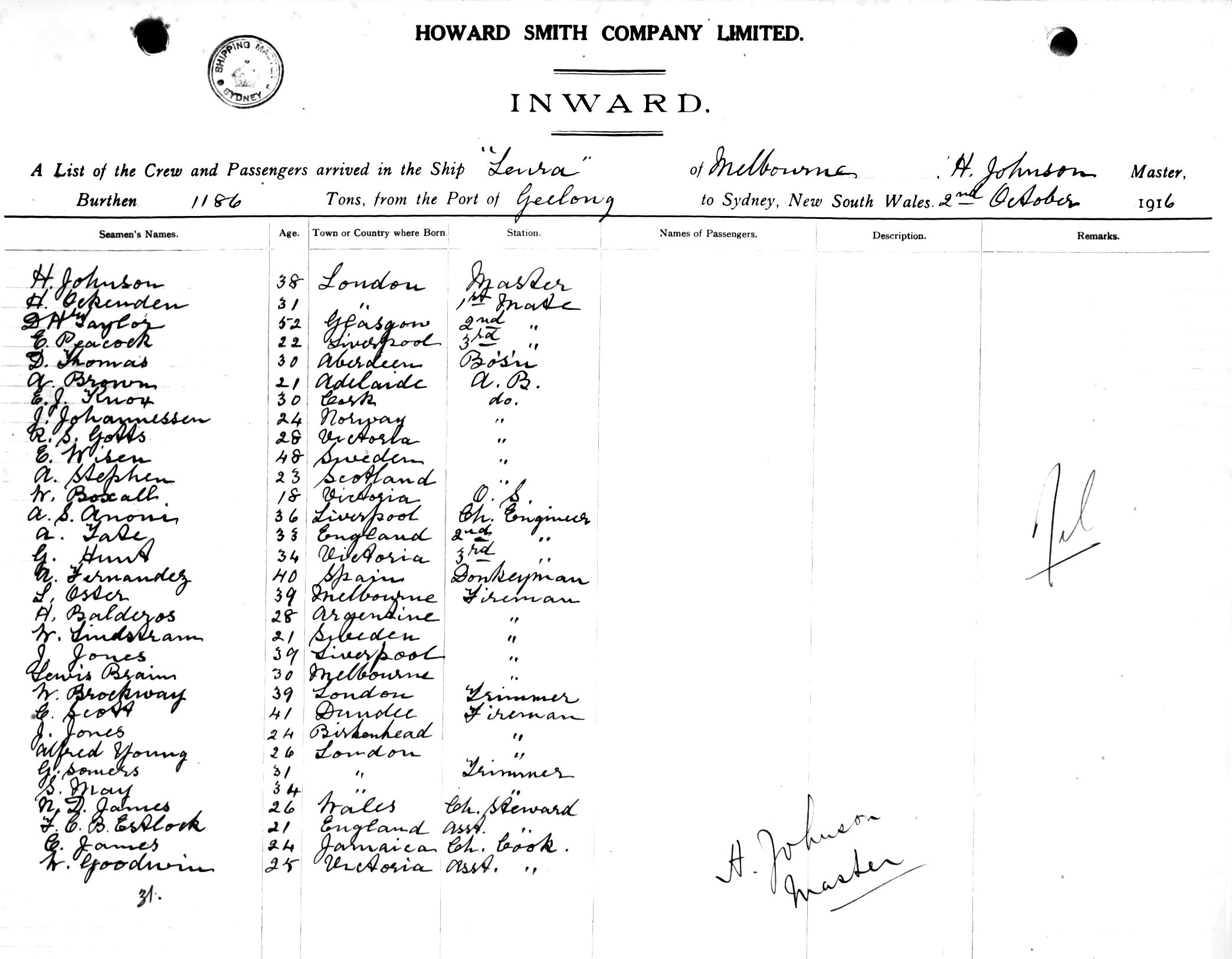 LEURAOF MELBOURNE, H. JOHNSON, MASTER, BURTHEN 1186 TONS FROM THE PORT OF GEELONG TO SYDNEY, NEW SOUTH WALES, 2ND OCTOBER 1916 |