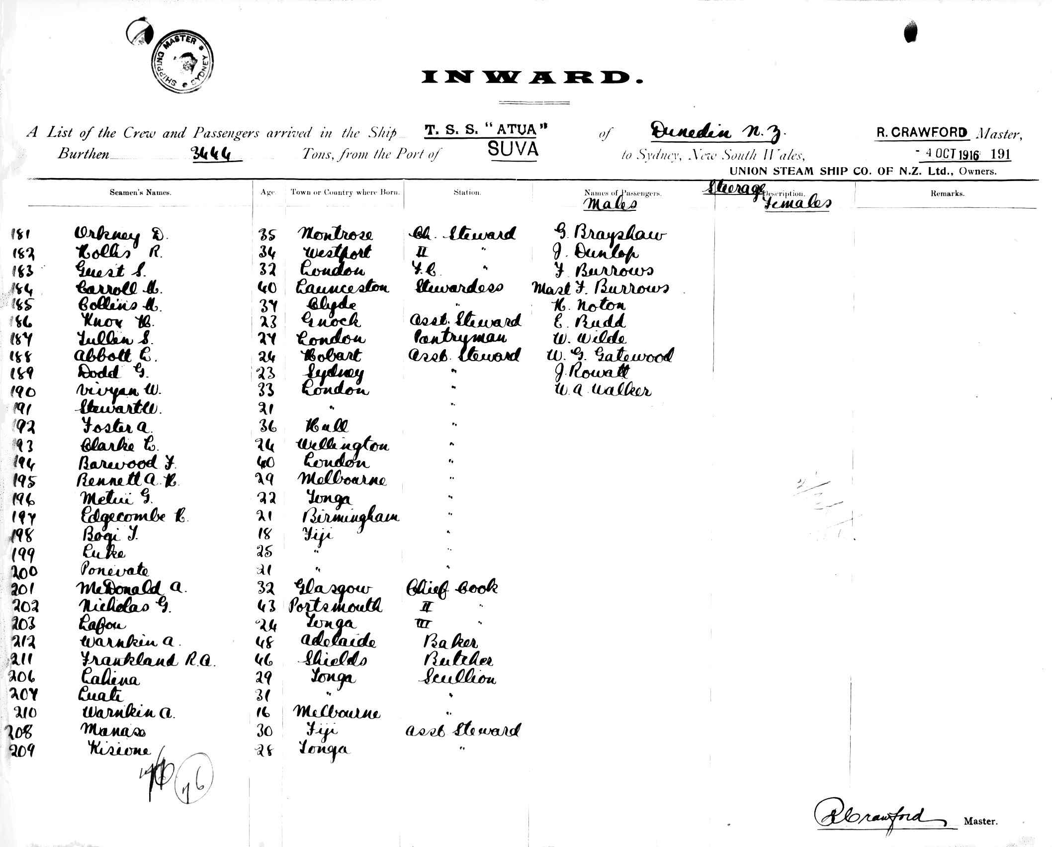 ATUAOF DUNEDIN, R. CRAWFORD, MASTER, BURTHEN 3444 TONS FROM THE PORT OF SUVA TO SYDNEY, NEW SOUTH WALES, 4TH OCTOBER 1916 |