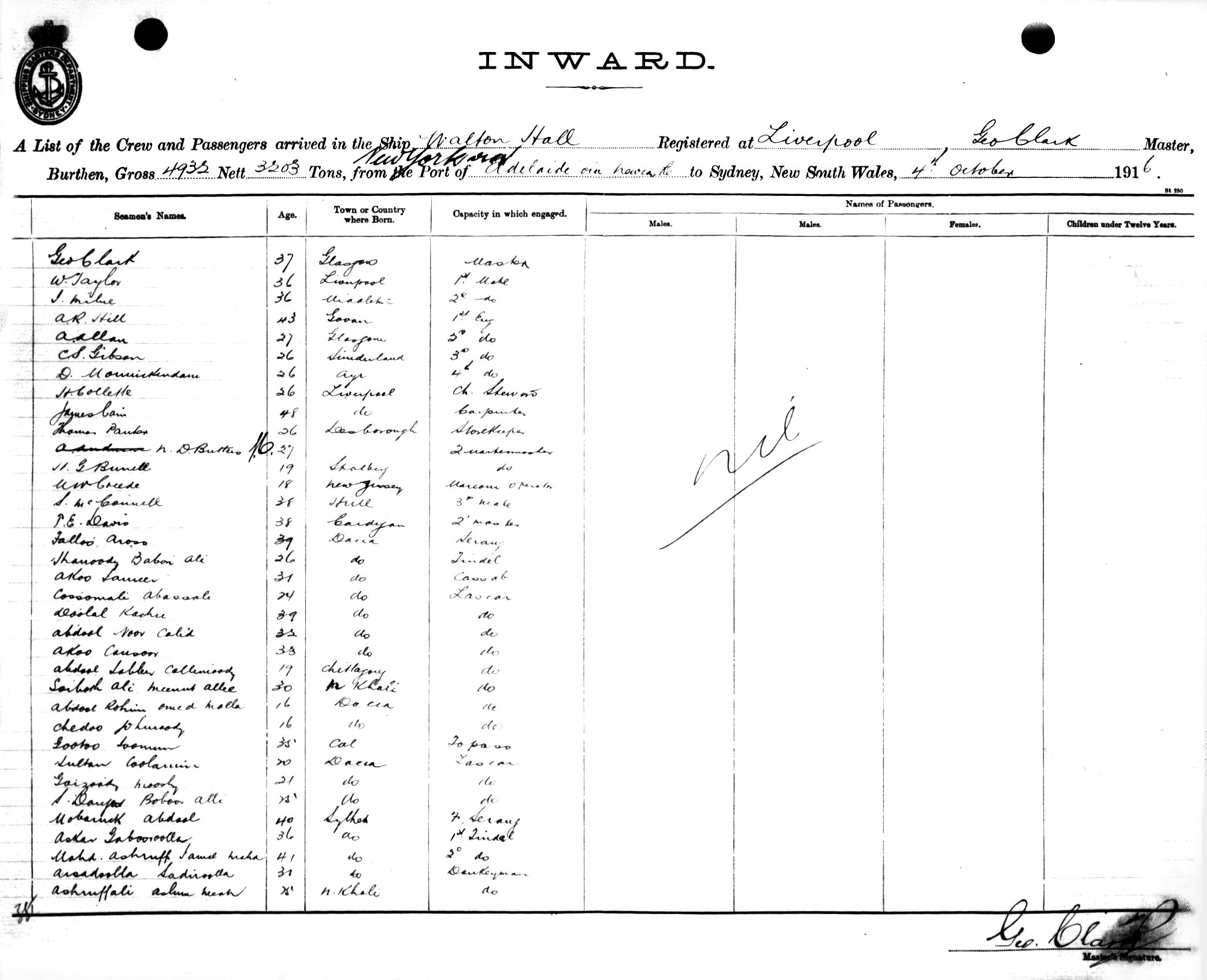 WALTON HALLOF LIVERPOOL, GEORGE CLARK, MASTER, BURTHEN 4932/3203 TONS FROM THE PORT OF NEW YORK via ADELAIDE & NEWCASTLE TO SYDNEY, NEW SOUTH WALES, 4TH OCTOBER 1916 |