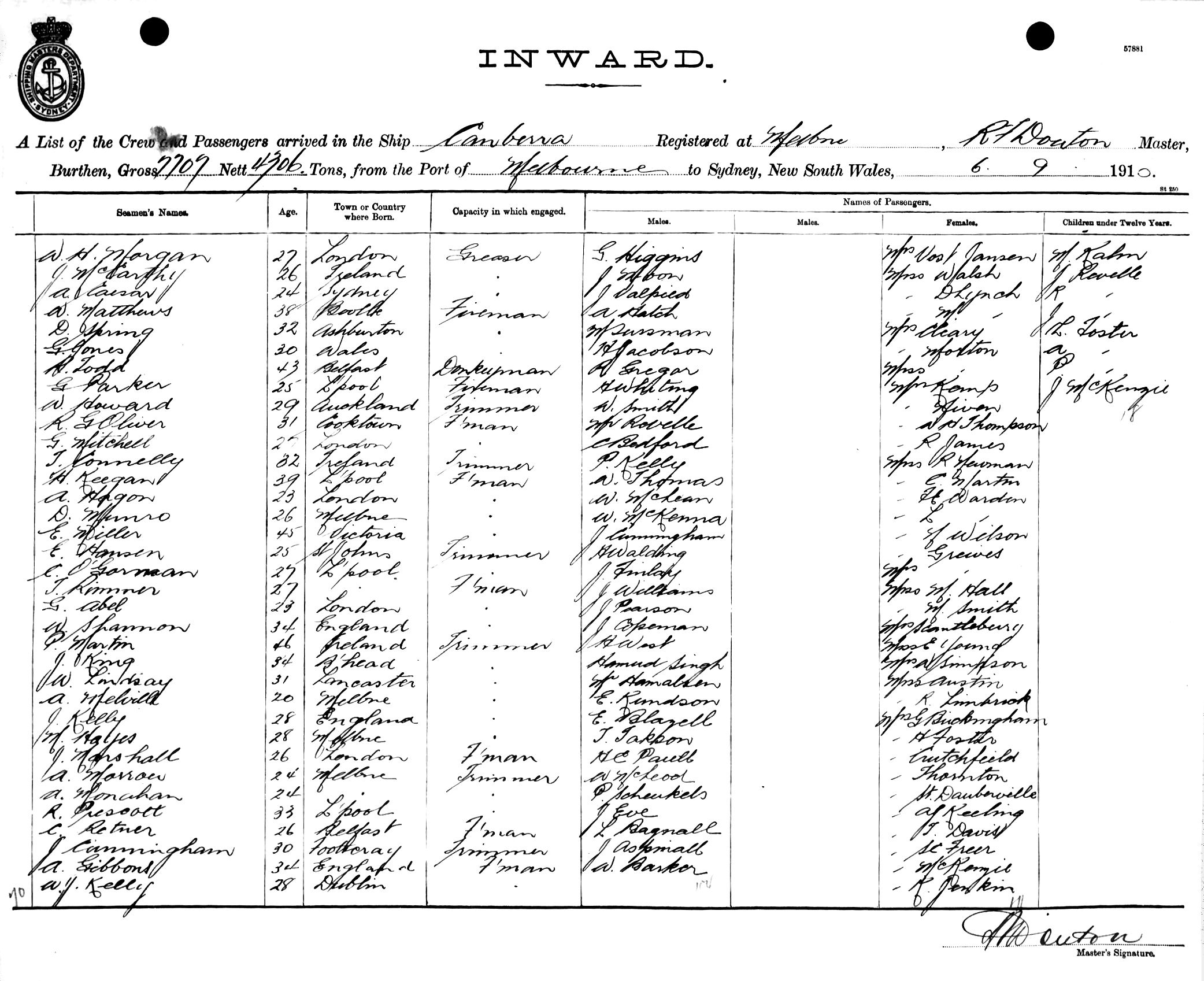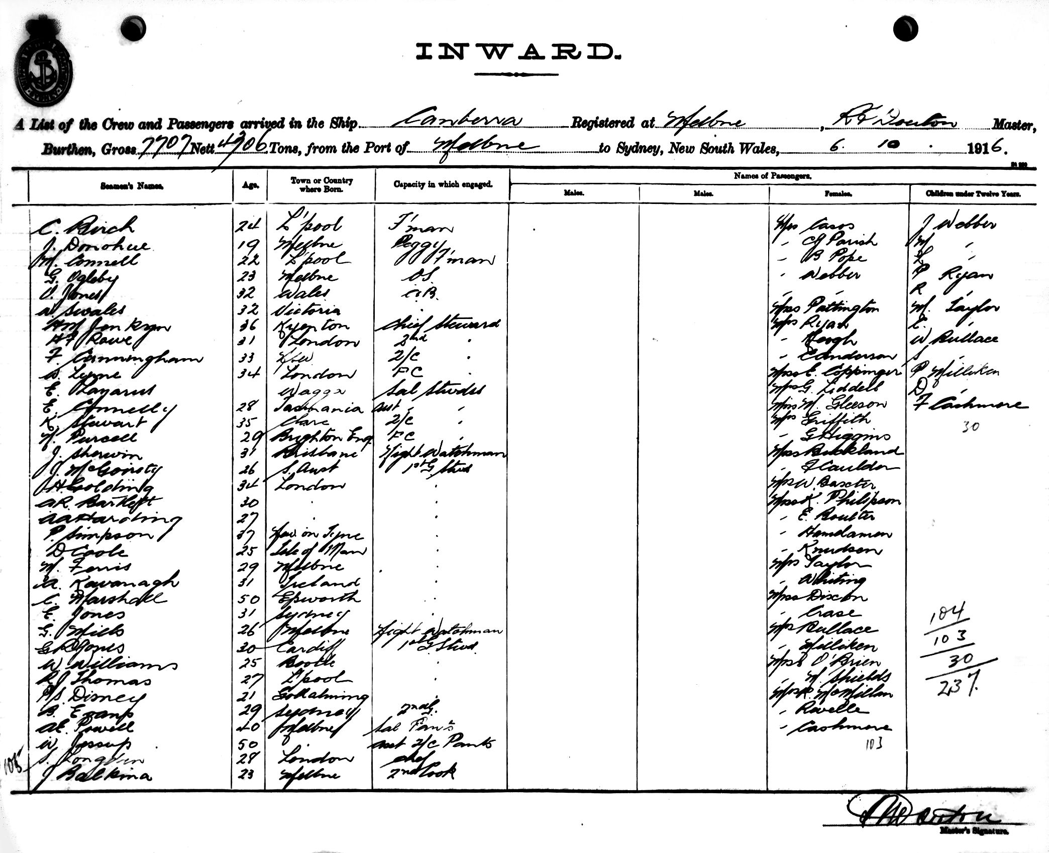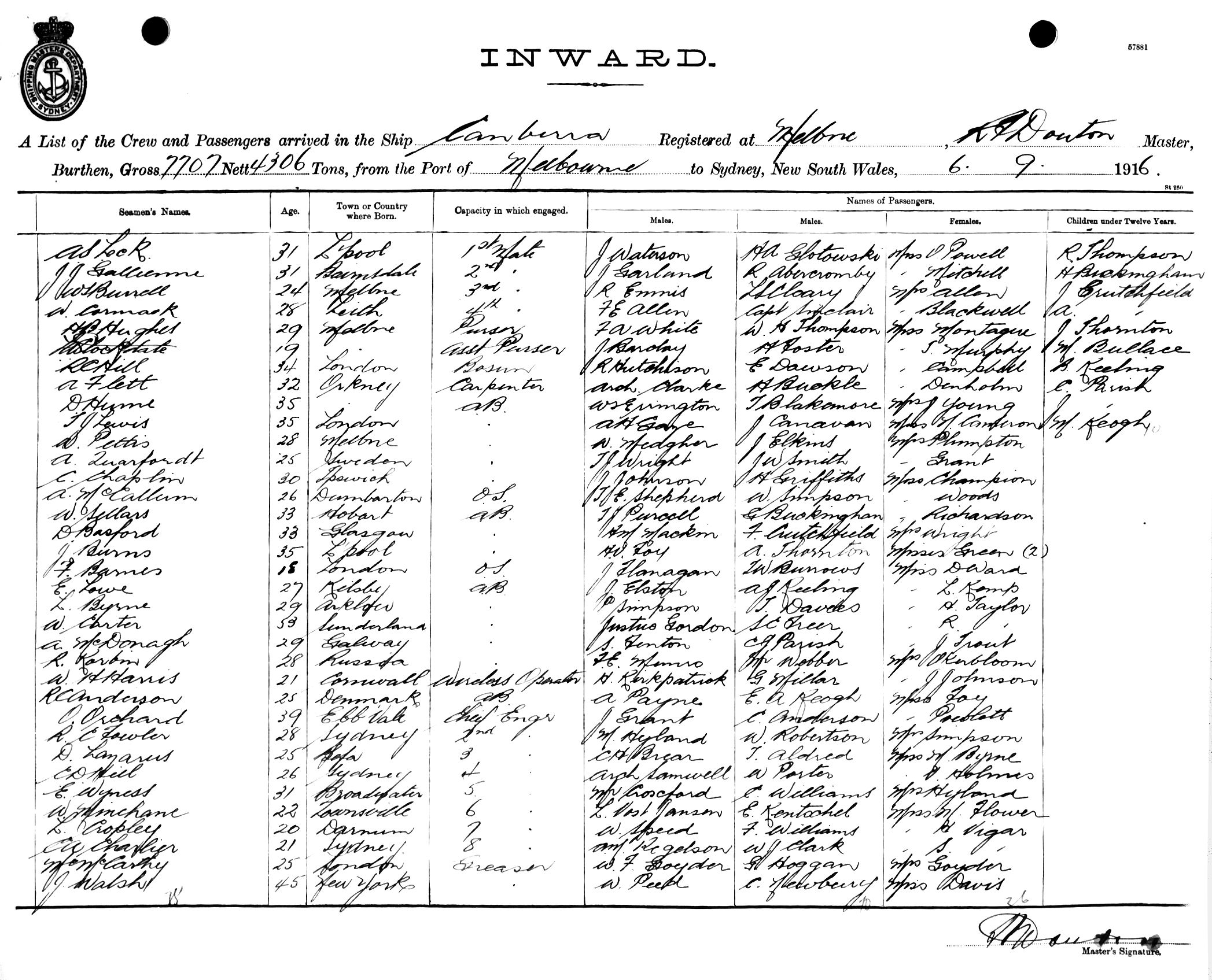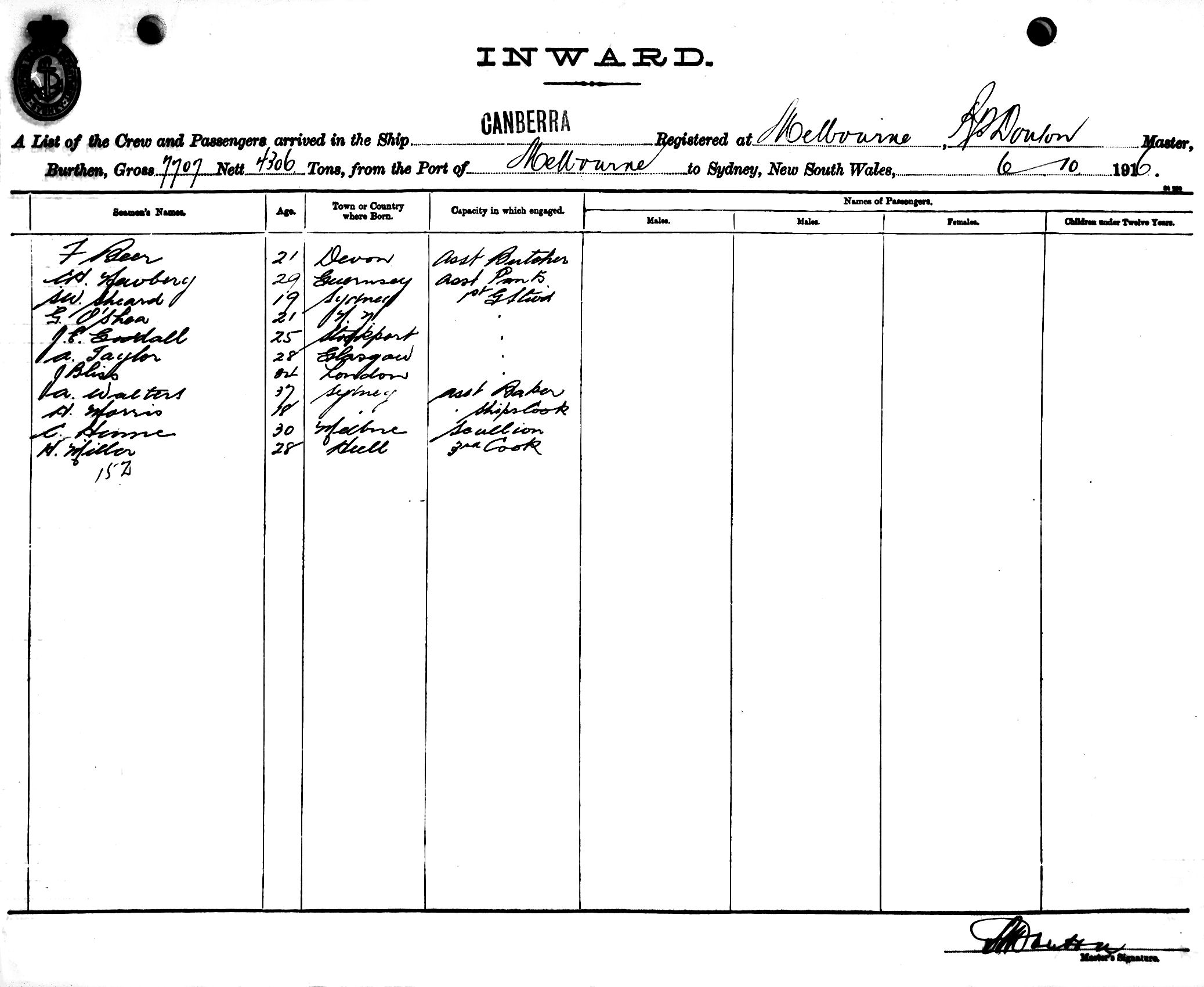 Mariners and ships in Australian Waters | CANBERRAOF MELBOURNE, R. F. DOUTON, MASTER, BURTHEN 7707/4306 TONS FROM THE PORT OF MELBOURNE TO SYDNEY, NEW SOUTH WALES, 6TH OCTOBER 1916 |