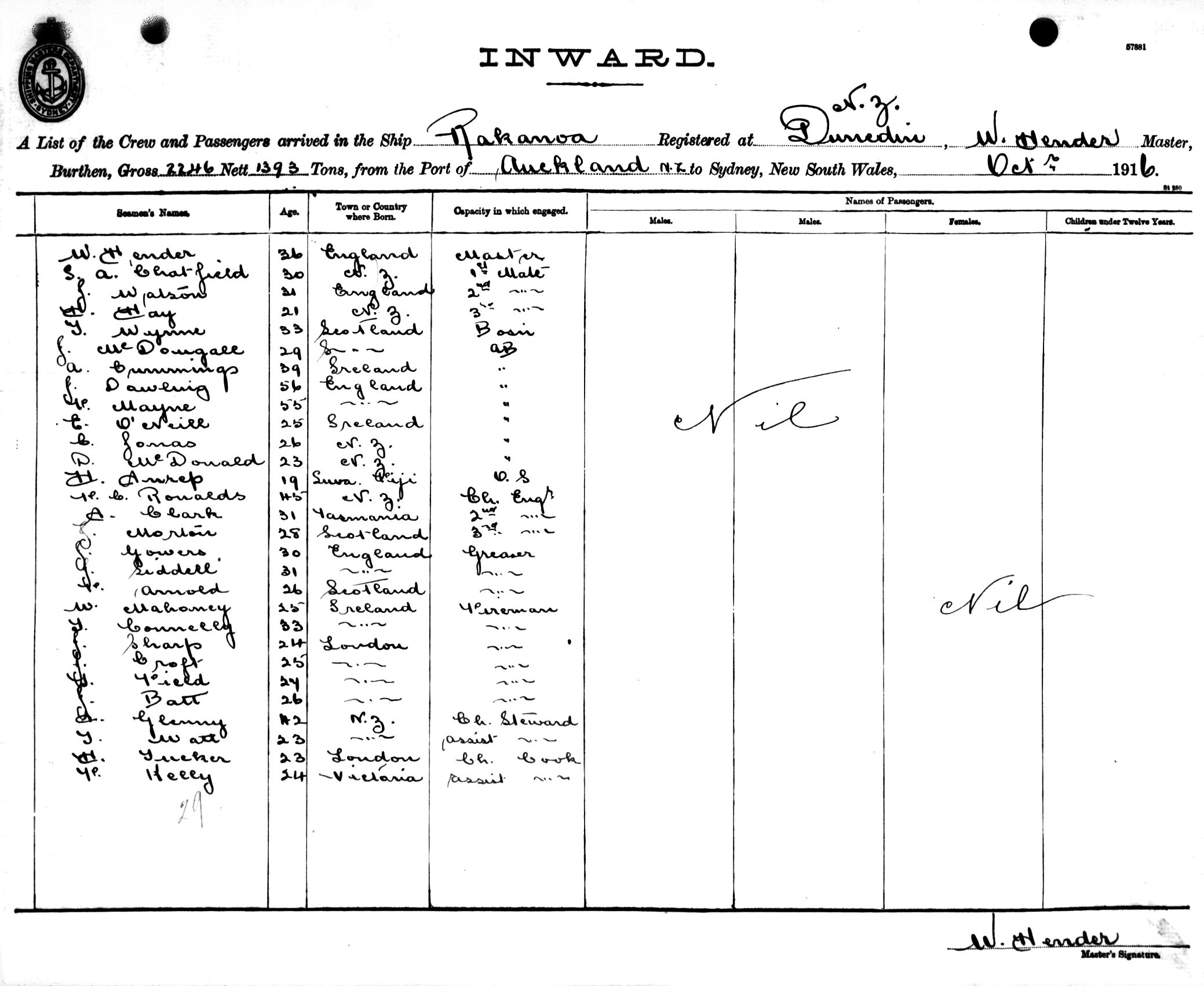 RAKANOAOF DUNEDIN, W. HENDER, MASTER, BURTHEN 246/1393 TONS FROM THE PORT OF AUCKLAND TO SYDNEY, NEW SOUTH WALES, ? OCTOBER 1916 |