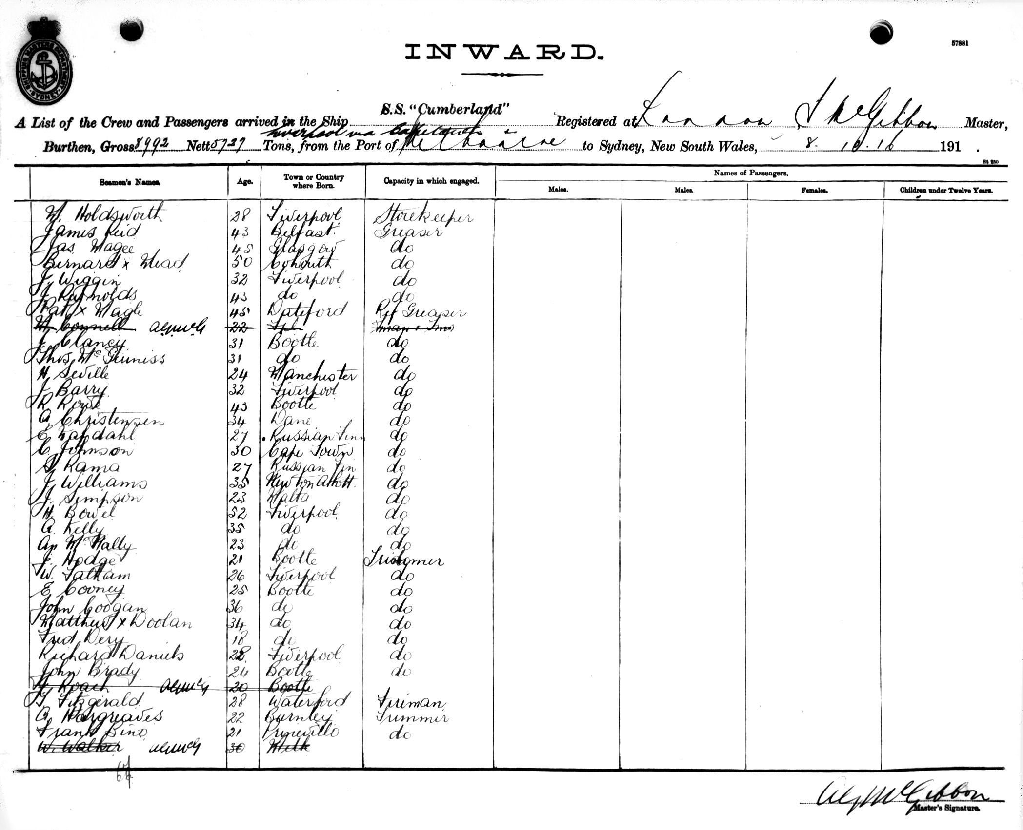 CUMBERLANDOF LONDON, A. G. MCGIBBON, MASTER, BURTHEN 8992/5727 TONS FROM THE PORT OF LIVERPOOL via CAPE TOWN & MELBOURNE TO SYDNEY, NEW SOUTH WALES, 8TH OCTOBER 1916 |