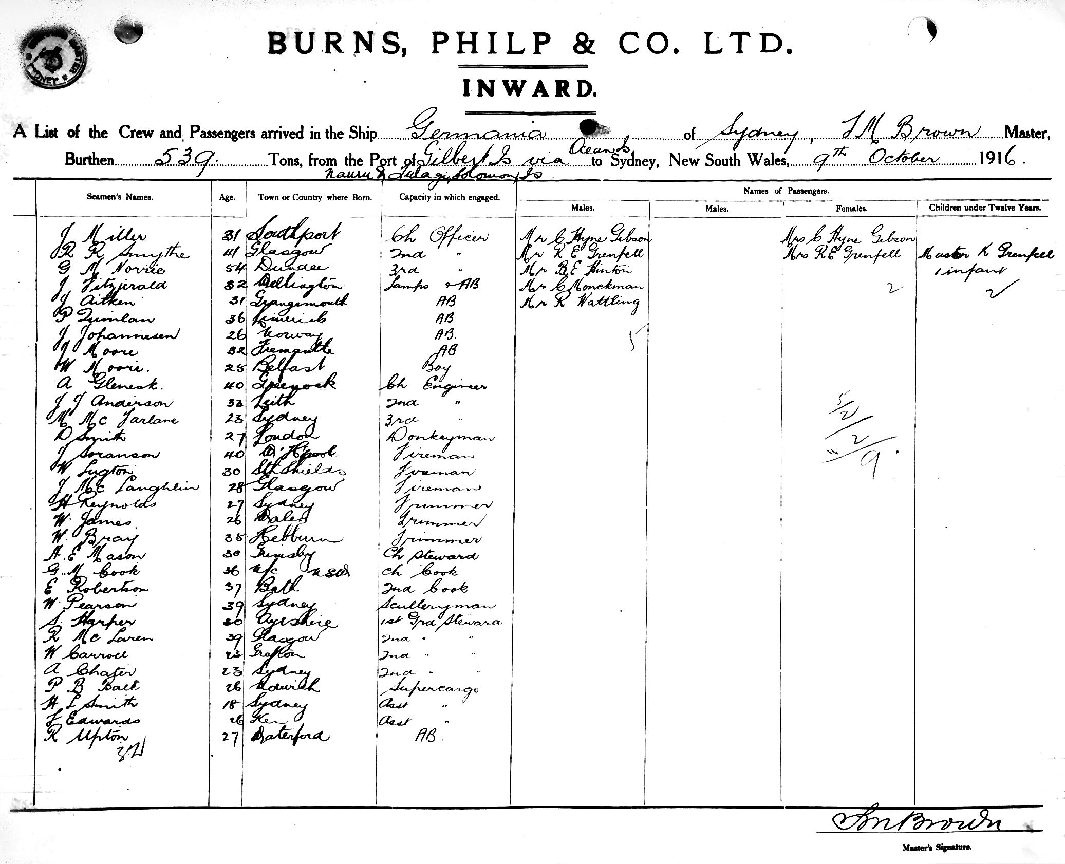 GERMANIAOF SYDNEY, T. M. BROWN, MASTER, BURTHEN 539 TONS FROM THE PORT OF GILBERT & OCEAN ISLANDS via NAURU & TULAGAI, SOLOMON ISLANDS TO SYDNEY, NEW SOUTH WALES, 9TH OCTOBER 1916 |