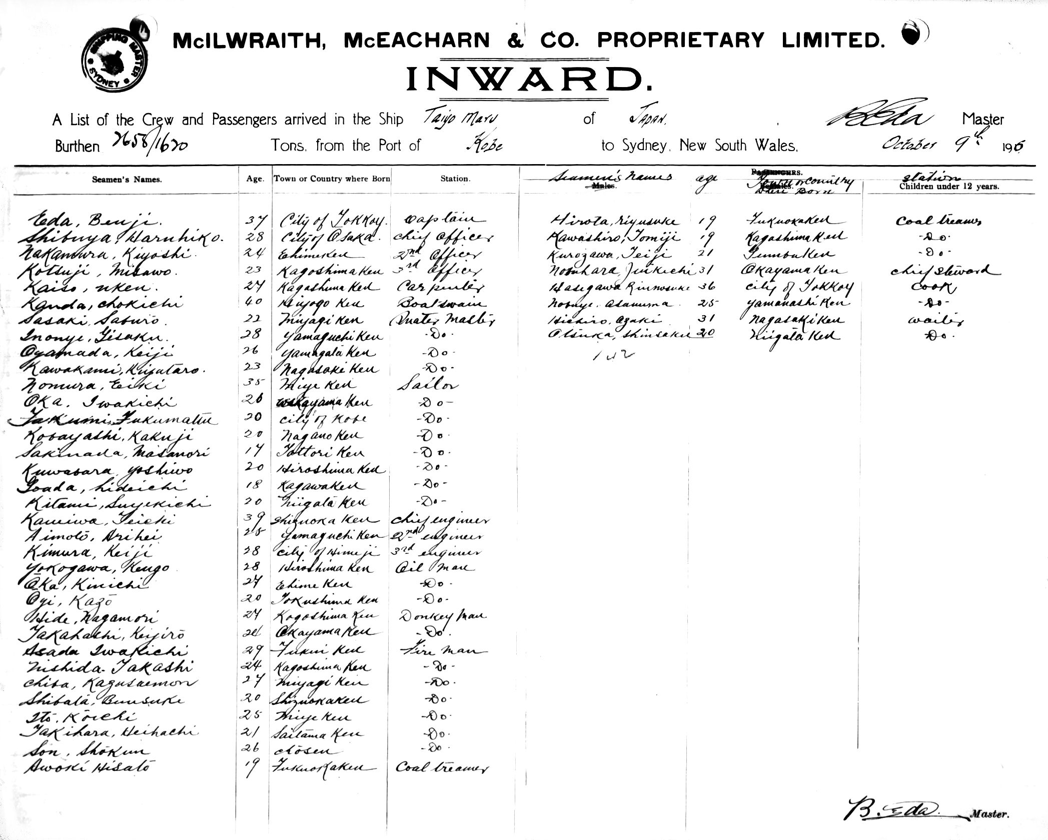 TAIYO MARUOF JAPAN, BENJI EDA, MASTER, BURTHEN 2658/1620 TONS FROM THE PORT OF KOBE, JAPAN TO SYDNEY, NEW SOUTH WALES, 9TH OCTOBER 1916 |