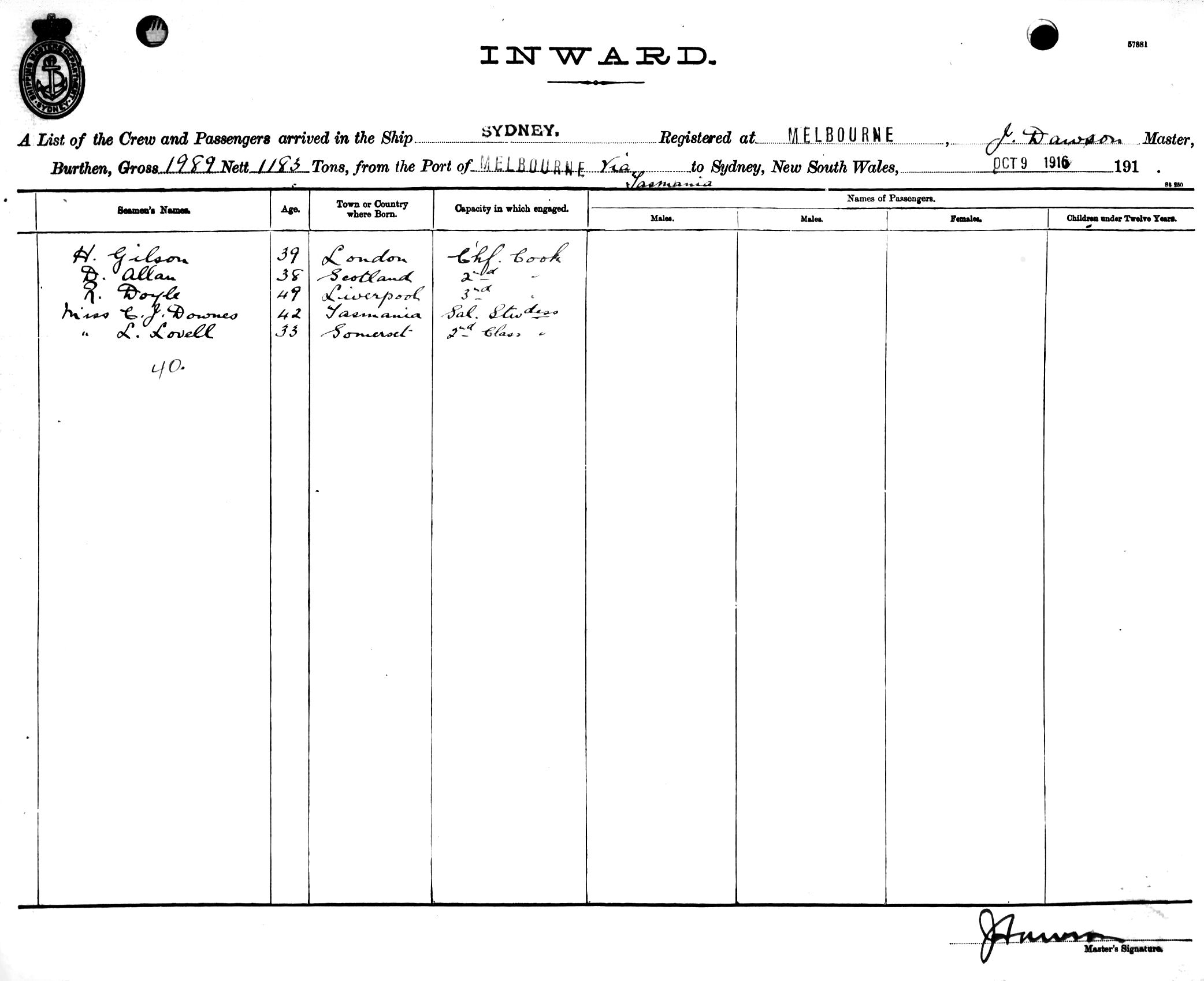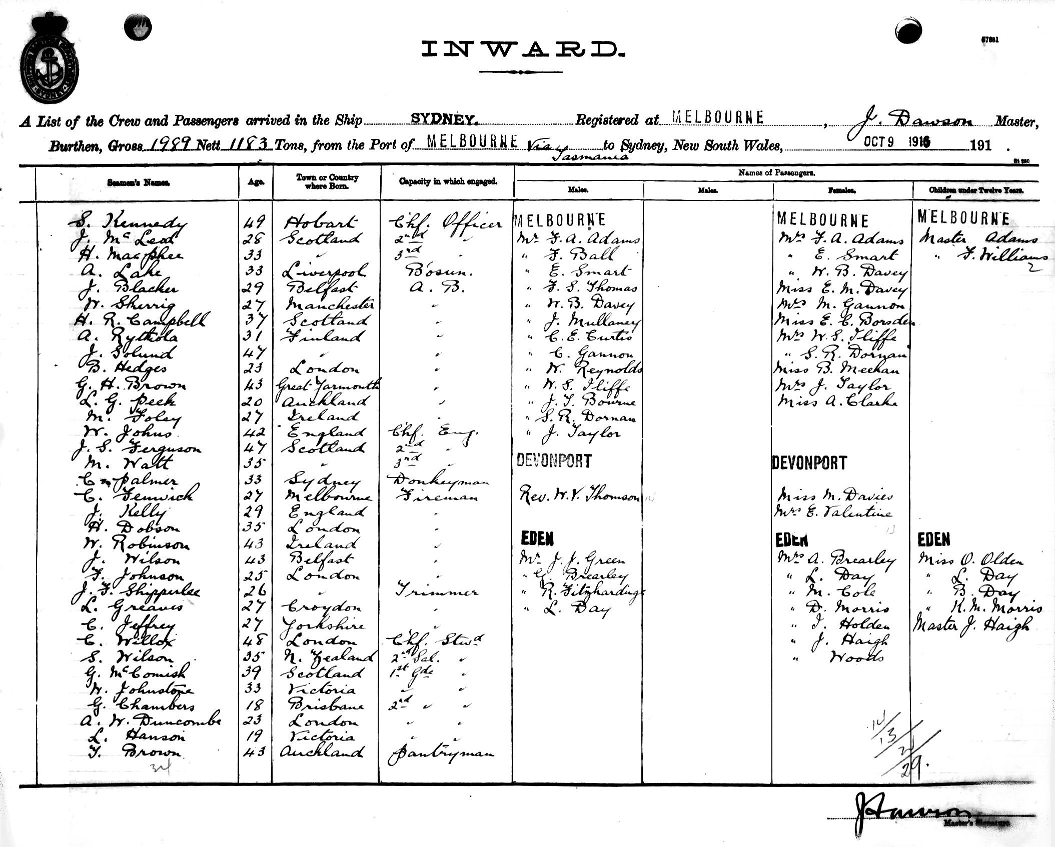 SYDNEYOF MELBOURNE, J. DAWSON, MASTER, BURTHEN 1989/1183 TONS FROM THE PORT OF MELBOURNE via TASMANIA TO SYDNEY, NEW SOUTH WALES, 9TH OCTOBER 1916 |