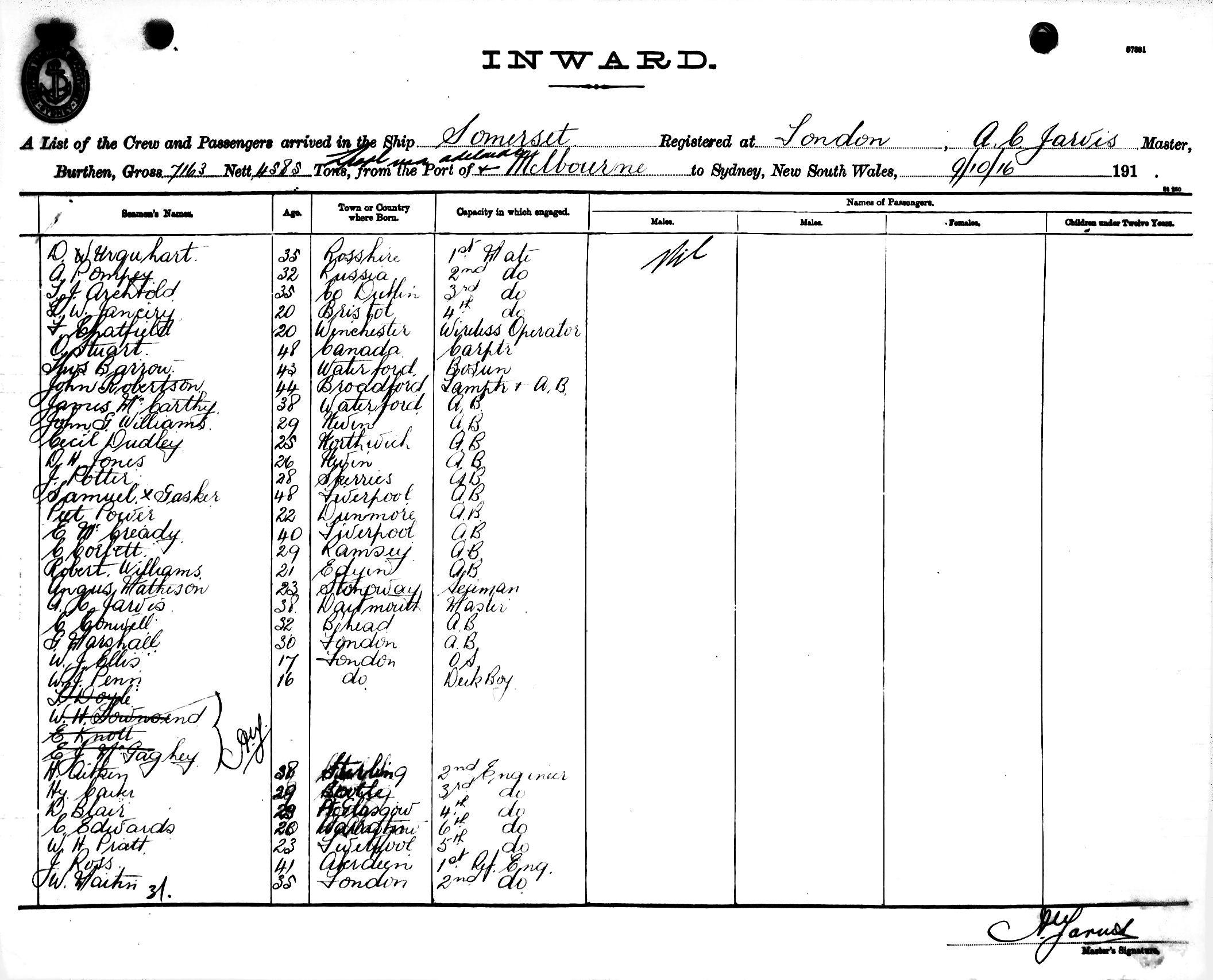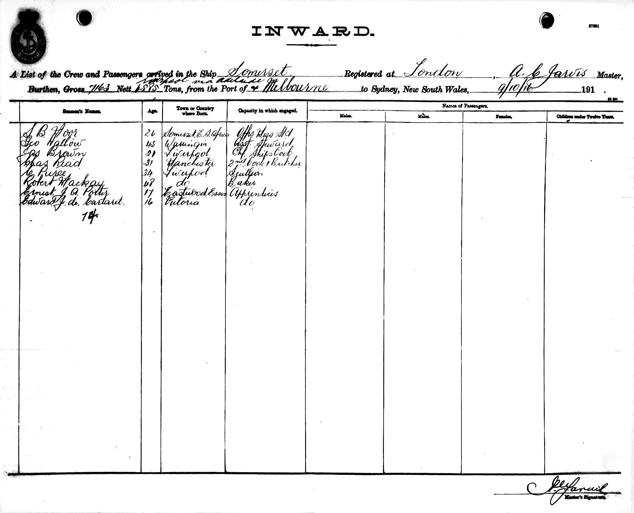 Mariners and ships in Australian Waters | SOMERSETOF LONDON, A. C. JARVIS, MASTER, BURTHEN 7163/4585 TONS FROM THE PORT OF LIVERPOOL via ADELAIDE & MELBOURNE TO SYDNEY, NEW SOUTH WALES, 9TH OCTOBER 1916 |