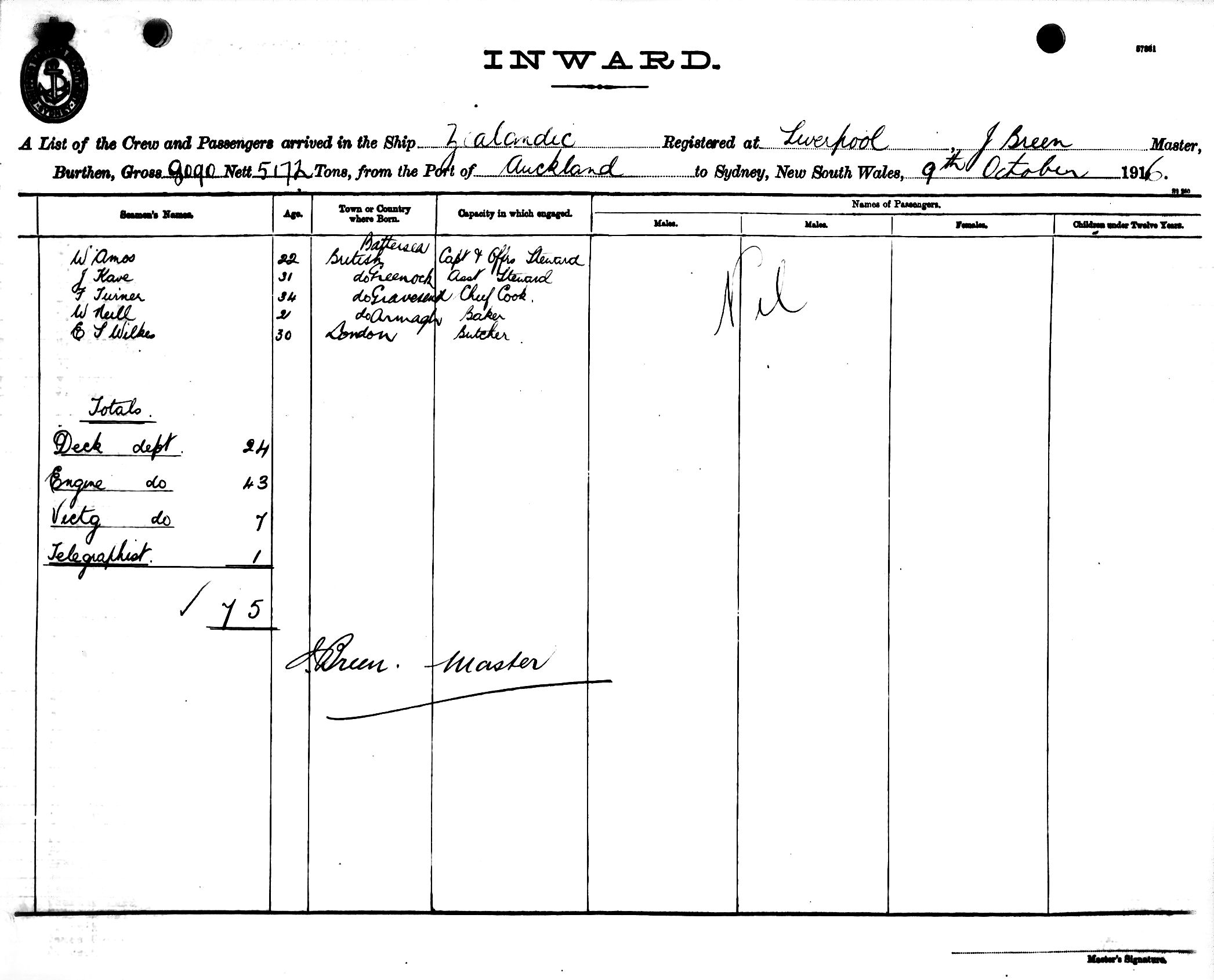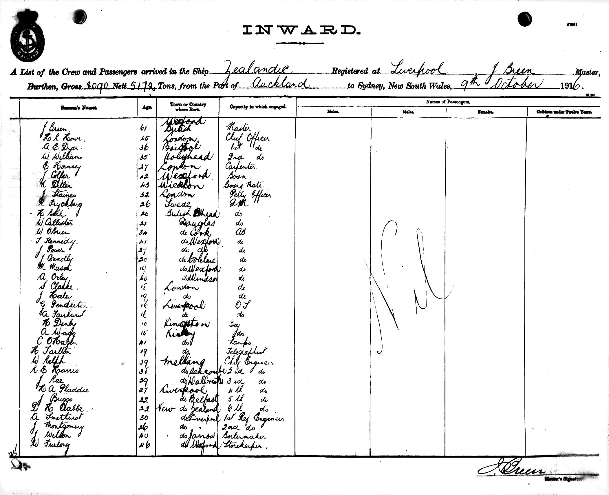 ZEALANDICOF LIVERPOOL, J. BREEN, MASTER, BURTHEN 8090/5172 TONS FROM THE PORT OF AUCKLAND TO SYDNEY, NEW SOUTH WALES, 9TH OCTOBER 1916 |