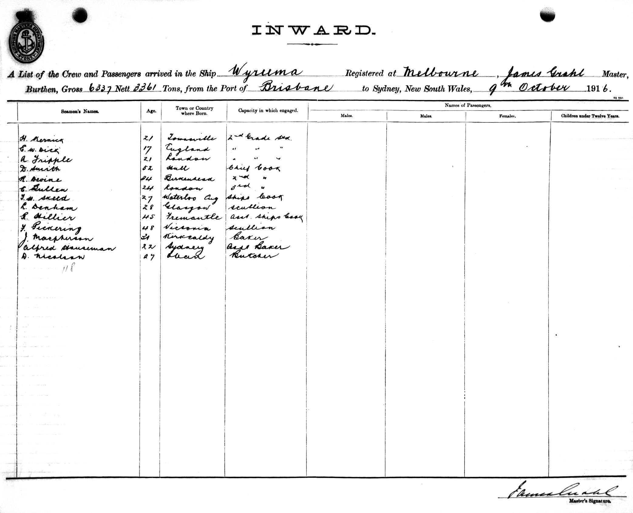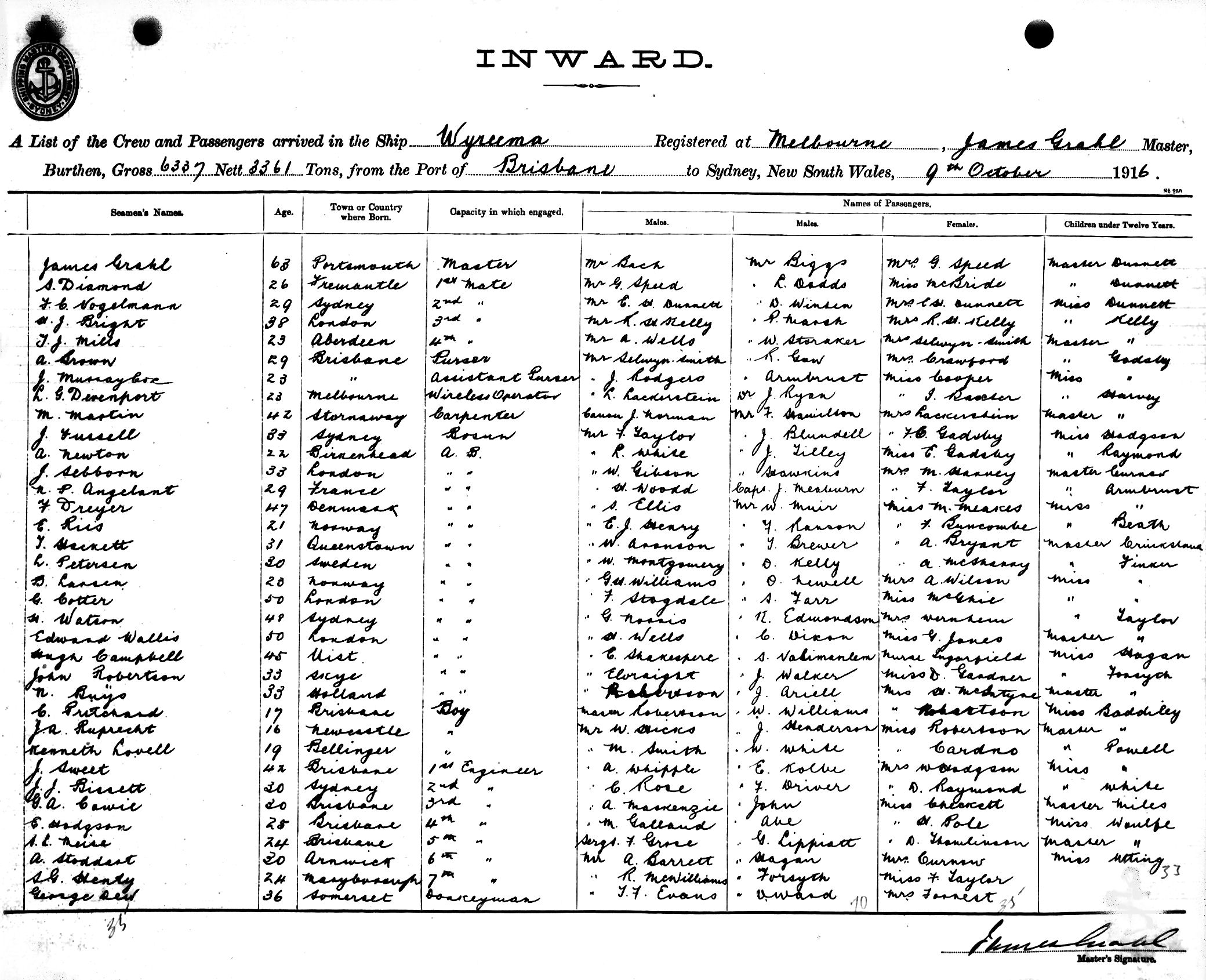 Mariners and ships in Australian Waters | WYREEMAOF MELBOURNE, JAMES GRAHL, MASTER, BURTHEN 6337/3361 TONS FROM THE PORT OF BRISBANE TO SYDNEY, NEW SOUTH WALES, 9TH OCTOBER 1916 |