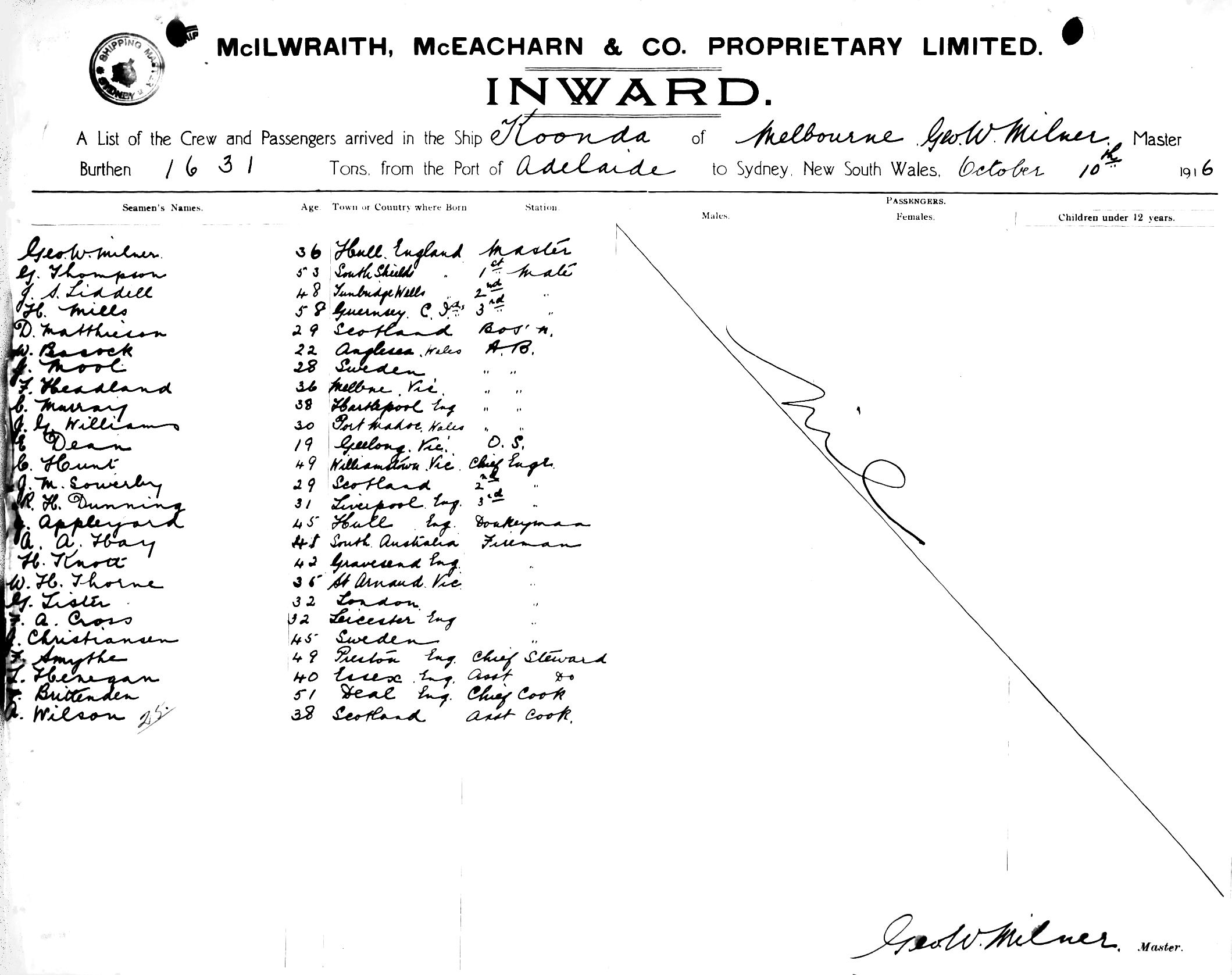 Mariners and ships in Australian Waters | KOONDAOF MELBOURNE, GEORGE W. MILNER, MASTER, BURTHEN 1631 TONS FROM THE PORT OF ADELAIDE TO SYDNEY, NEW SOUTH WALES, 10TH OCTOBER 1916 |