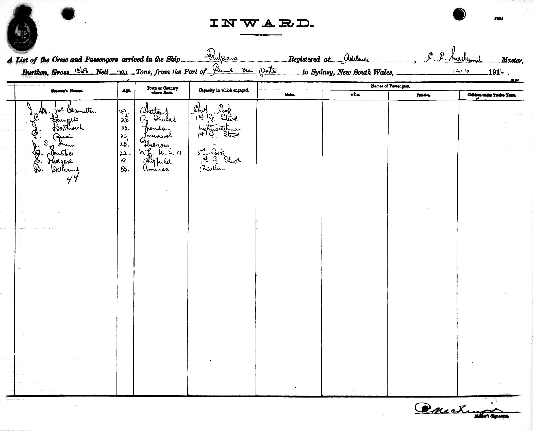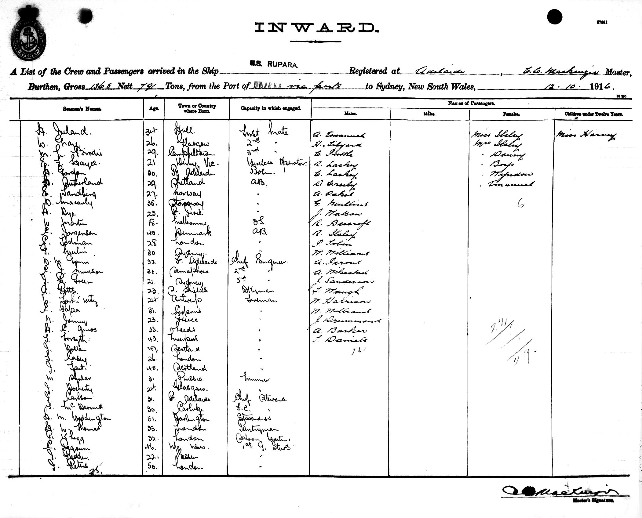 Mariners and ships in Australian Waters | RUPARAOF ADELAIDE, C. C. MACKENZIE, MASTER, BURTHEN 1368/791 TONS FROM THE PORT OF CAIRNS via PORTS TO SYDNEY, NEW SOUTH WALES, 12TH OCTOBER 1916 |