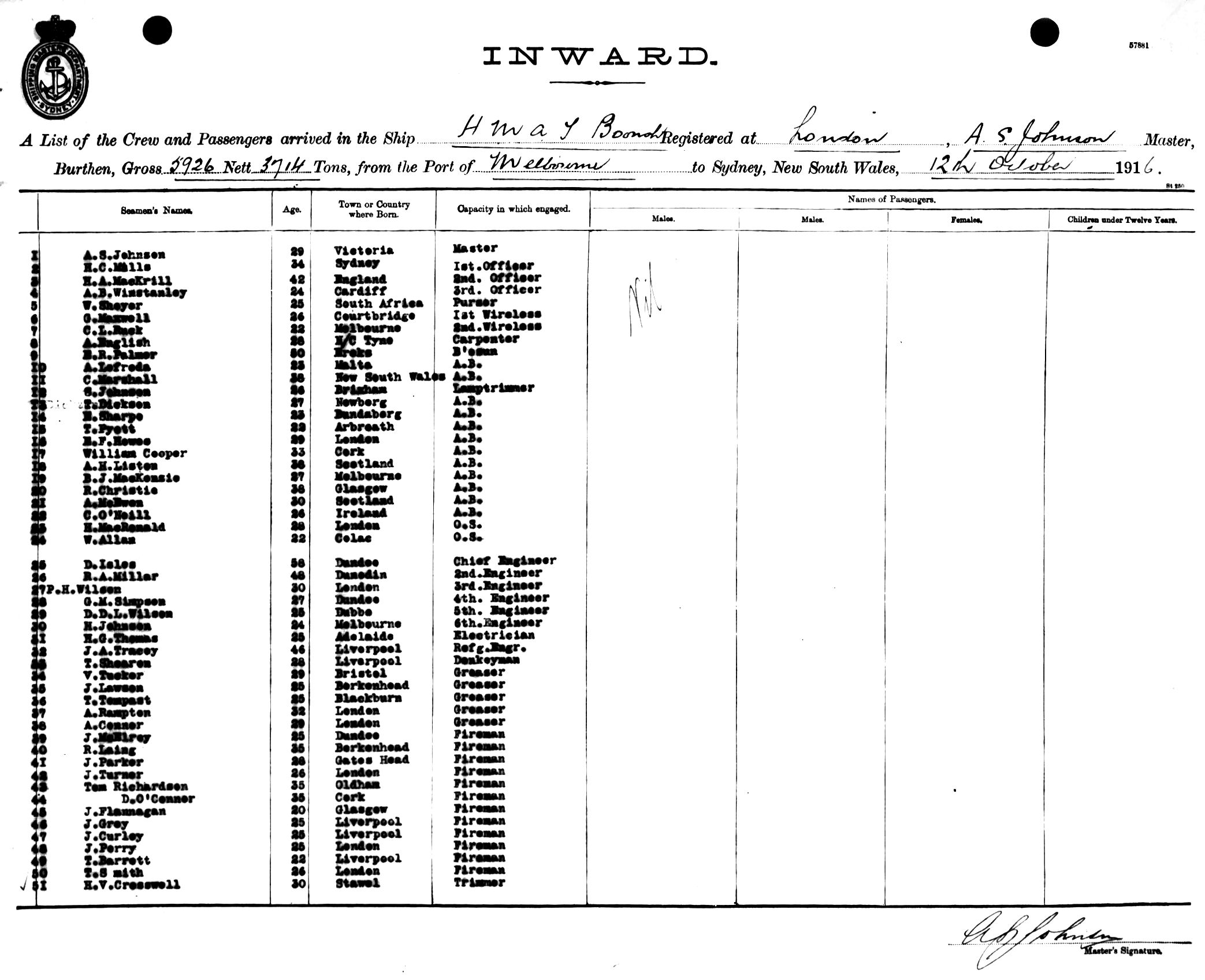 BOONAHOF LONDON, A. S. JOHNSON, MASTER, BURTHEN 5926/3714 TONS FROM THE PORT OF MELBOURNE TO SYDNEY, NEW SOUTH WALES, 12TH OCTOBER 1916 |