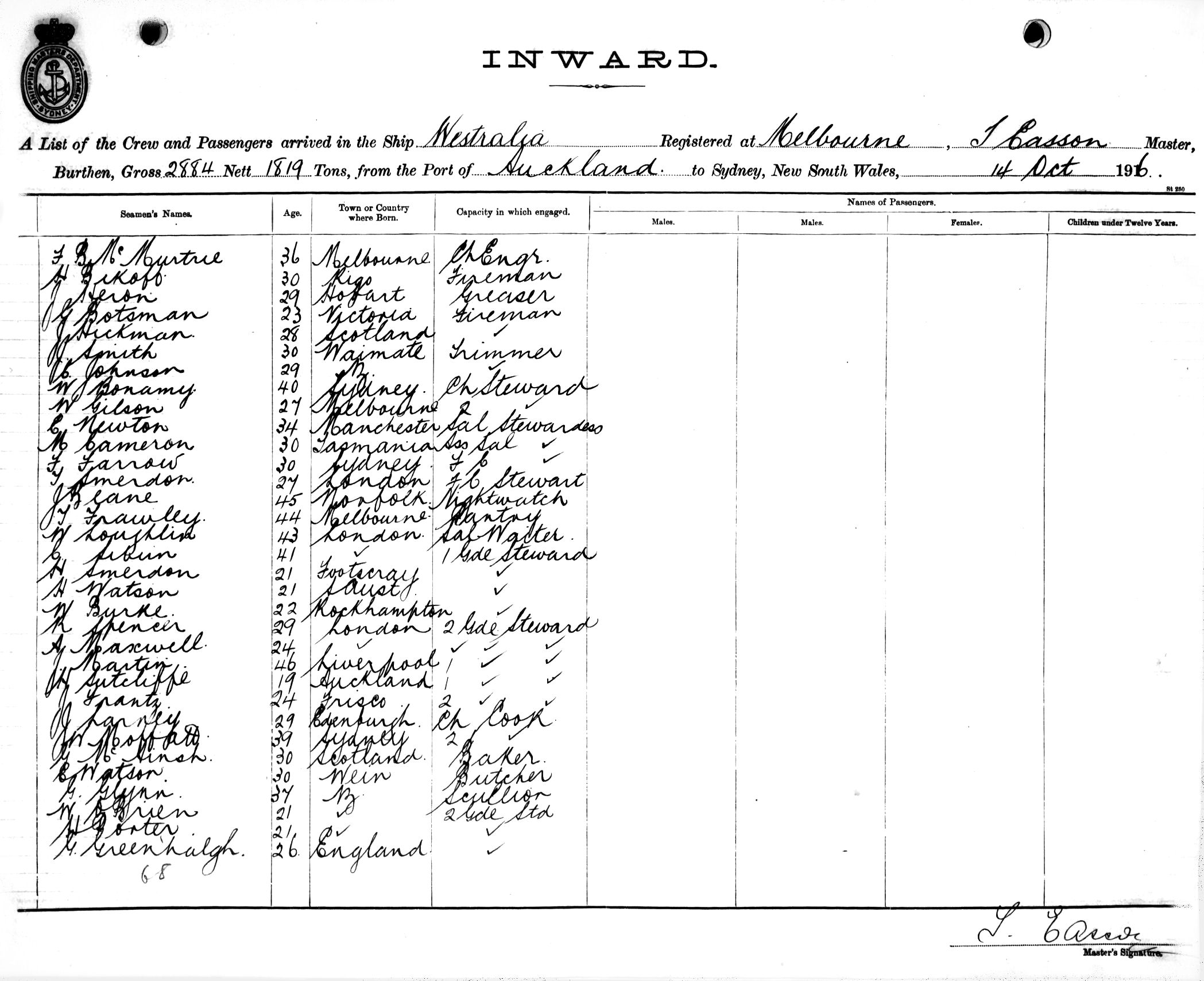 WESTRALIAOF MELBOURNE, T. EASSON, MASTER, BURTHEN 2884/1819 TONS FROM THE PORT OF AUCKLAND TO SYDNEY, NEW SOUTH WALES, 14TH OCTOBER 1916 |