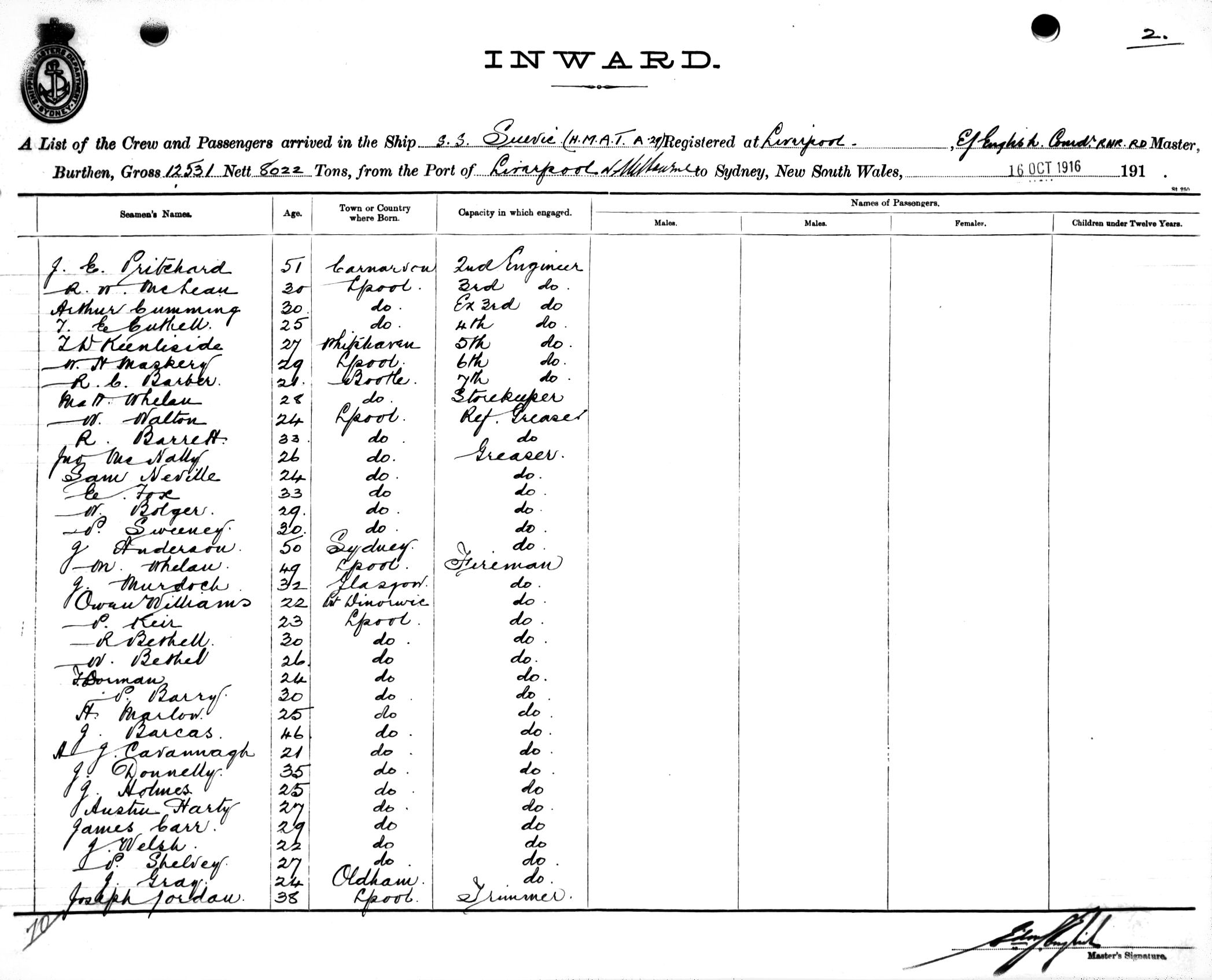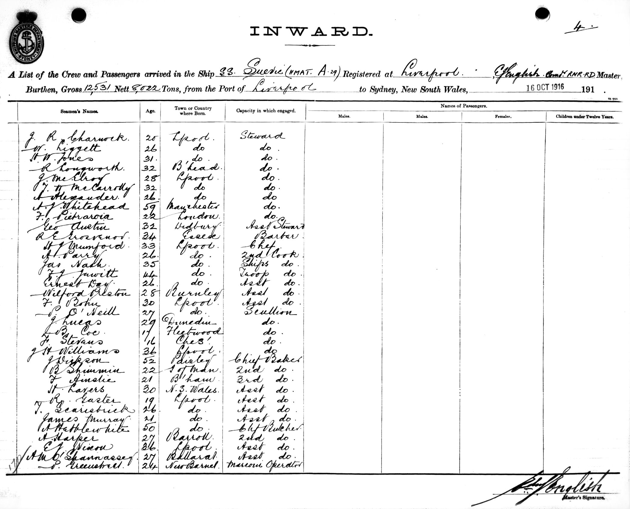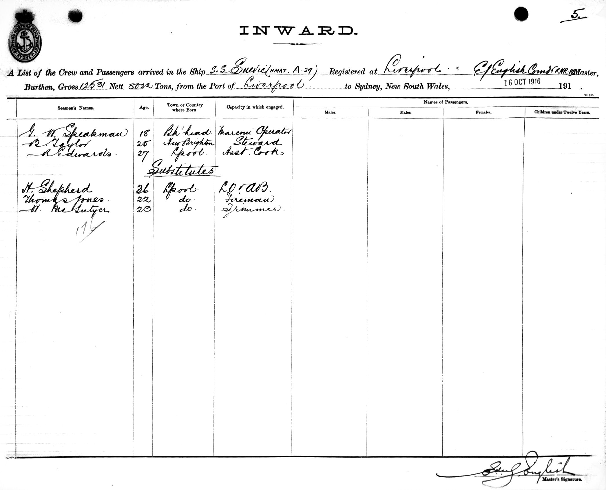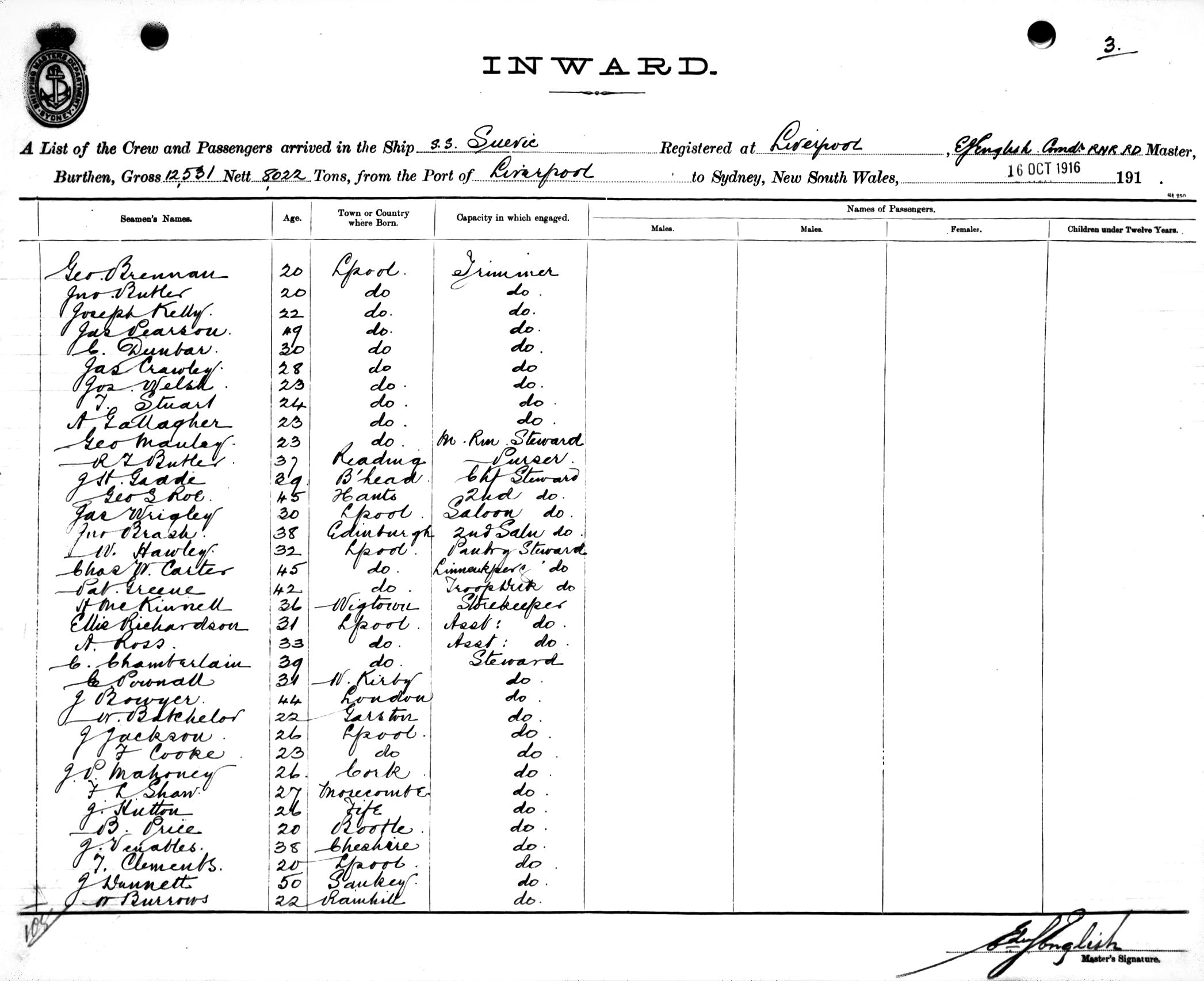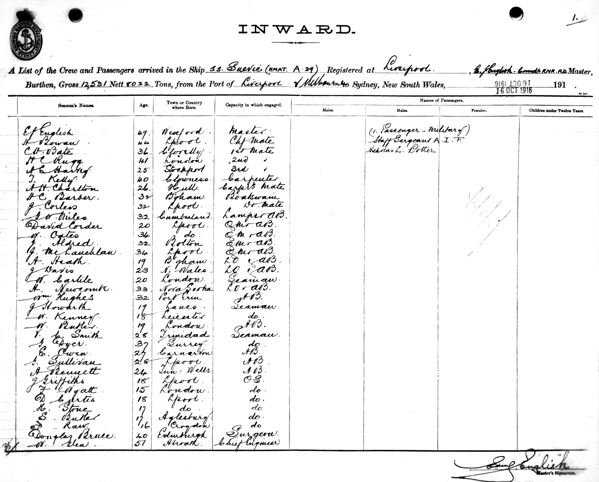 SUEVICOF LIVERPOOL, E. J. ENGLISH, MASTER, BURTHEN 12531/8022 TONS FROM THE PORT OF LIVERPOOL via MELBOURNE TO SYDNEY, NEW SOUTH WALES, 16TH OCTOBER 1916 |