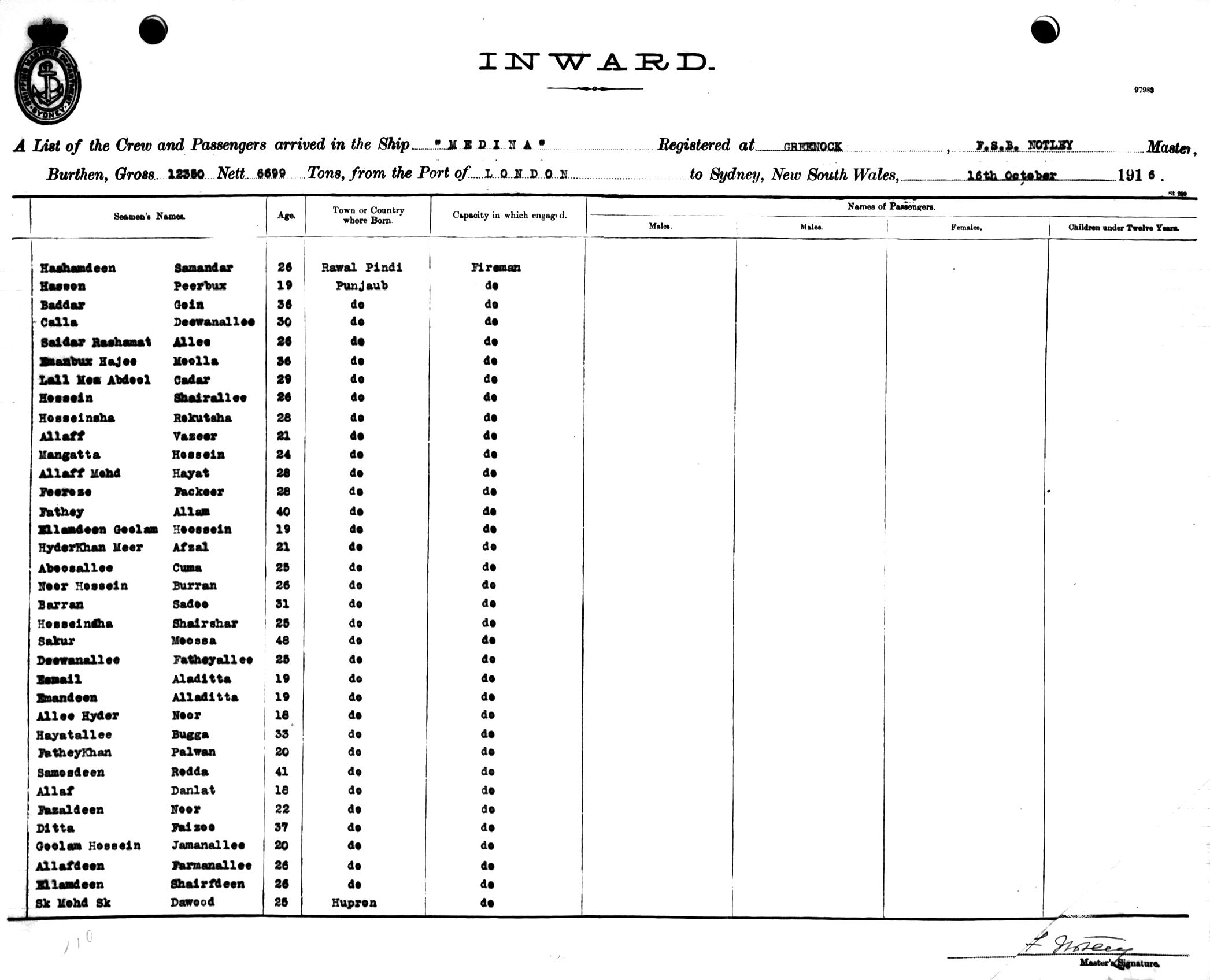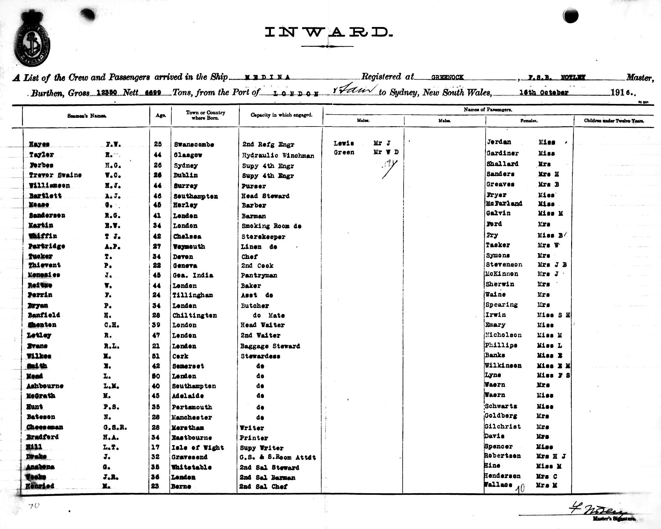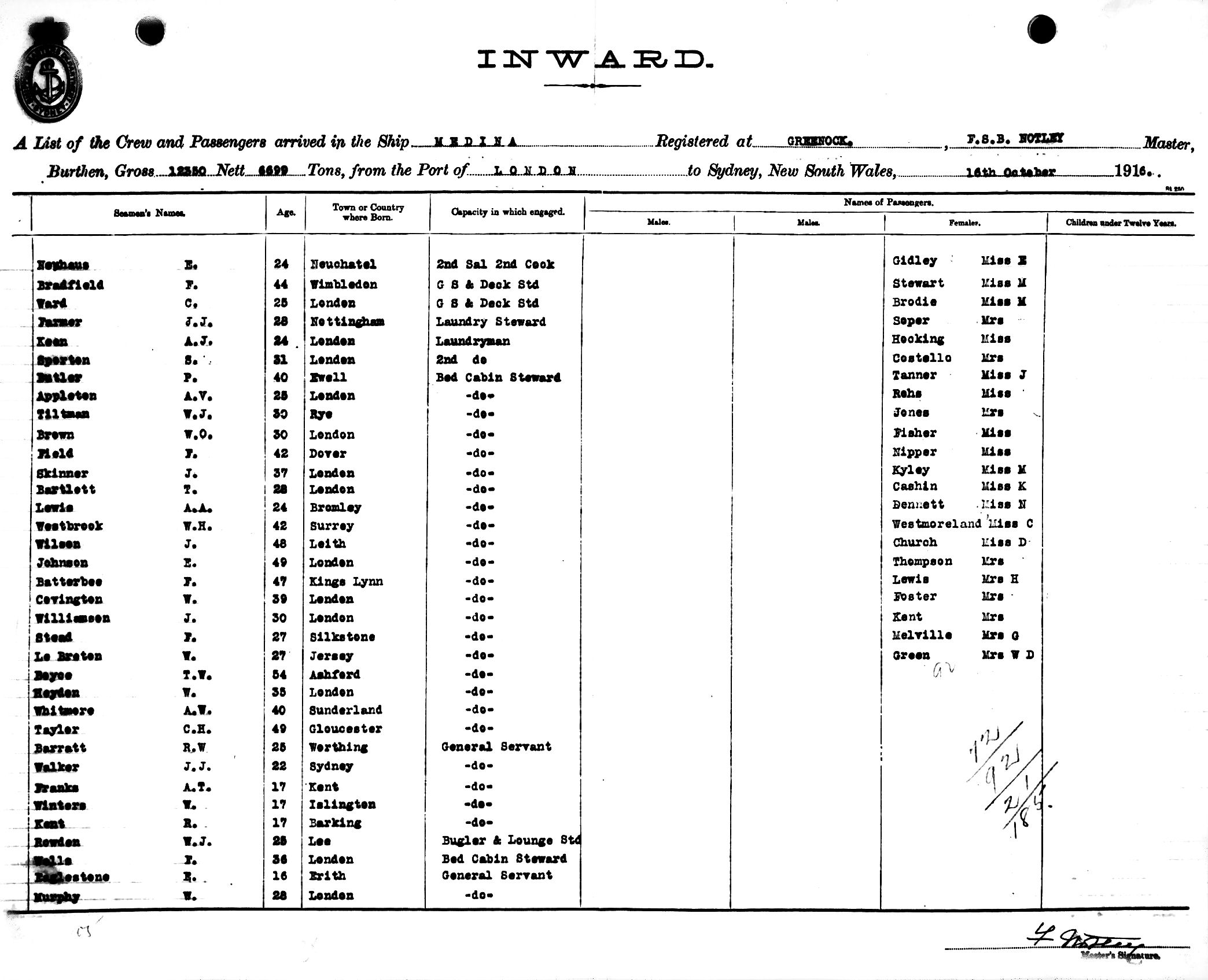 Mariners and ships in Australian Waters | MEDINAOF GREENOCK, F. S. B. NOTLEY, MASTER, BURTHEN 12350/6699 TONS FROM THE PORT OF LONDON via FREMANTLE, ADELAIDE & MELBOURNE TO SYDNEY, NEW SOUTH WALES, 16TH OCTOBER 1916 |