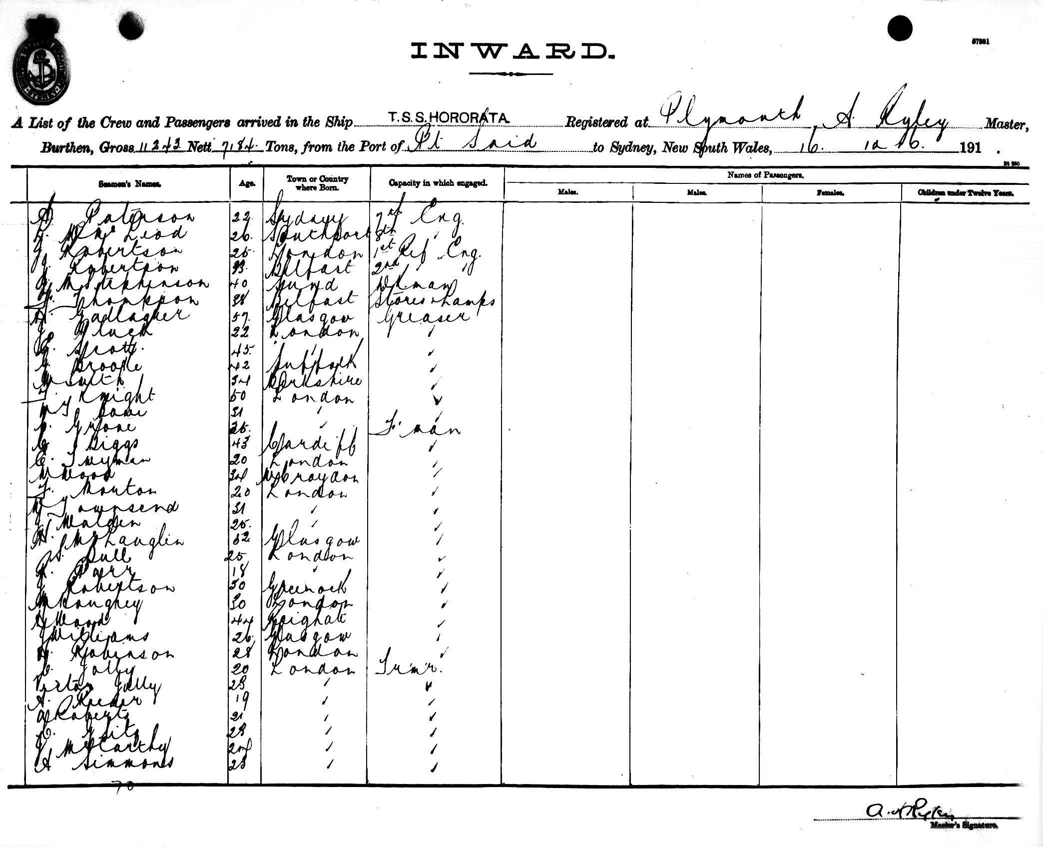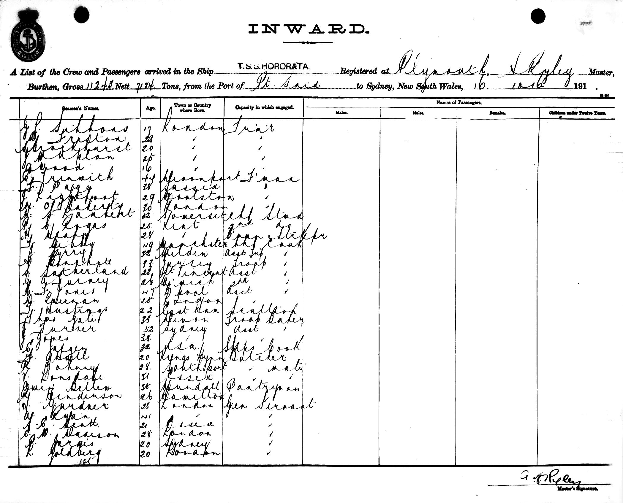 HORORATAOF PLYMOUTH, A. RYLEY, MASTER, BURTHEN 11234/7184 TONS FROM THE PORT OF PORT SAID TO SYDNEY, NEW SOUTH WALES, 16TH OCTOBER 1916 |