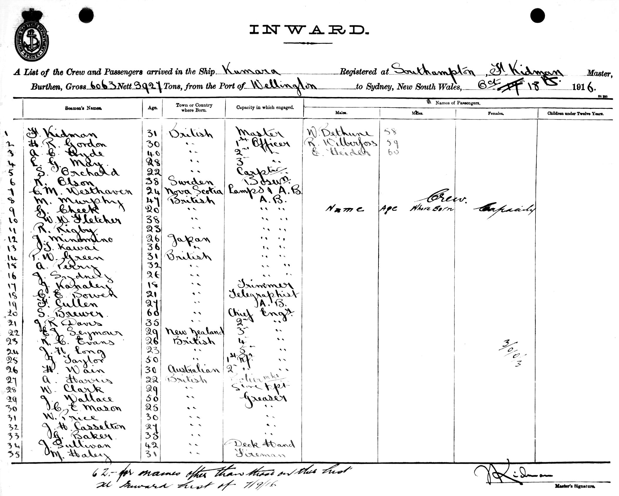 KUMARAOF SOUTHAMPTON, F. KIDMAN, MASTER, BURTHEN 6063/3927 TONS FROM THE PORT OF WELLINGTON TO SYDNEY, NEW SOUTH WALES, 18TH OCTOBER 1916 |