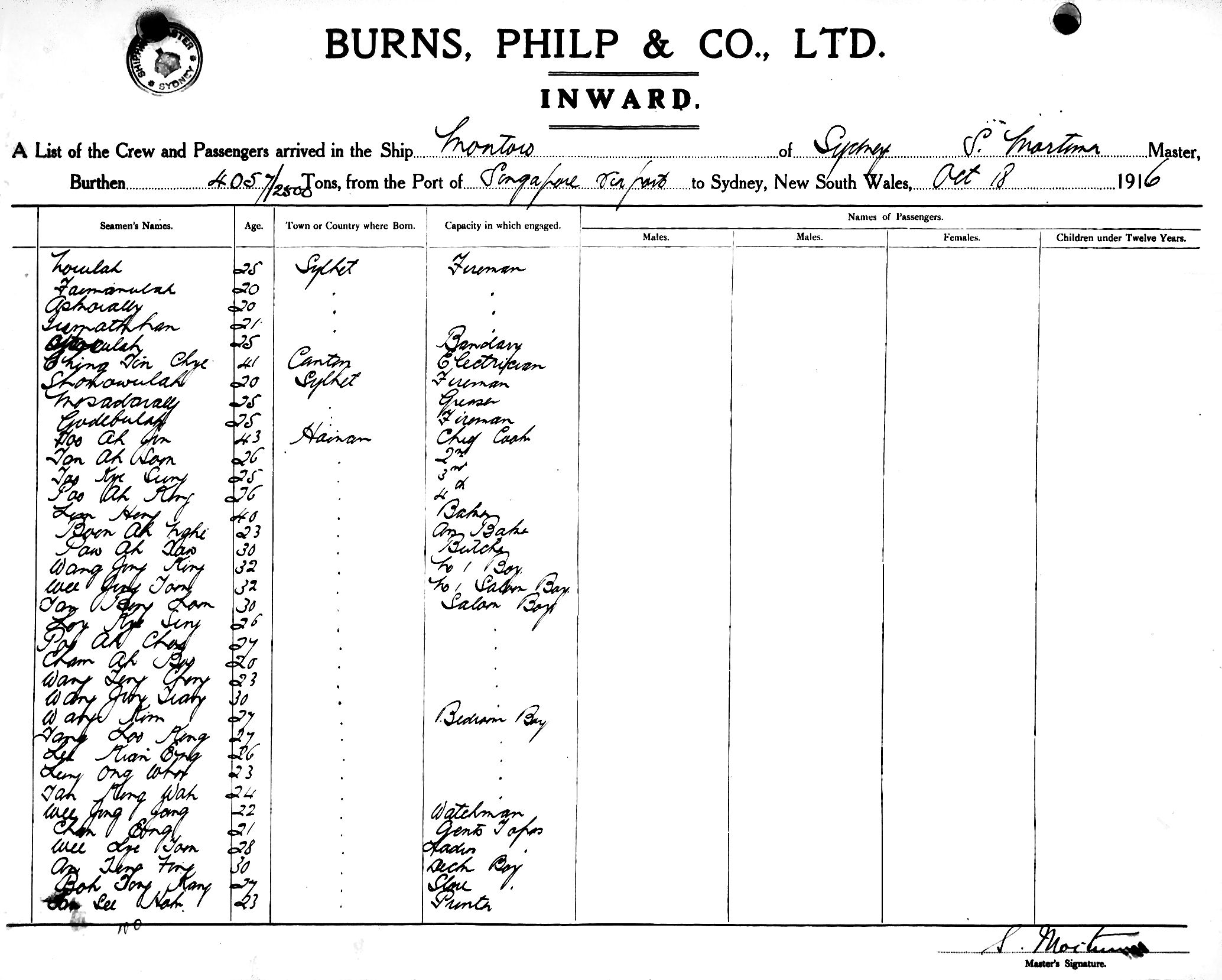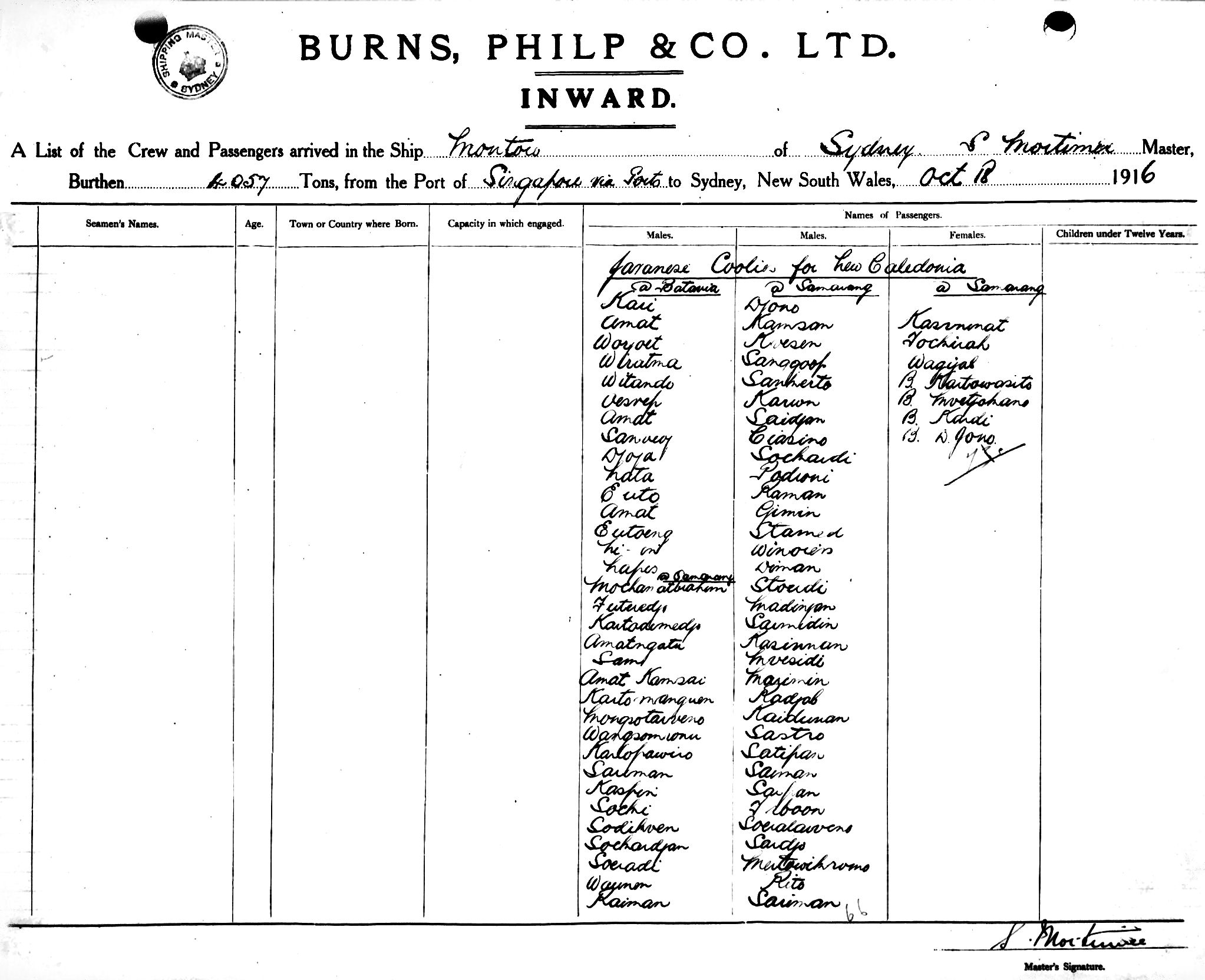 MONTOROOF SYDNEY, S. MORTIMER, MASTER, BURTHEN 4057/2500 TONS FROM THE PORT OF SINGAPORE via PORTS TO SYDNEY, NEW SOUTH WALES, 18TH OCTOBER 1916 |