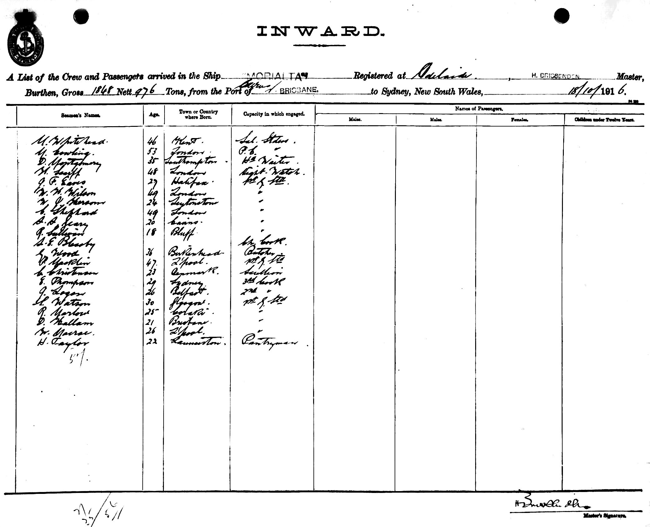 Mariners and ships in Australian Waters | MORIALTAOF ADELAIDE, H. BRISSENDEN, MASTER, BURTHEN 1848/976 TONS FROM THE PORT OF CAIRNS via BRISBANE TO SYDNEY, NEW SOUTH WALES, 18TH OCTOBER 1916 |