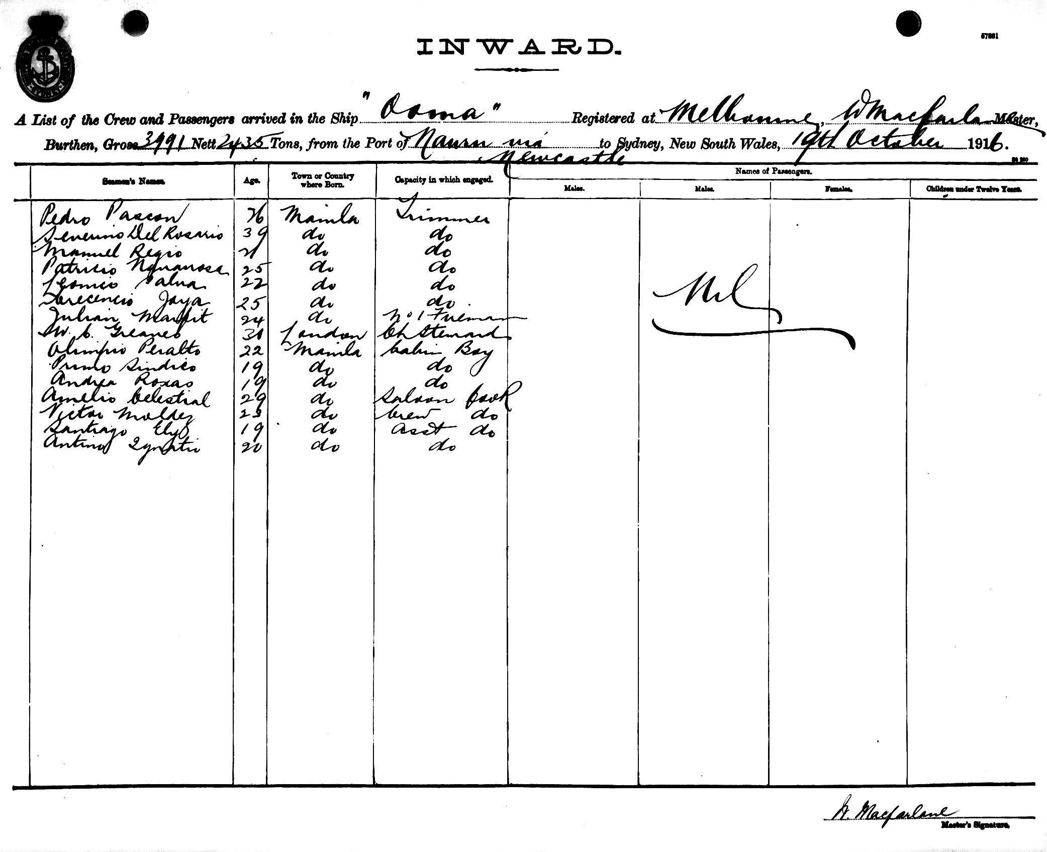 OOMAOF MELBOURNE, W. MACFARLANE, MASTER, BURTHEN 3991/2435 TONS FROM THE PORT OF NAURU via NEWCASTLE TO SYDNEY, NEW SOUTH WALES, 19TH OCTOBER 1916 |