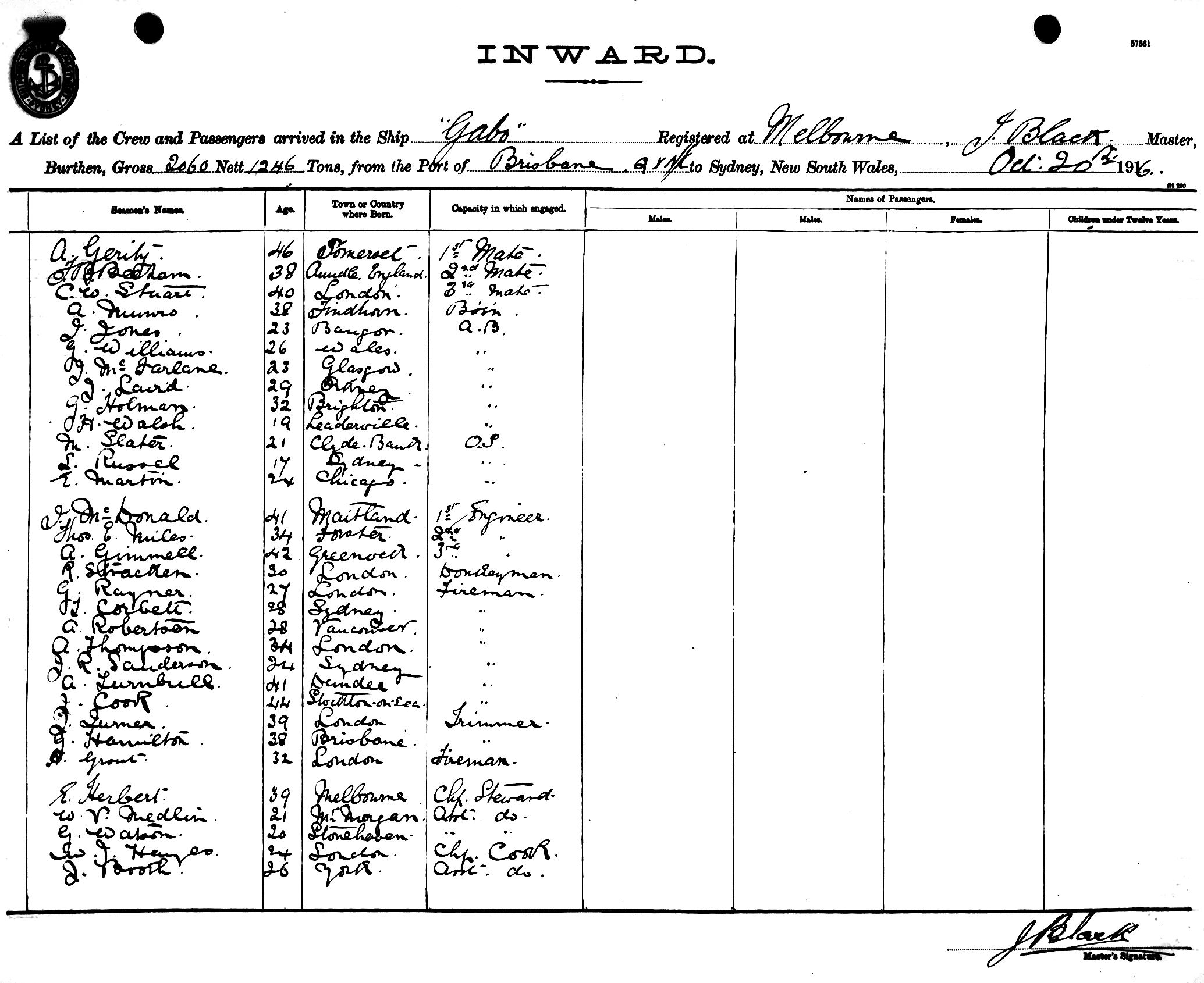 GABOOF MELBOURNE, J. BLACK, MASTER, BURTHEN 2060/1246 TONS FROM THE PORT OF BRISBANE TO SYDNEY, NEW SOUTH WALES, 20TH OCTOBER 1916 |