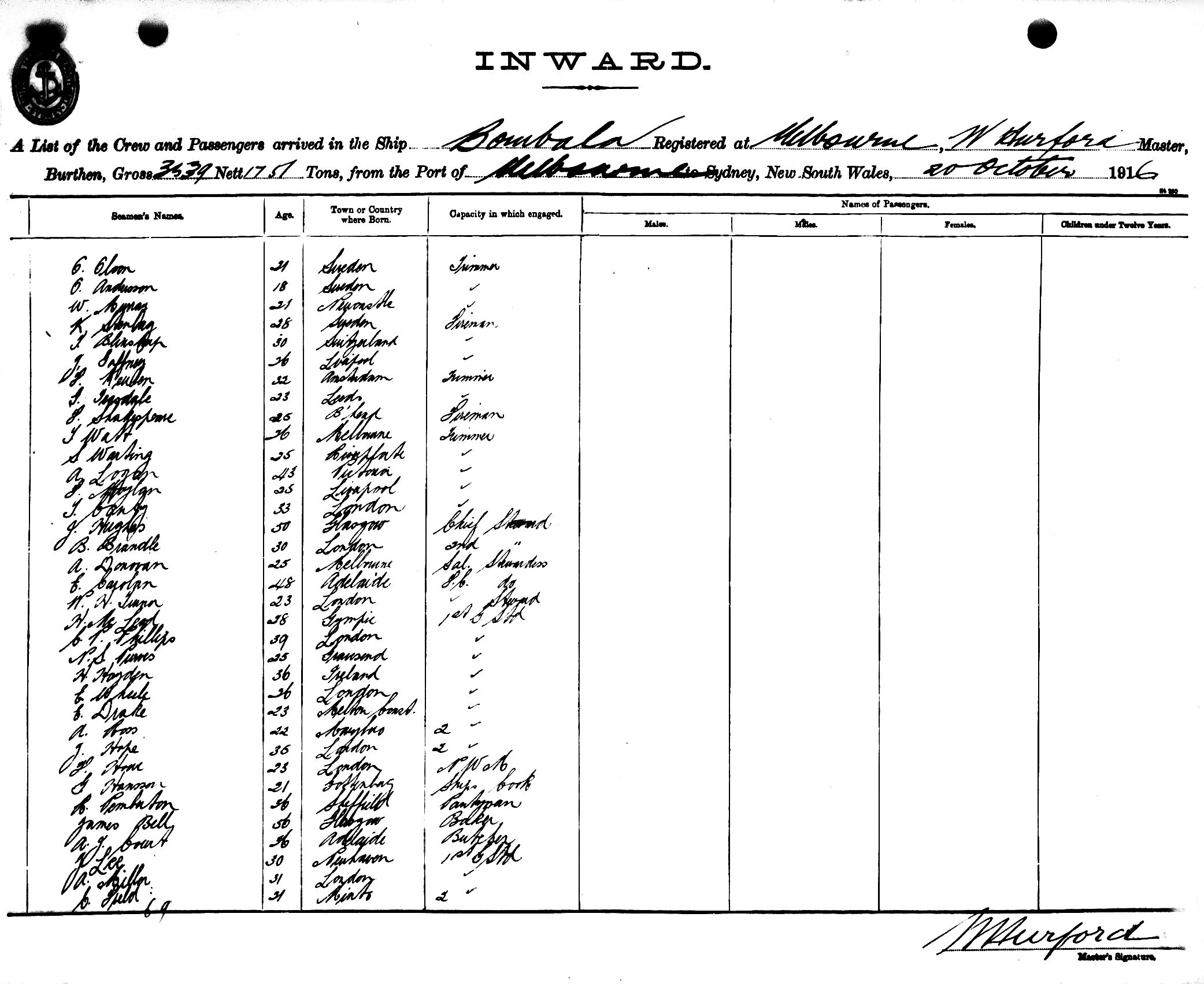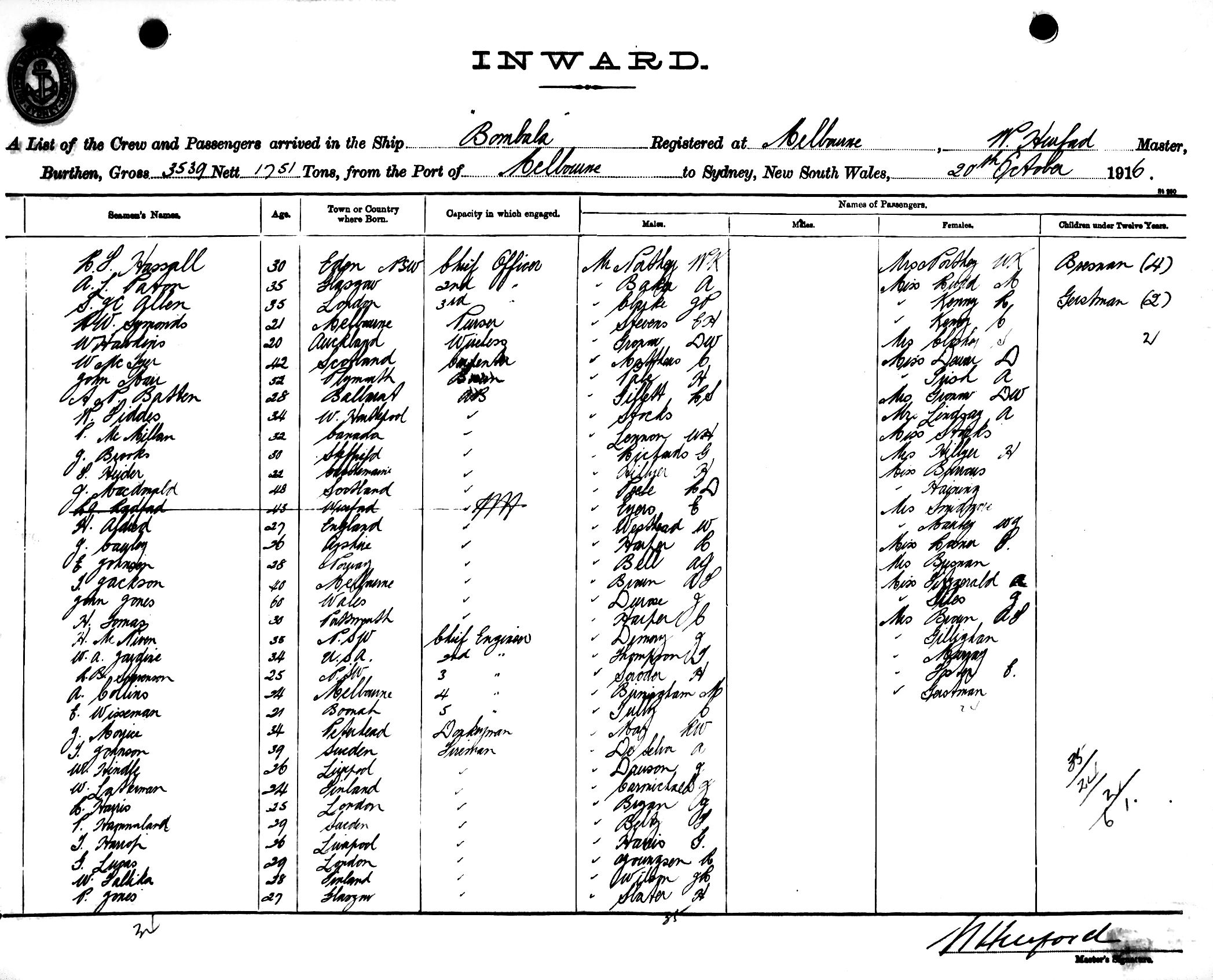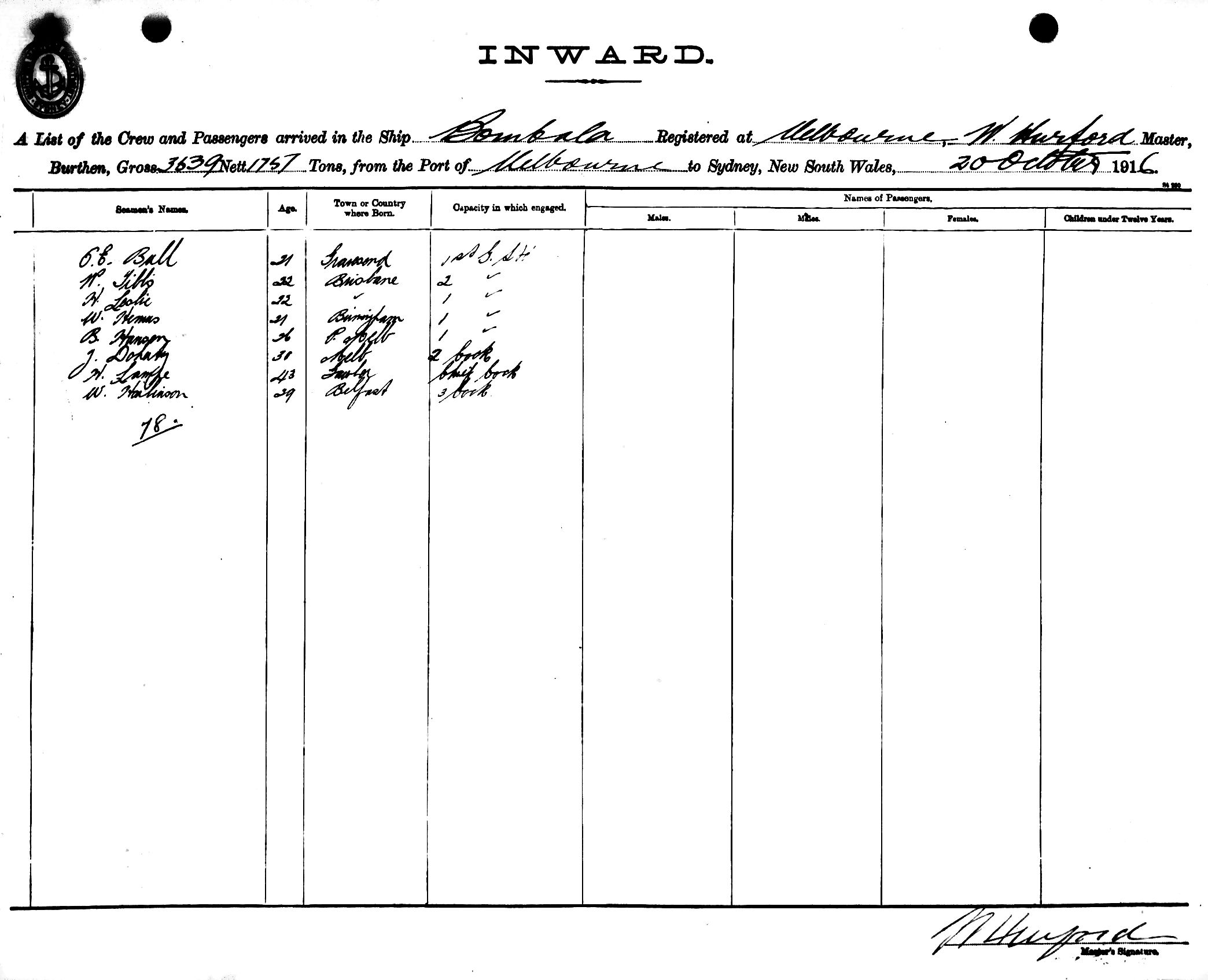 BOMBALAOF MELBOURNE, W. HURFORD, MASTER, BURTHEN 3539/1751 TONS FROM THE PORT OF MELBOURNE TO SYDNEY, NEW SOUTH WALES, 20TH OCTOBER 1916 |