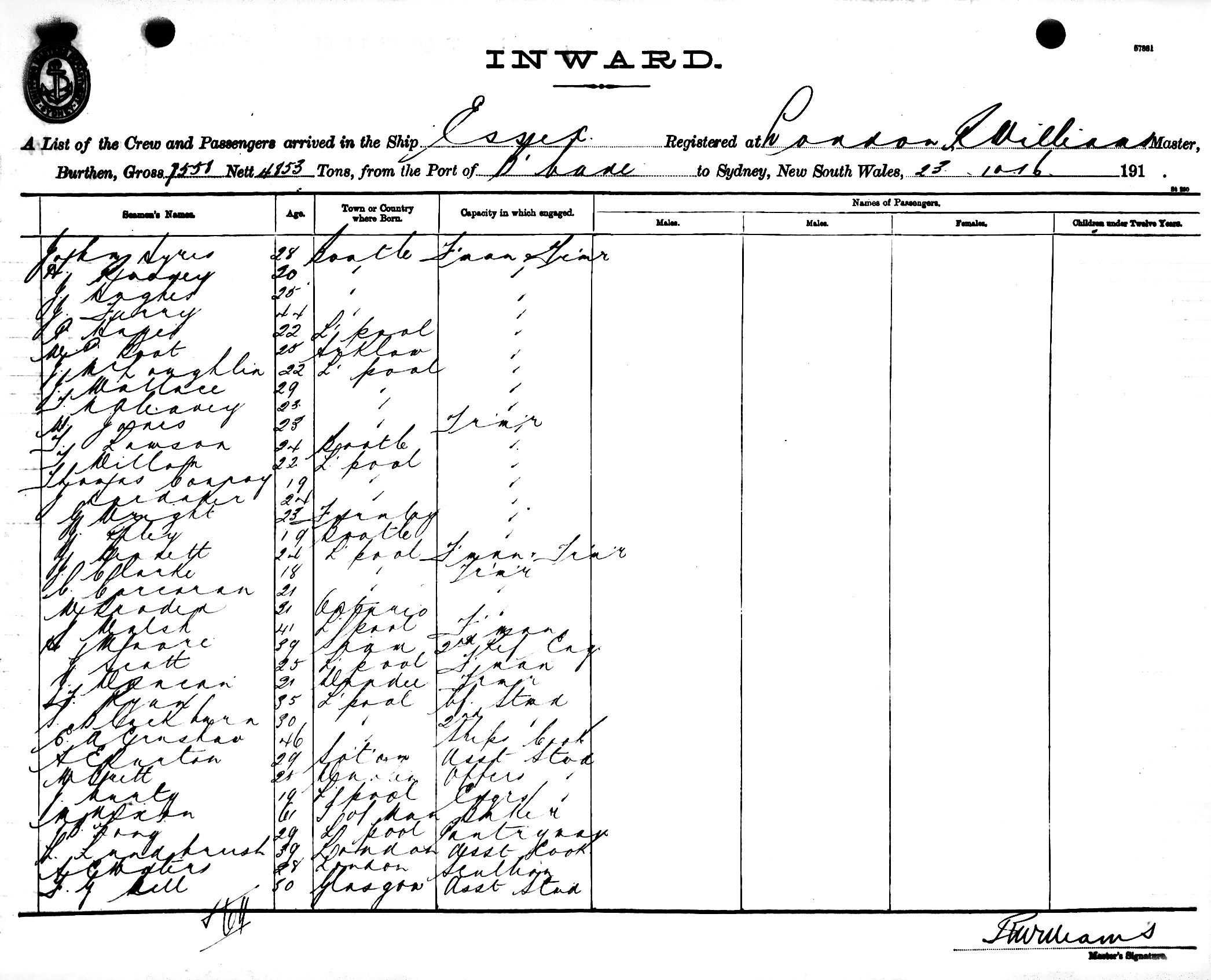 ESSEXOF LONDON, R. WILLIAMS, MASTER, BURTHEN 7558/4853 TONS FROM THE PORT OF BRISBANE TO SYDNEY, NEW SOUTH WALES, 23RD OCTOBER 1916 |
