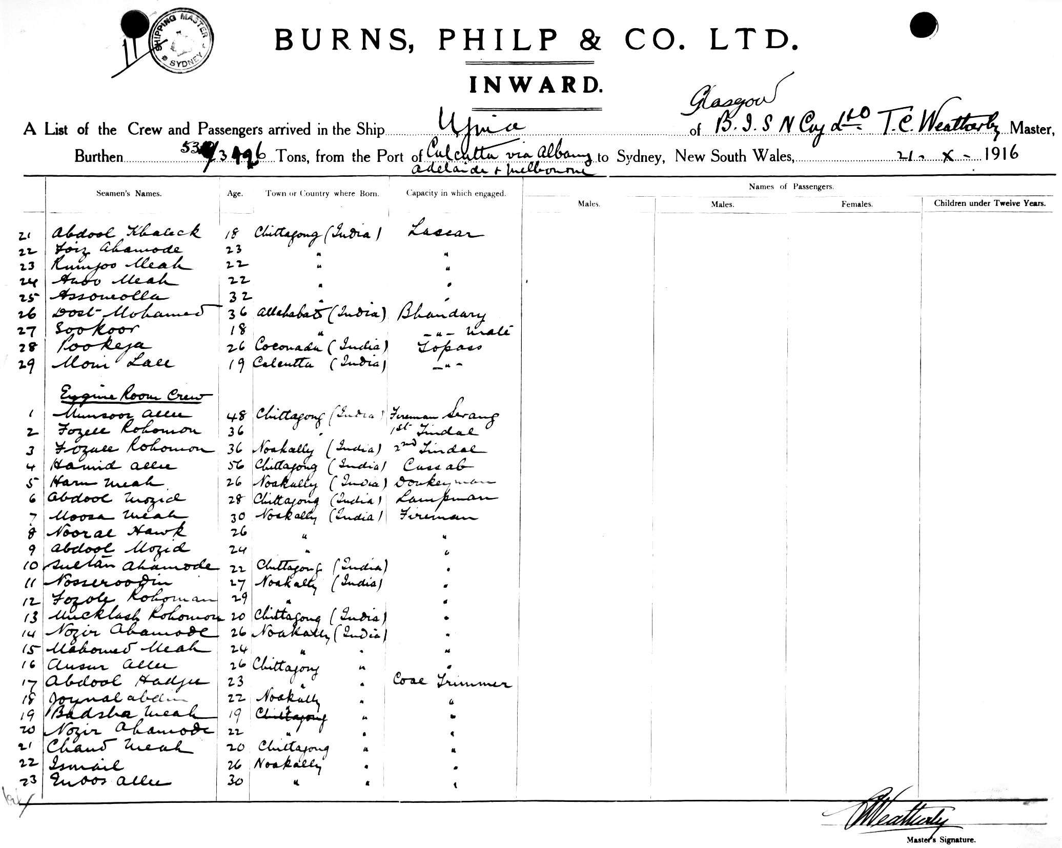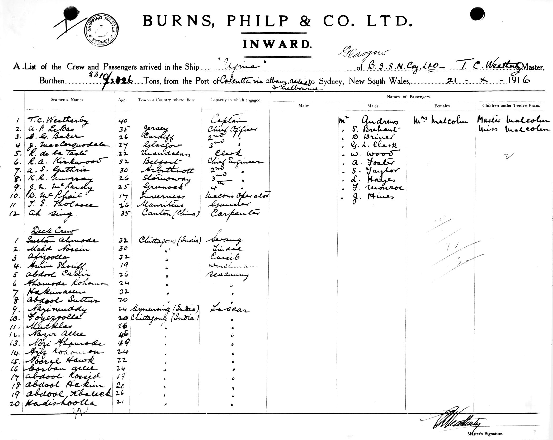 UJINAOF GLASGOW, T. C. WEATHERBY, MASTER, BURTHEN 5310/3426 TONS FROM THE PORT OF CALCUTTA via ALBANY, ADELAIDE & MELBOURNE TO SYDNEY, NEW SOUTH WALES, 21ST OCTOBER 1916 |