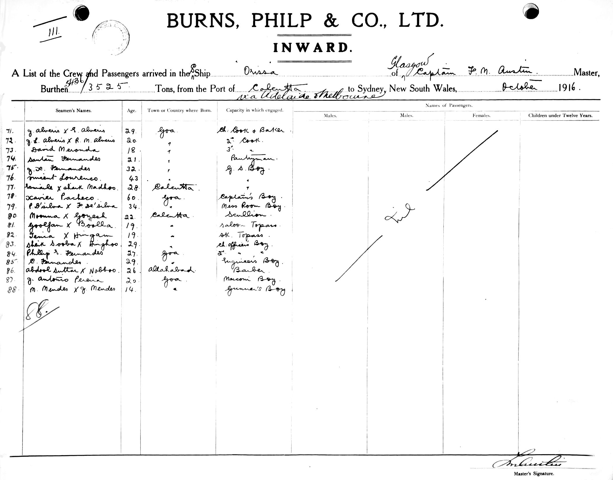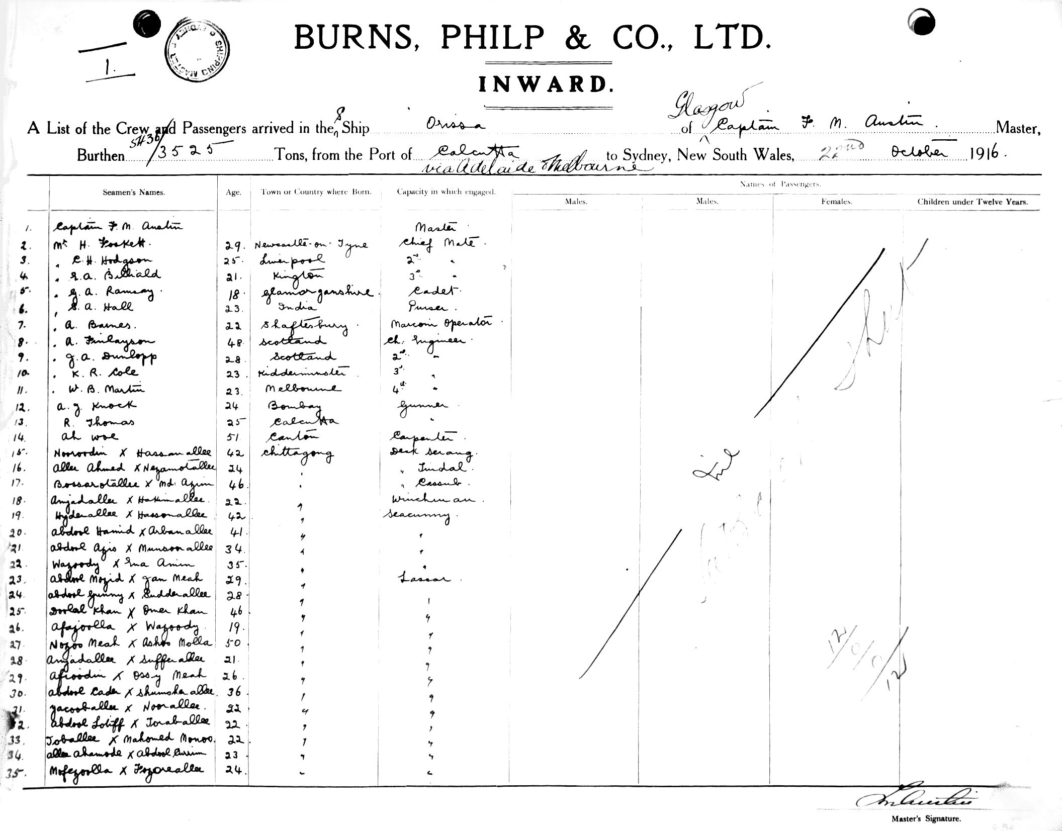 ORISSAOF GLASGOW, F. M. AUSTIN, MASTER, BURTHEN 5436/3525 TONS FROM THE PORT OF CALCUTTA via ADELAIDE & MELBOURNE TO SYDNEY, NEW SOUTH WALES, 22ND OCTOBER 1916 |