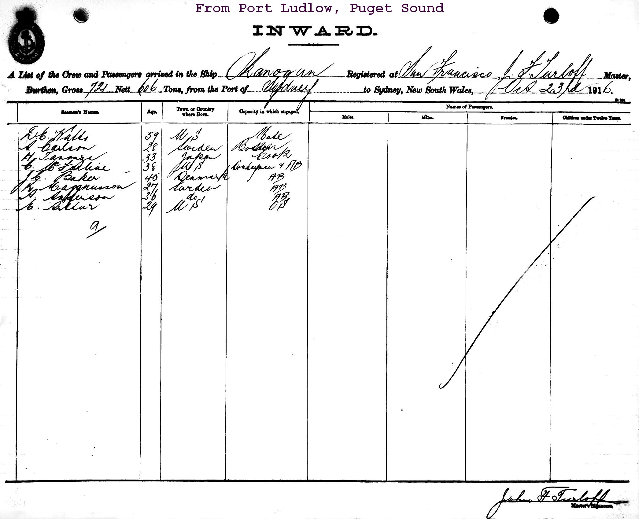 OKANOGANOF SAN FRANCISCO, J. F. TURLOFF, MASTER, BURTHEN 721/606 TONS FROM THE PORT OF PORT LUDLOW, U.S.A. TO SYDNEY, NEW SOUTH WALES, 23RD OCTOBER 1916 |
