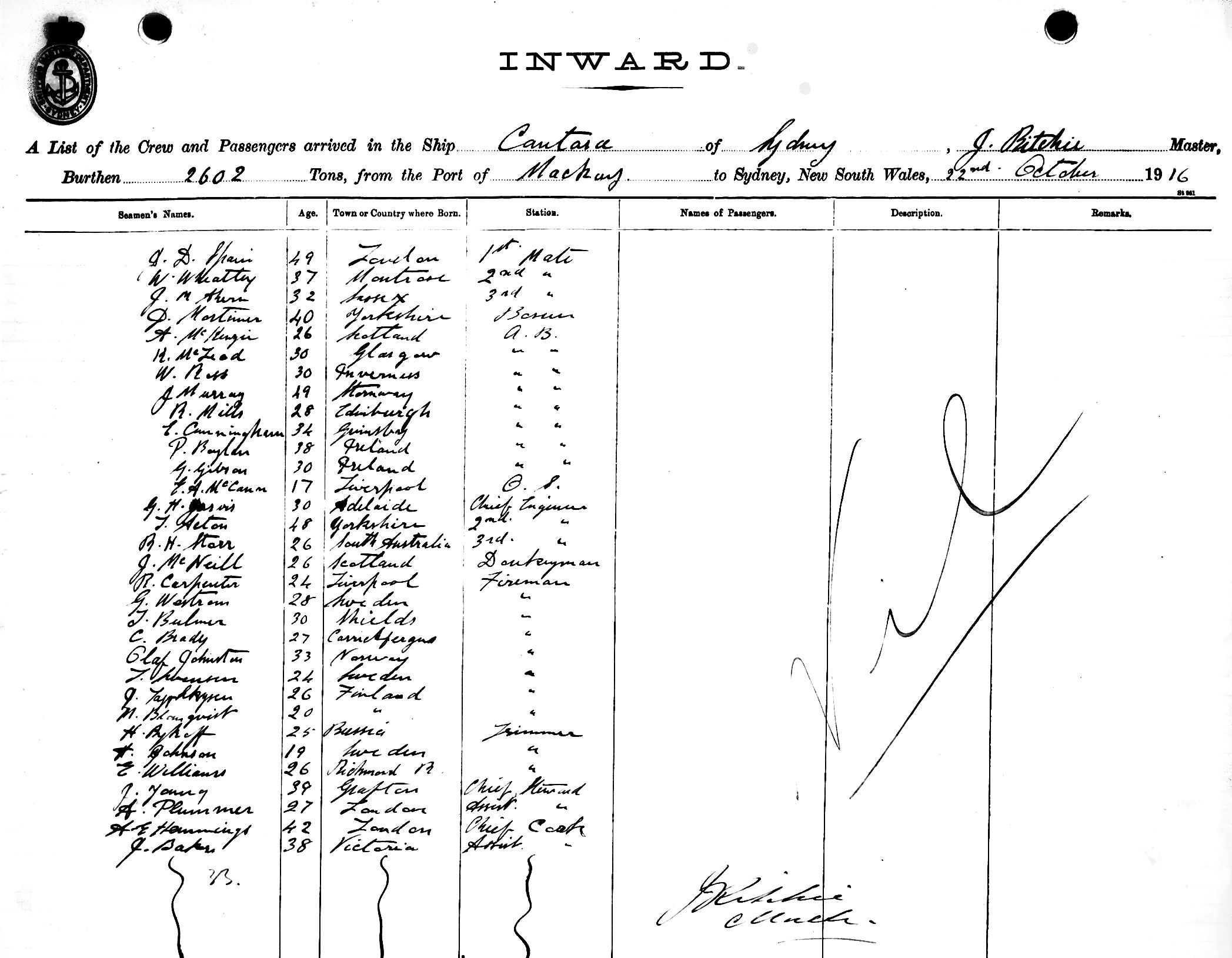 CANTARAOF SYDNEY, J. RITCHIE, MASTER, BURTHEN 2602 TONS FROM THE PORT OF MACKAY TO SYDNEY, NEW SOUTH WALES, 22ND OCTOBER 1916 |