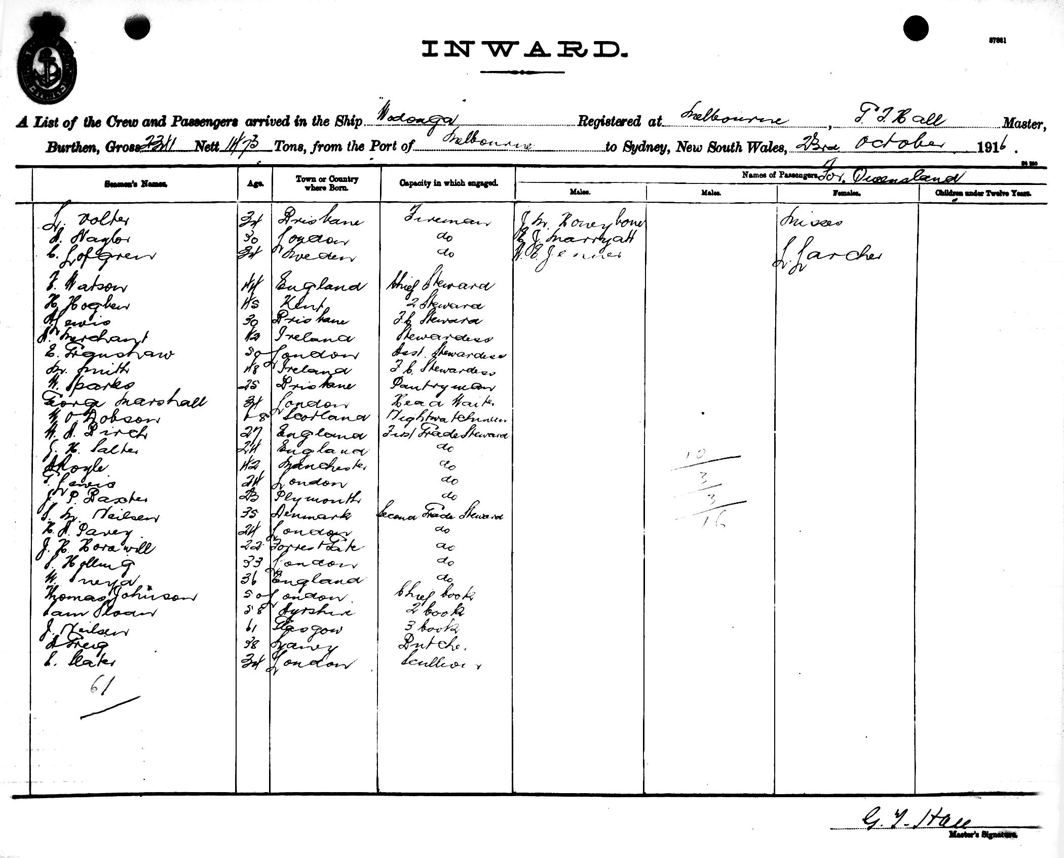 WODONGAOF MELBOURNE, G. T. HALL, MASTER, BURTHEN 2341/1473 TONS FROM THE PORT OF MELBOURNE TO SYDNEY, NEW SOUTH WALES, 23RD OCTOBER 1916 |