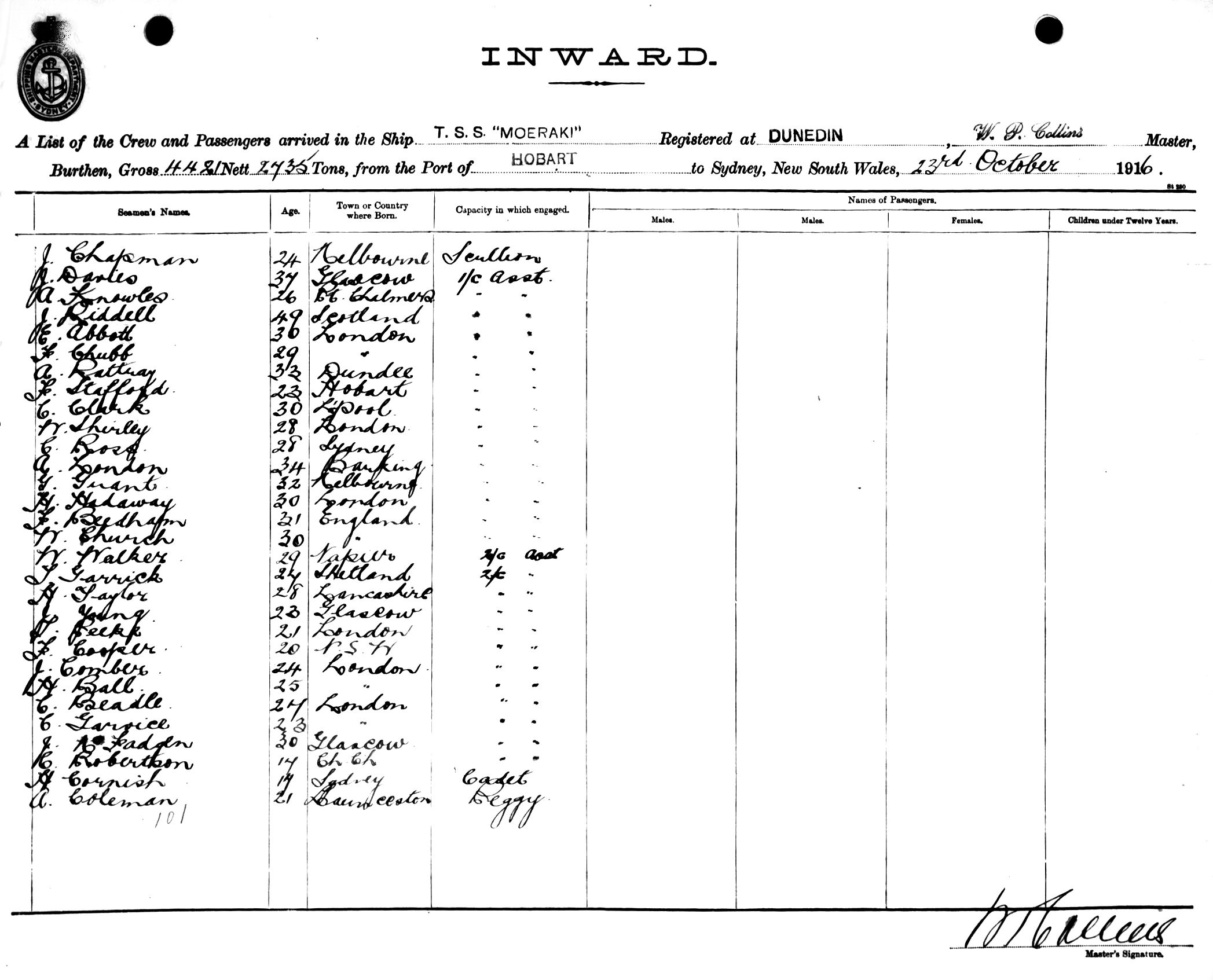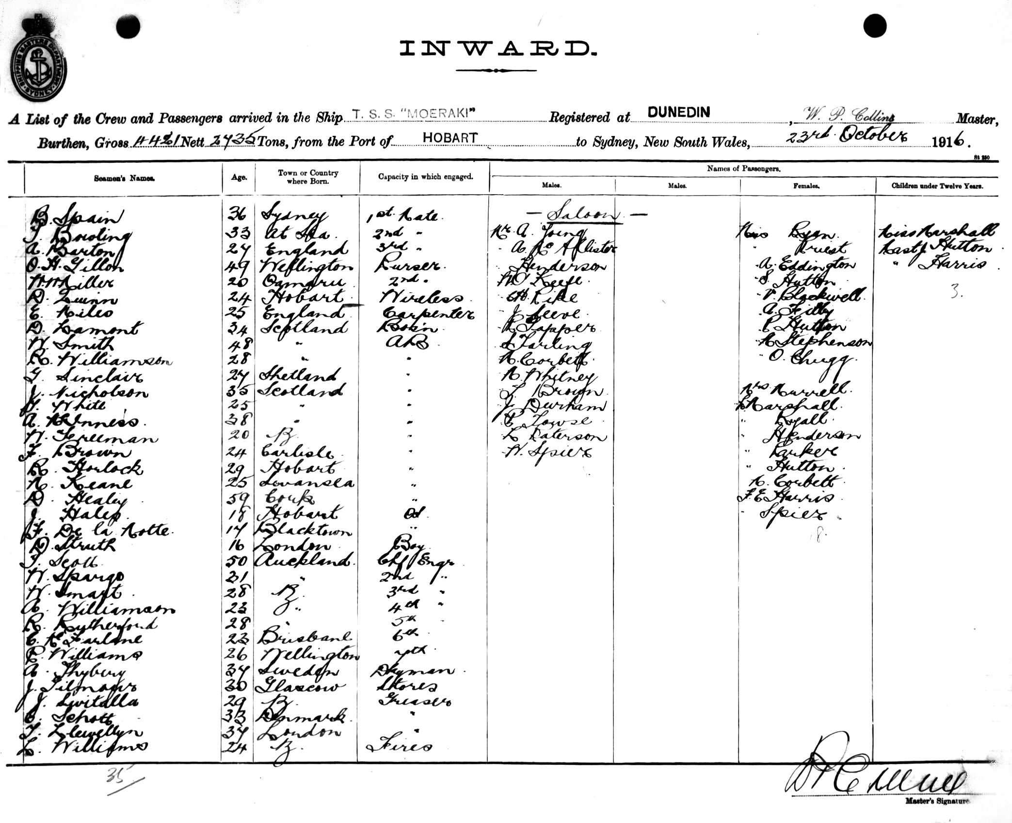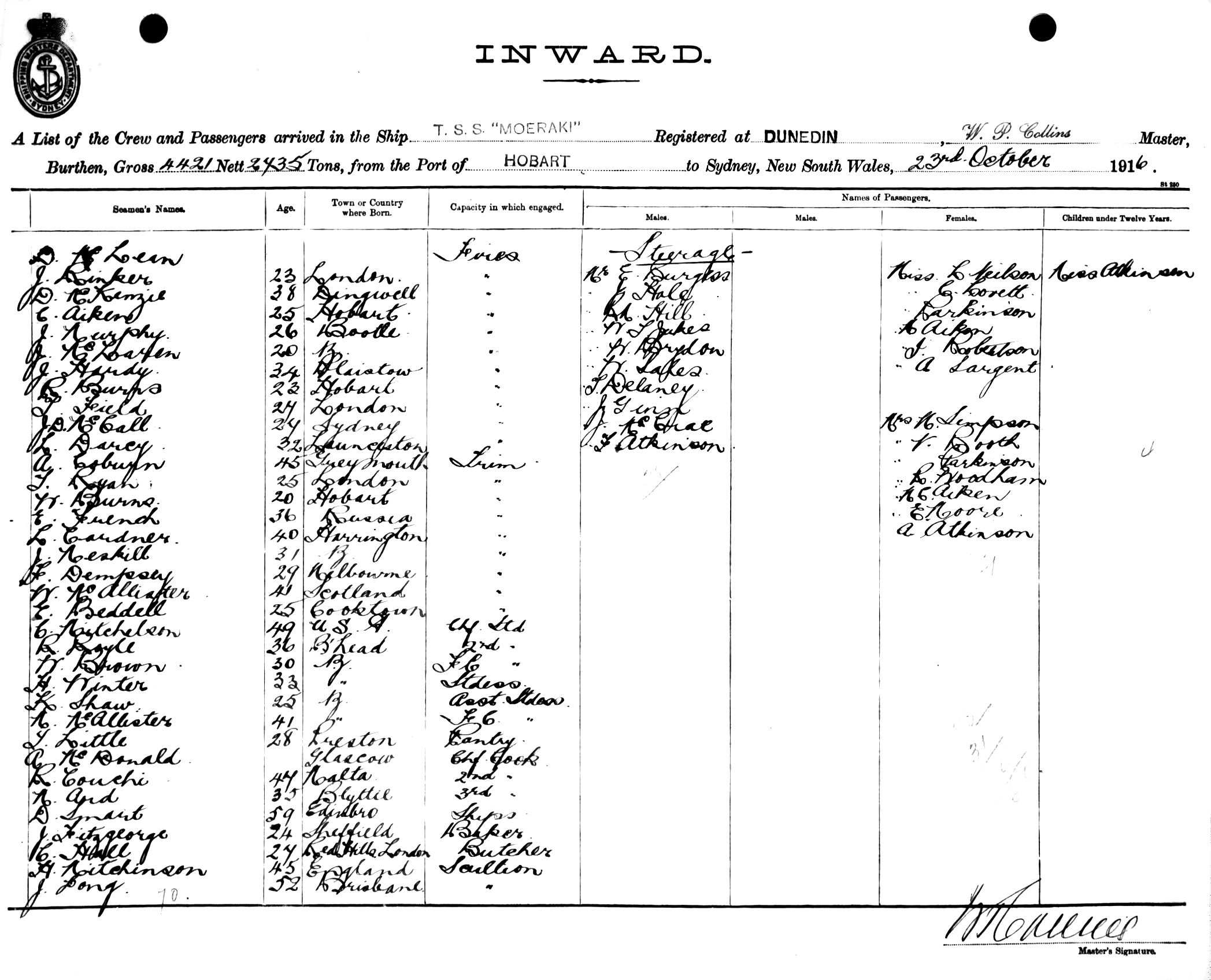 Mariners and ships in Australian Waters | MOERAKIOF DUNEDIN, W. P. COLLINS, MASTER, BURTHEN 4421/2435 TONS FROM THE PORT OF HOBART TO SYDNEY, NEW SOUTH WALES, 23RD OCTOBER 1916 |