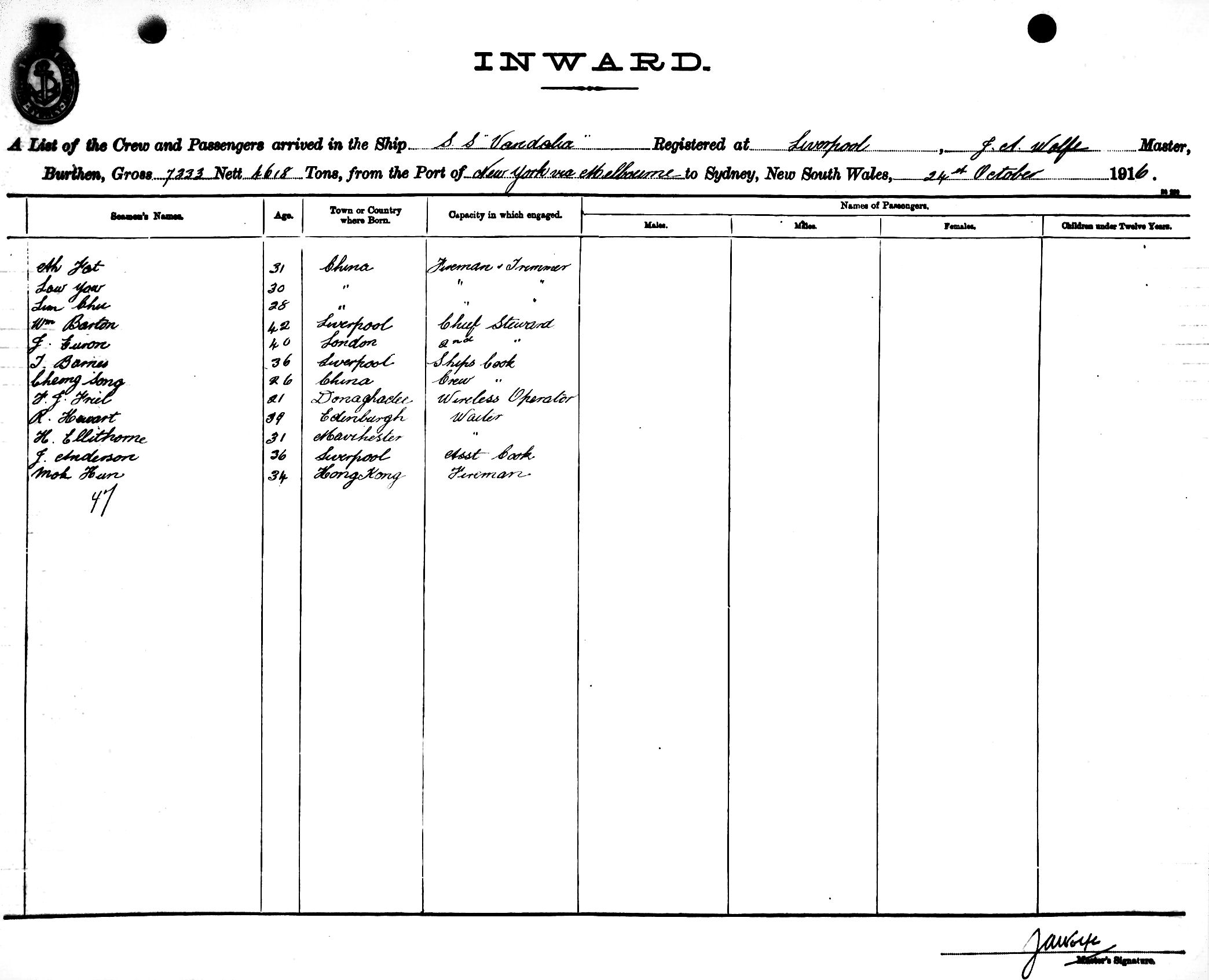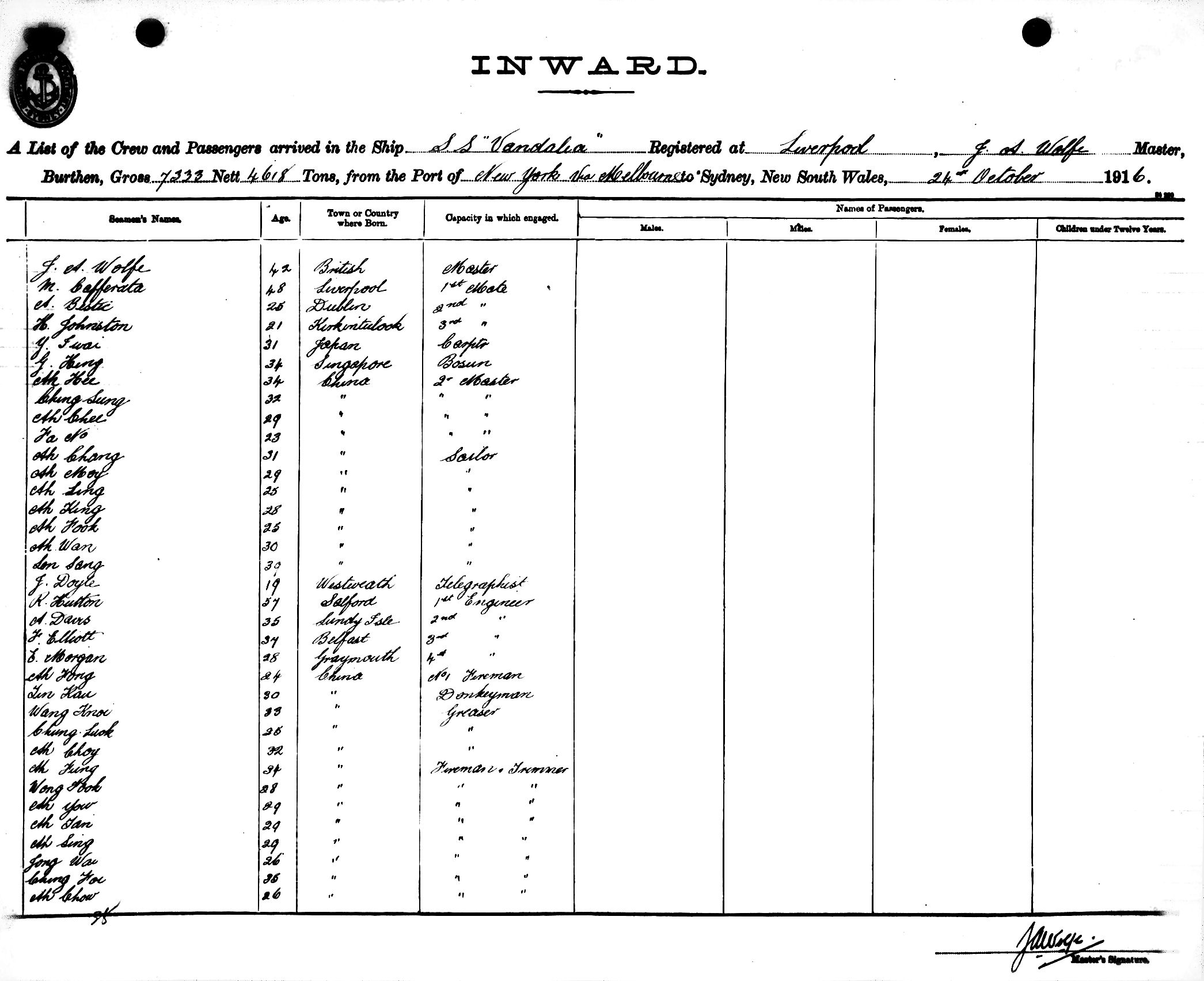 VANDALIAOF LIVERPOOL, J. A. WOLFE, MASTER, BURTHEN 7333/4618 TONS FROM THE PORT OF NEW YORK via MELBOURNE TO SYDNEY, NEW SOUTH WALES, 24TH OCTOBER 1916 |
