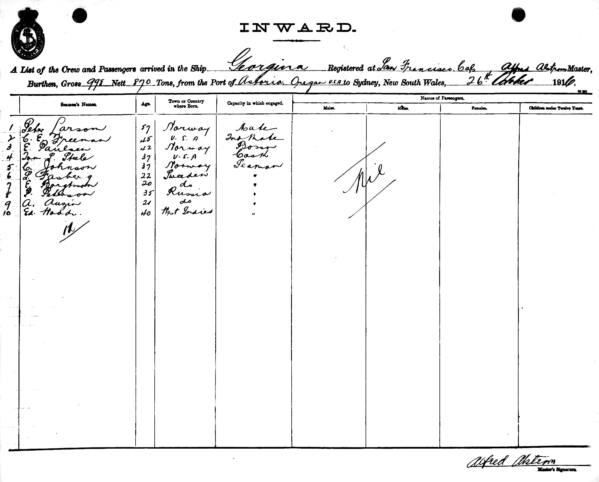 GEORGINAOF SAN FRANCISCO, ALFRED ALSTROM, MASTER, BURTHEN 998/870 TONS FROM THE PORT OF ASTORIA, OREGAN TO SYDNEY, NEW SOUTH WALES, 26TH OCTOBER 1916 |