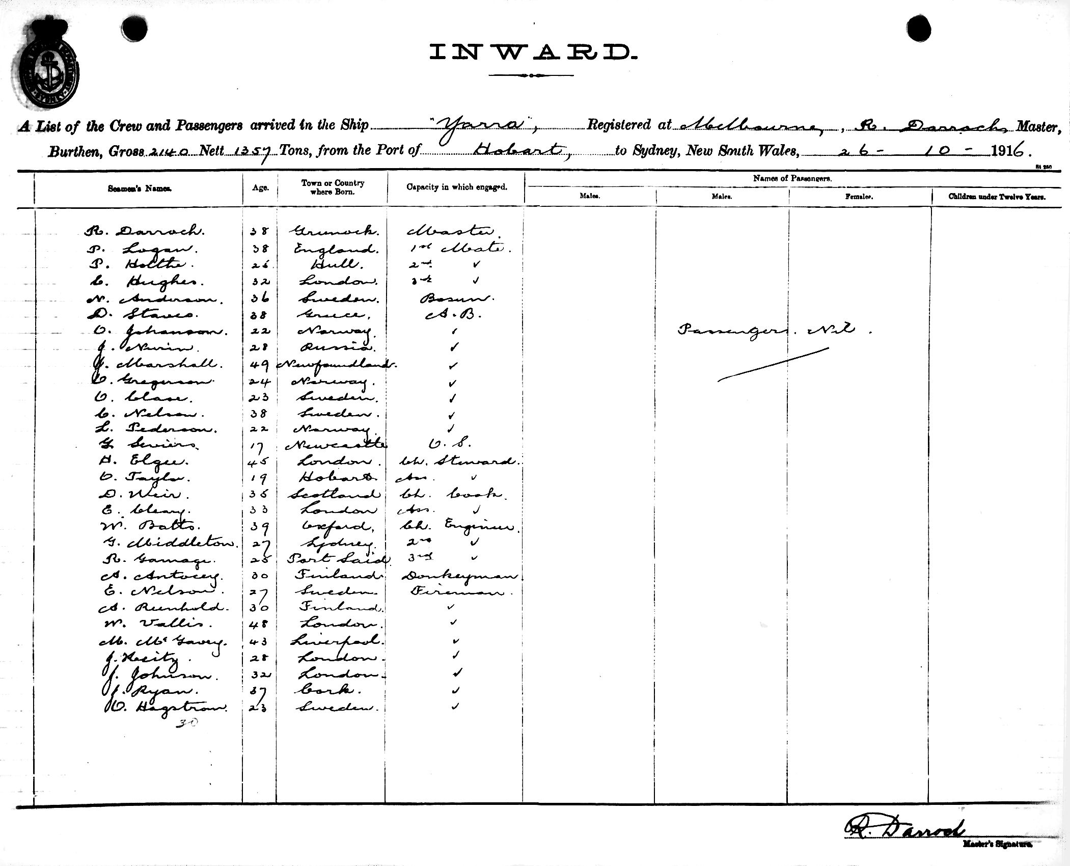 YARRAOF MELBOURNE, R. DARROCH, MASTER, BURTHEN 2140/1357 TONS FROM THE PORT OF HOBART TO SYDNEY, NEW SOUTH WALES, 26TH OCTOBER 1916 |