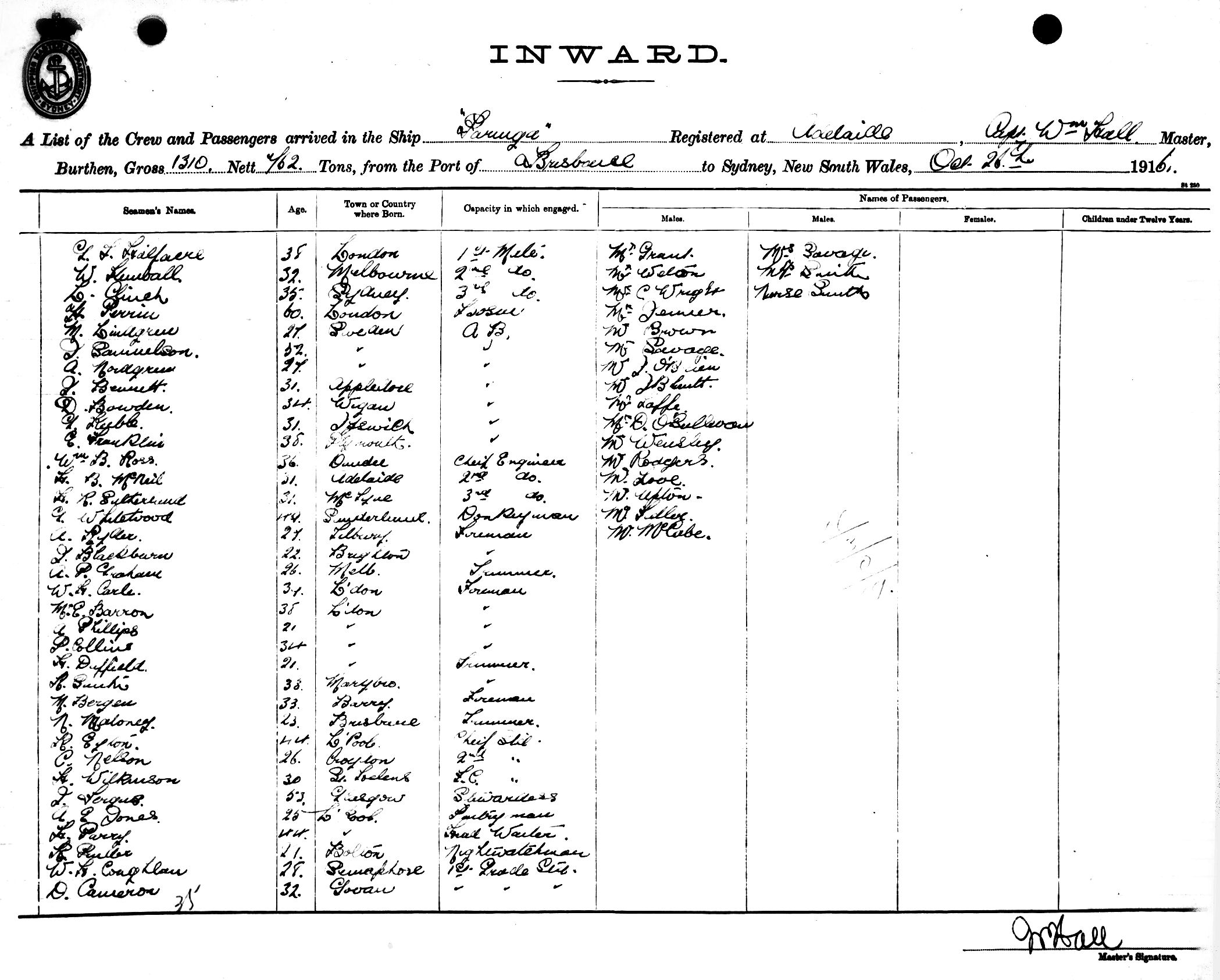 PARINGAOF ADELAIDE, WILLIAM HALL, MASTER, BURTHEN 1310/762 TONS FROM THE PORT OF BRISBANE TO SYDNEY, NEW SOUTH WALES, 26TH OCTOBER 1916 |