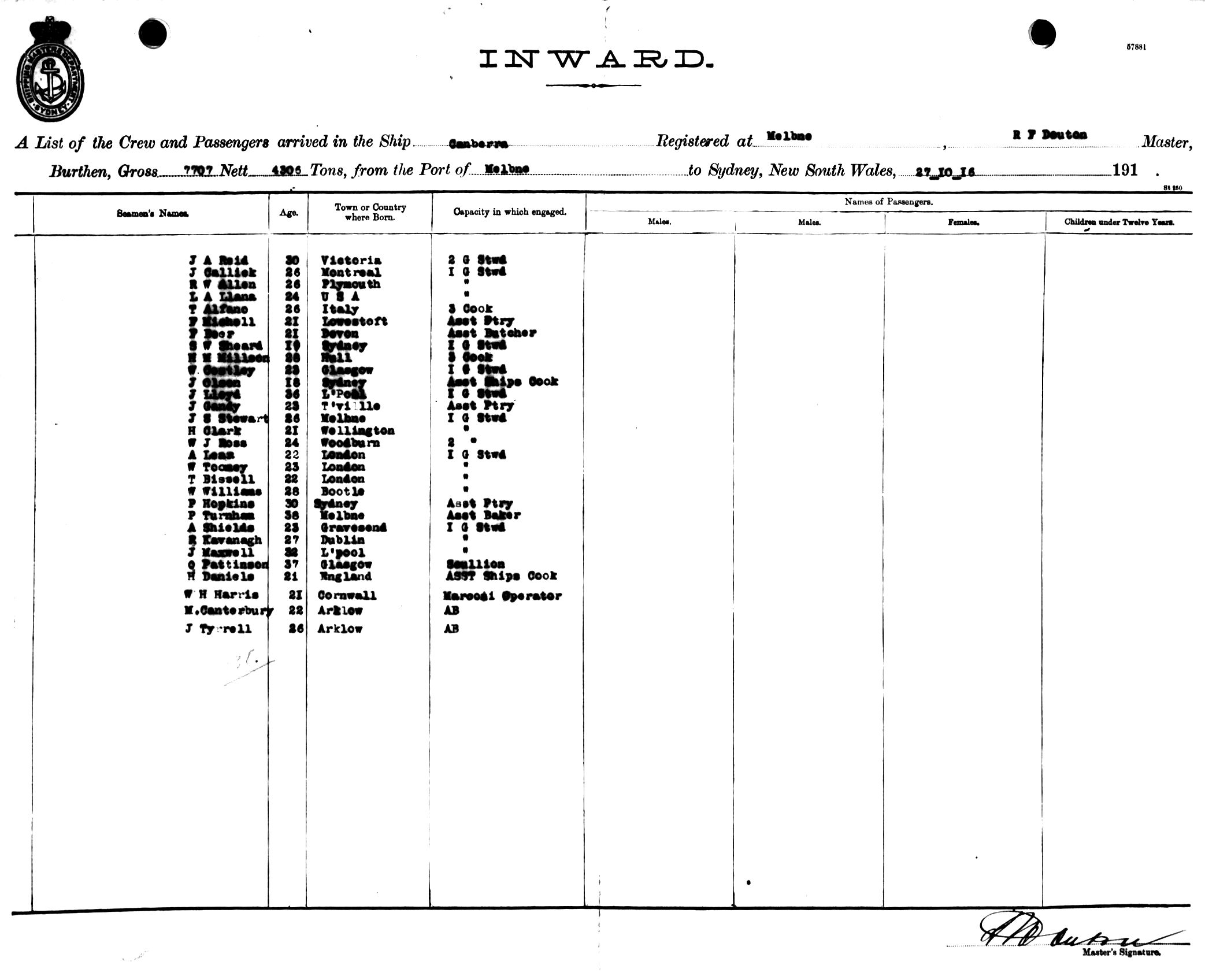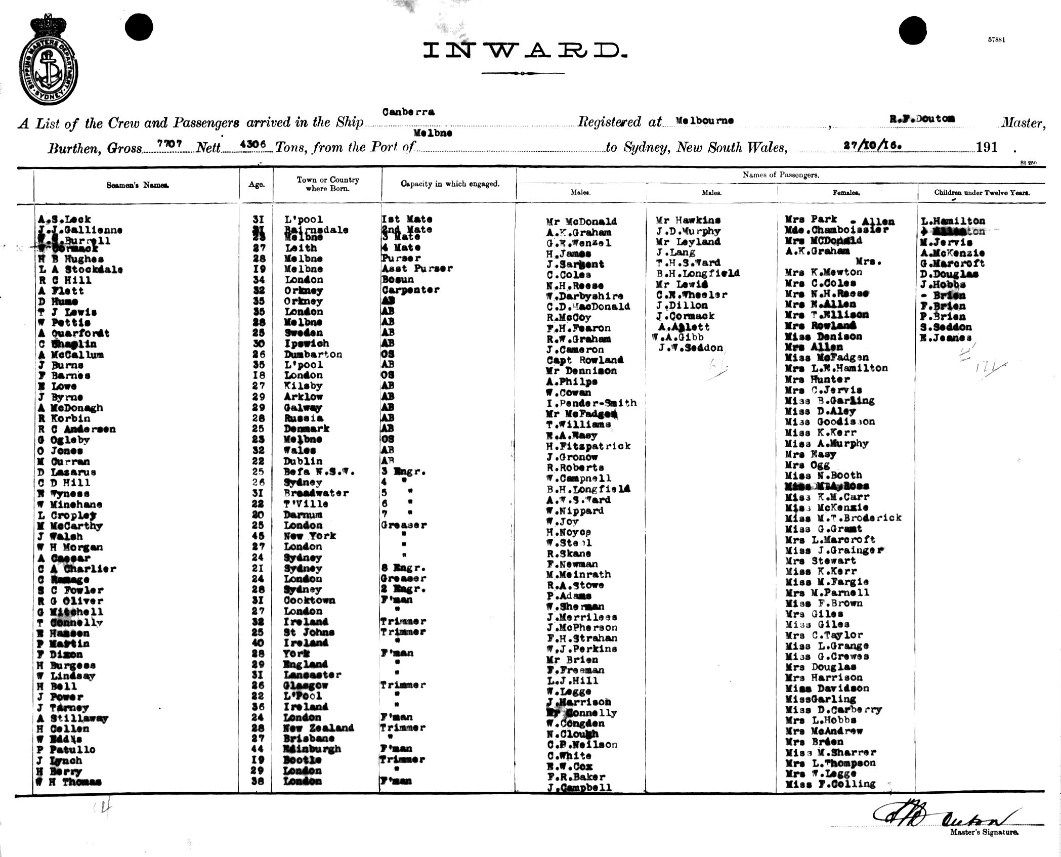 CANBERRAOF MELBOURNE, R. F. DOUTON, MASTER, BURTHEN 7707/4306 TONS FROM THE PORT OF MELBOURNE TO SYDNEY, NEW SOUTH WALES, 27TH OCTOBER 1916 |