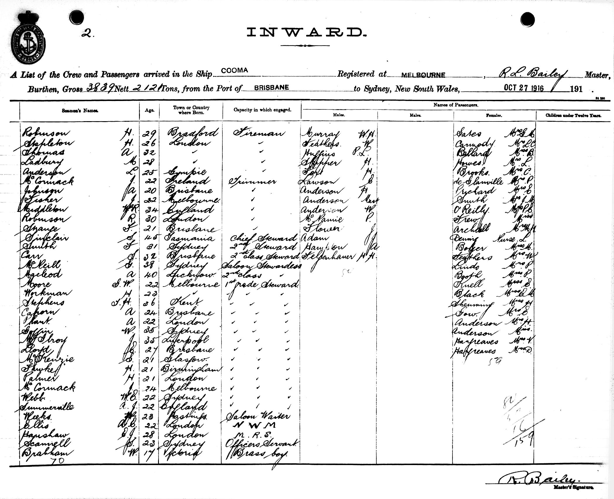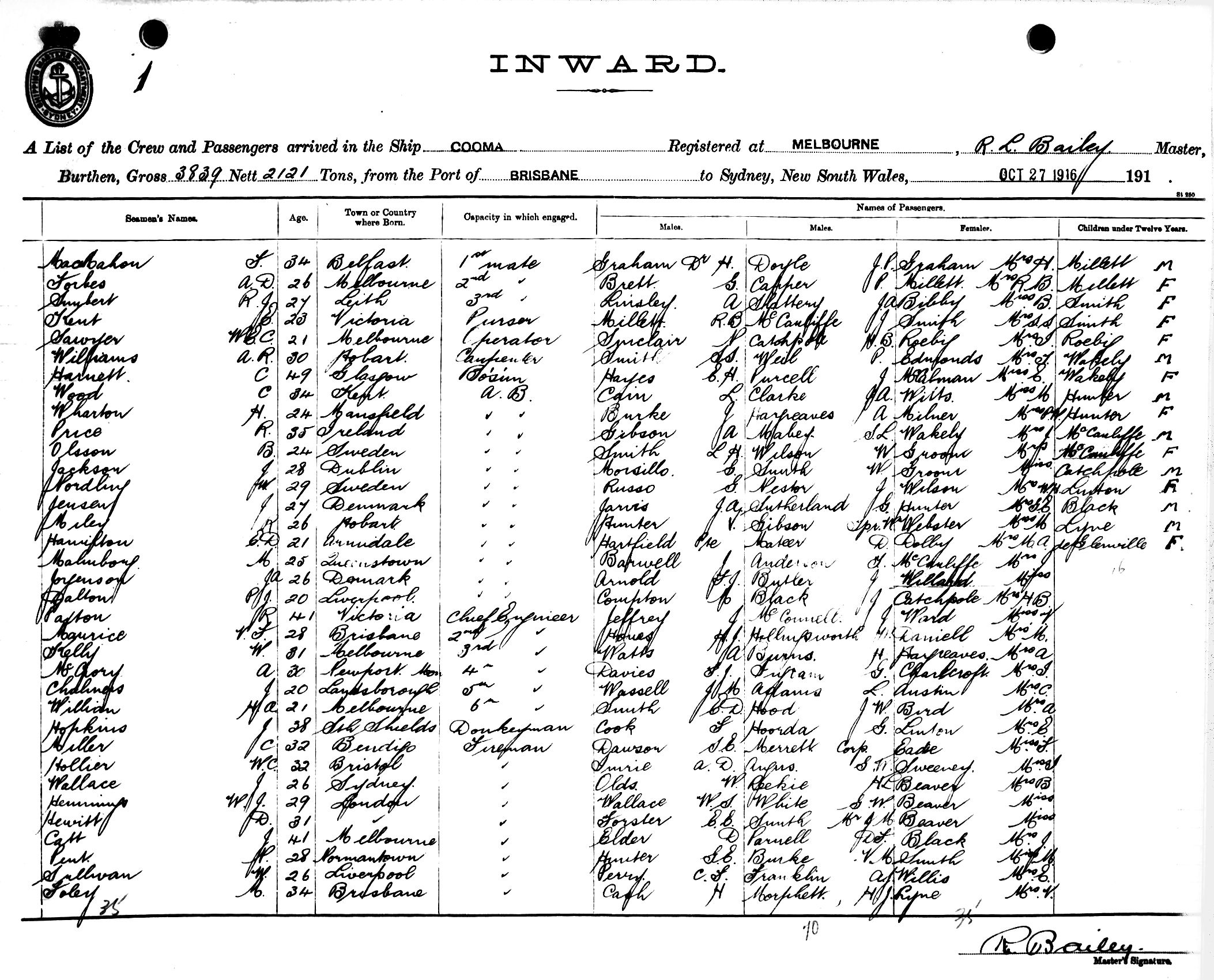 Mariners and ships in Australian Waters | COOMAOF MELBOURNE, R. L. BAILEY, MASTER, BURTHEN 3839/2121 TONS FROM THE PORT OF BRISBANE TO SYDNEY, NEW SOUTH WALES, 27TH OCTOBER 1916 |