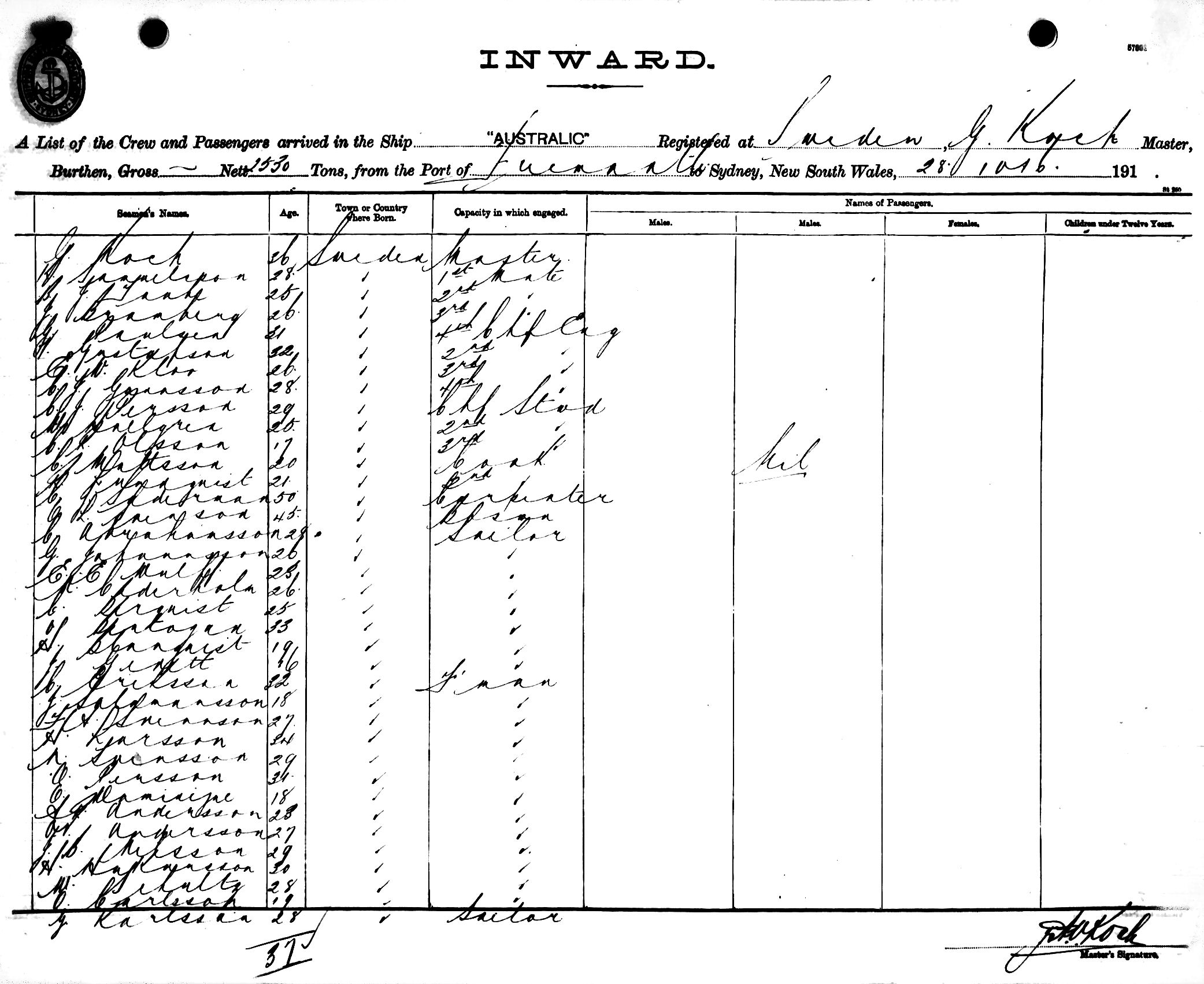 AUSTRALICOF SWEDEN, G. KOCH, MASTER, BURTHEN 2530 TONS FROM THE PORT OF FREMANTLE TO SYDNEY, NEW SOUTH WALES, 29TH OCTOBER 1916 |