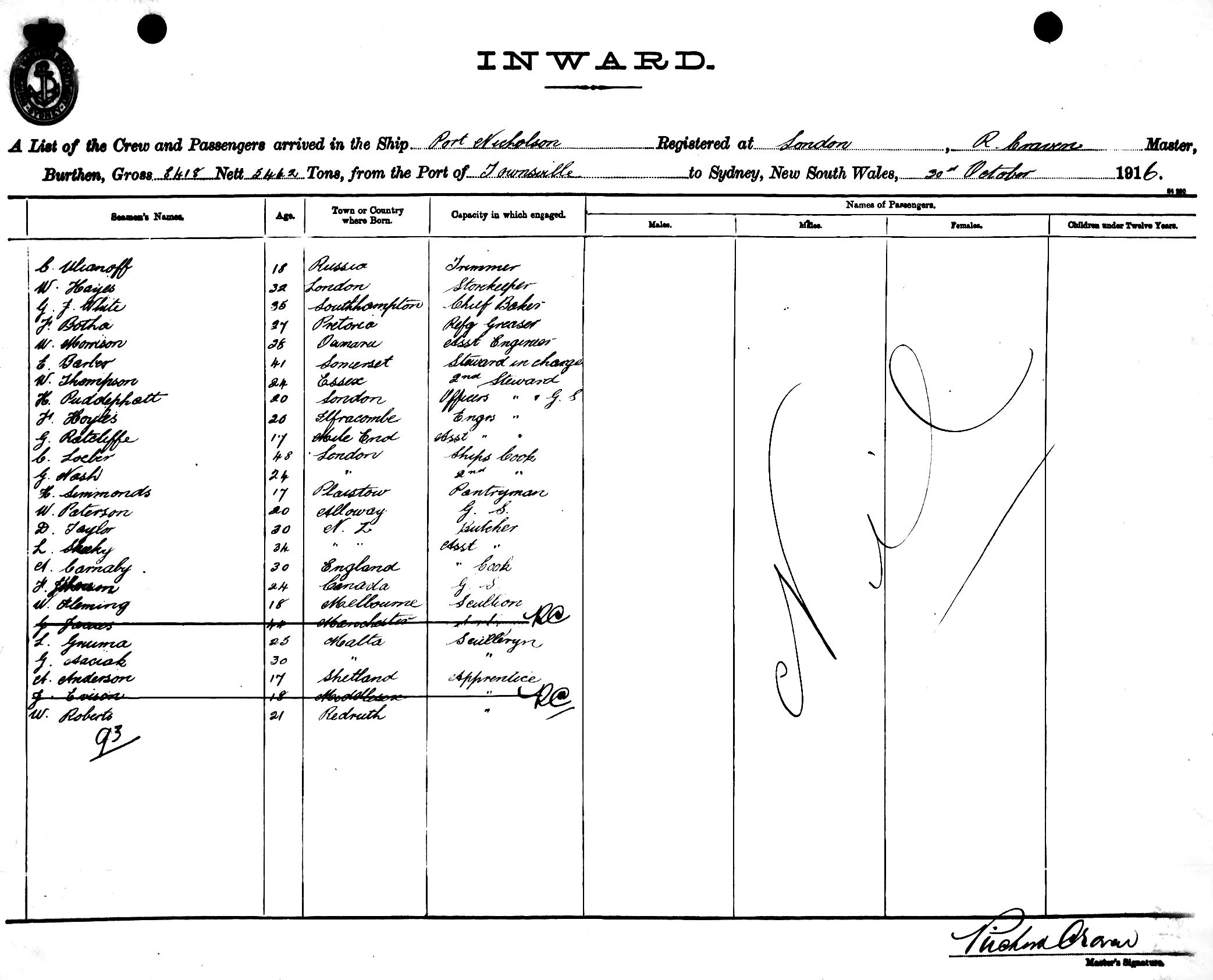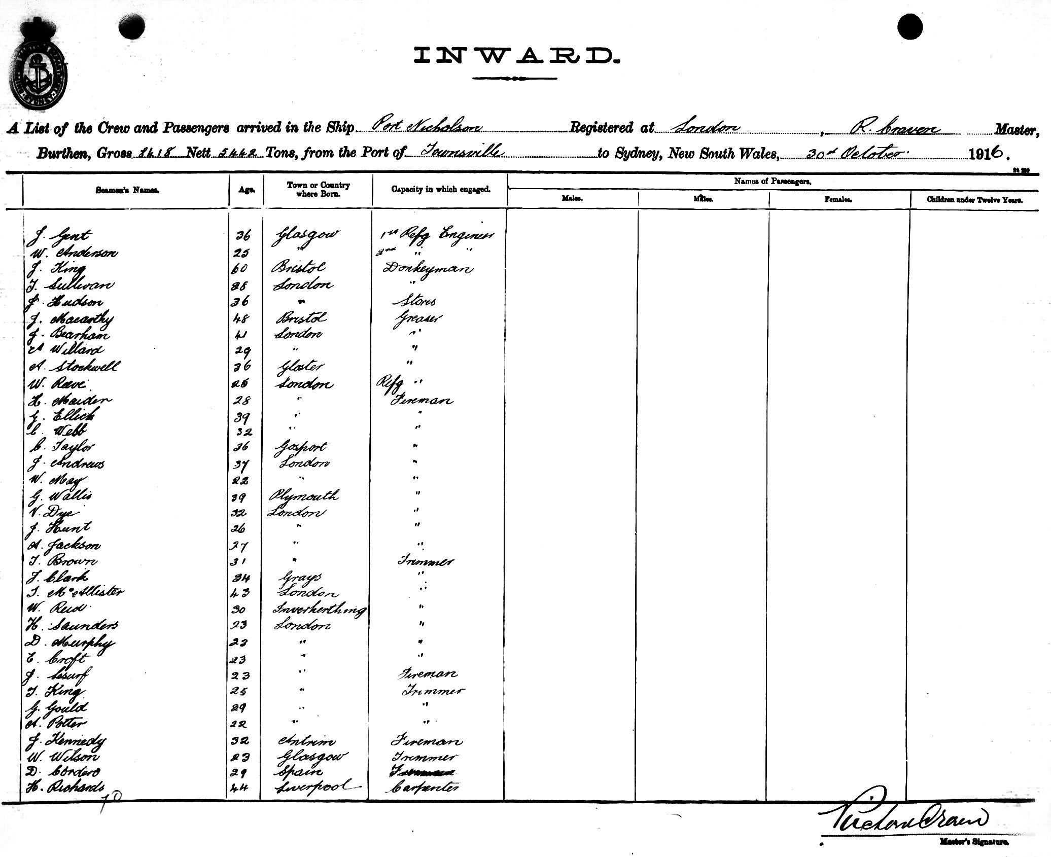 PORT NICHOLSONOF LONDON, R. CRAVEN, MASTER, BURTHEN 8418/5442 TONS FROM THE PORT OF TOWNSVILLE TO SYDNEY, NEW SOUTH WALES, 30TH OCTOBER 1916 |