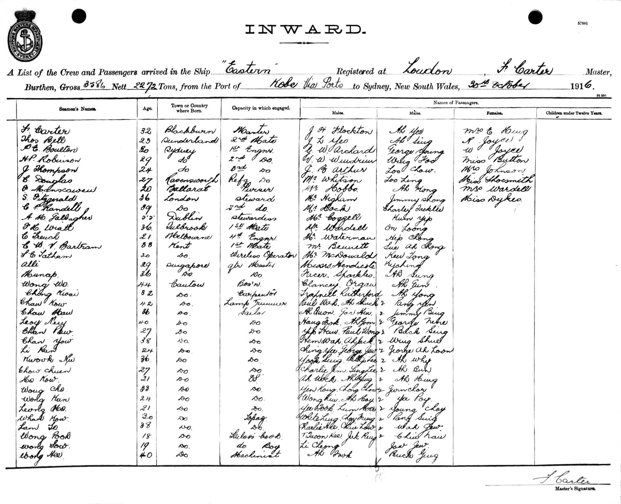 EASTERNOF LONDON, F. CARTER, MASTER, BURTHEN 3586/2272 TONS FROM THE PORT OF KOBE via PORTS TO SYDNEY, NEW SOUTH WALES, 30TH OCTOBER 1916 |